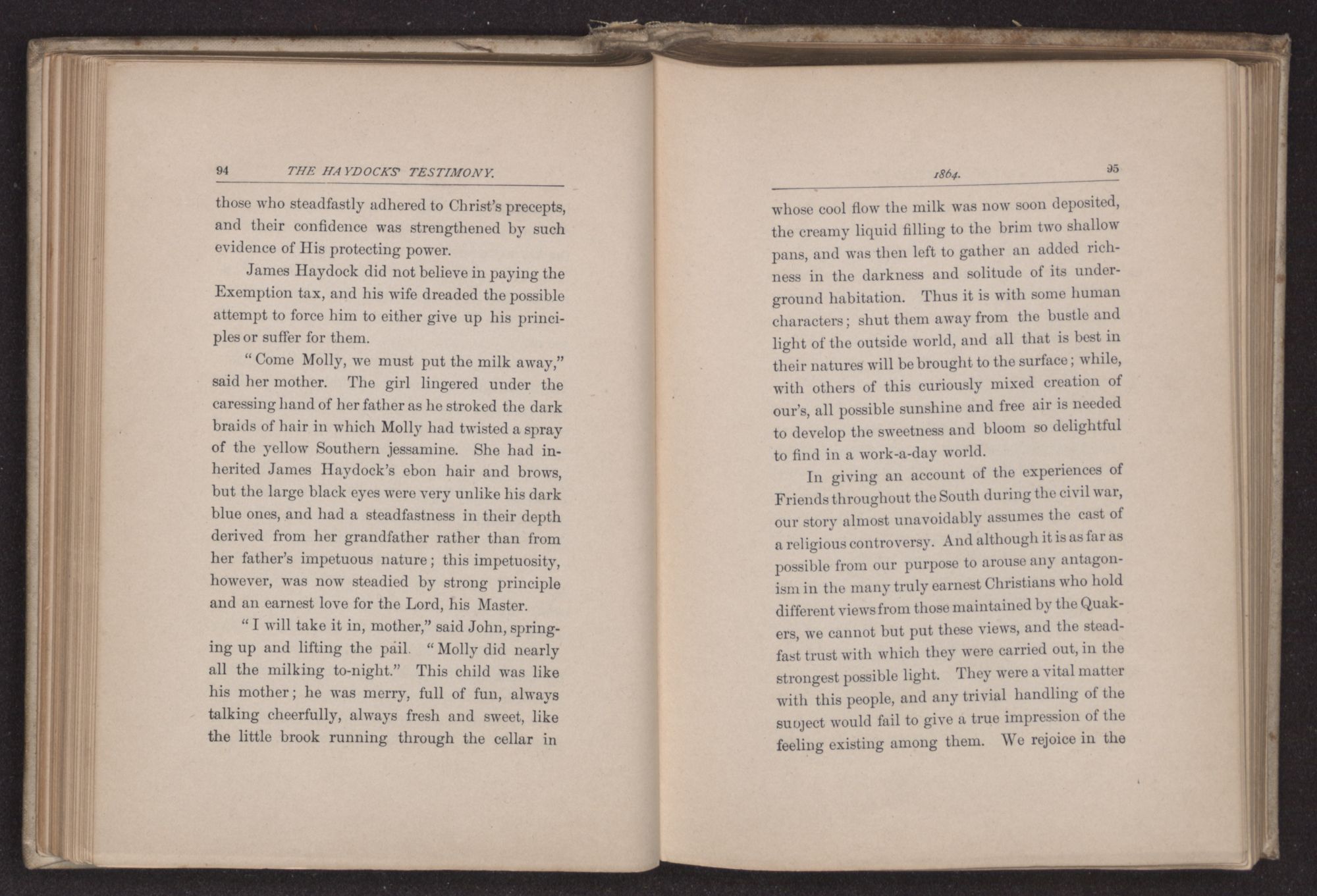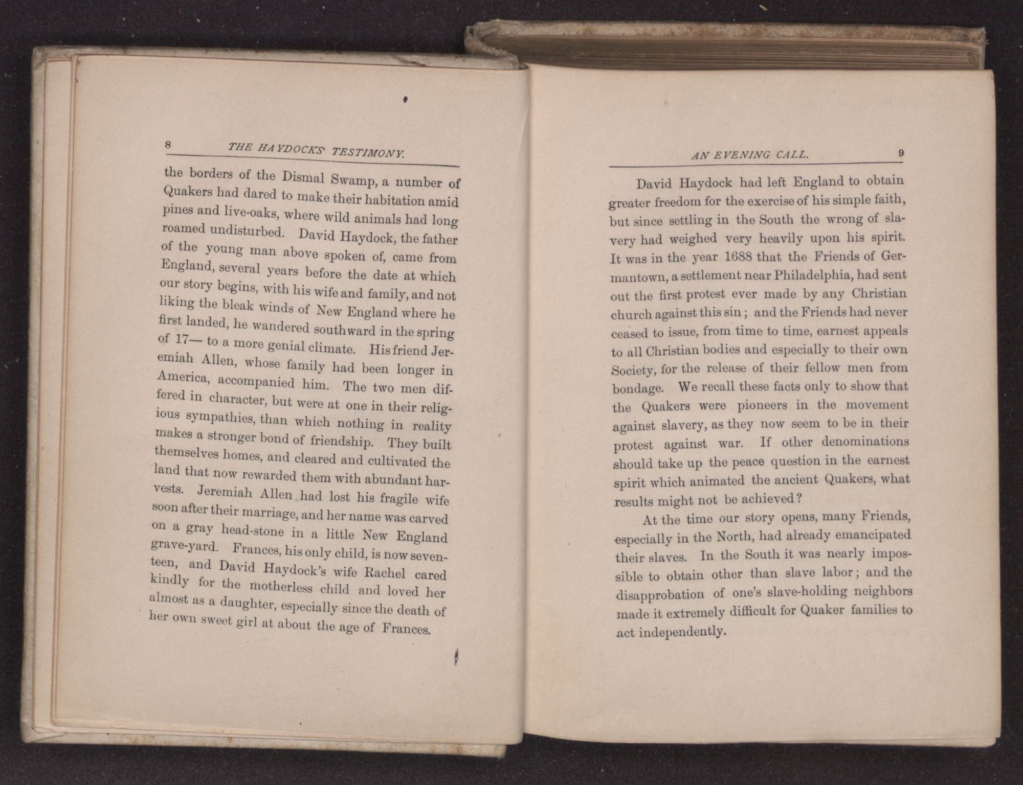 At the time our story opens, many Friends, especially in the North, had already emancipated their slaves. In the South it was nearly impossible to obtain other than slave labor; and the disapprobation of one's slave-holding neighbors made it extremely difficult for Quaker families to act independently.