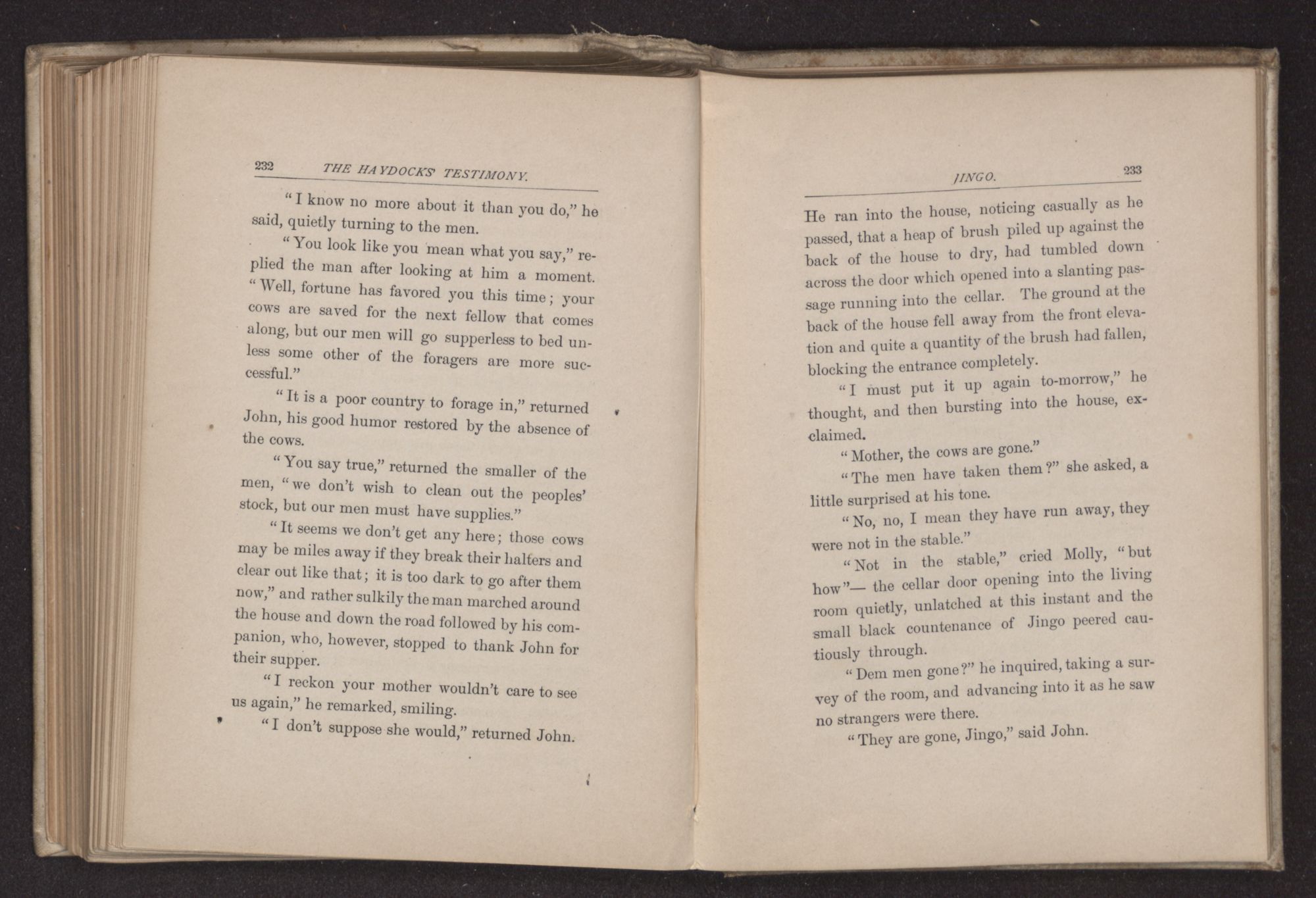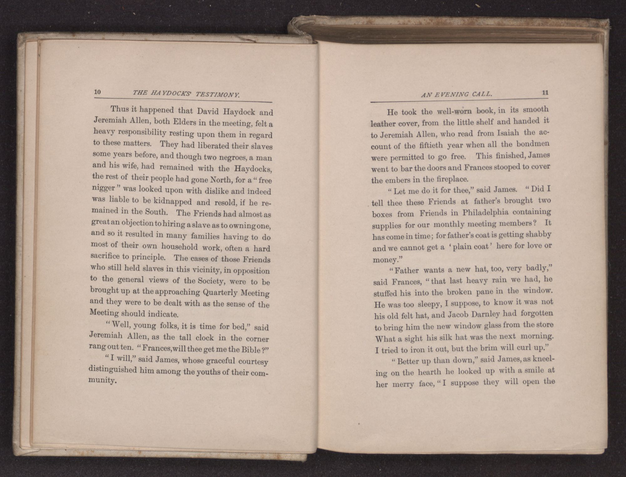 He took the well-worn book, in its smooth leather cover, from the little shelf and handed it to Jeremiah Allen, who read from Isaiah the account of the fiftieth year when all the bondmen were permitted to go free. This finished, James went to bar the doors and Frances stooped to cover the embers in the fireplace.