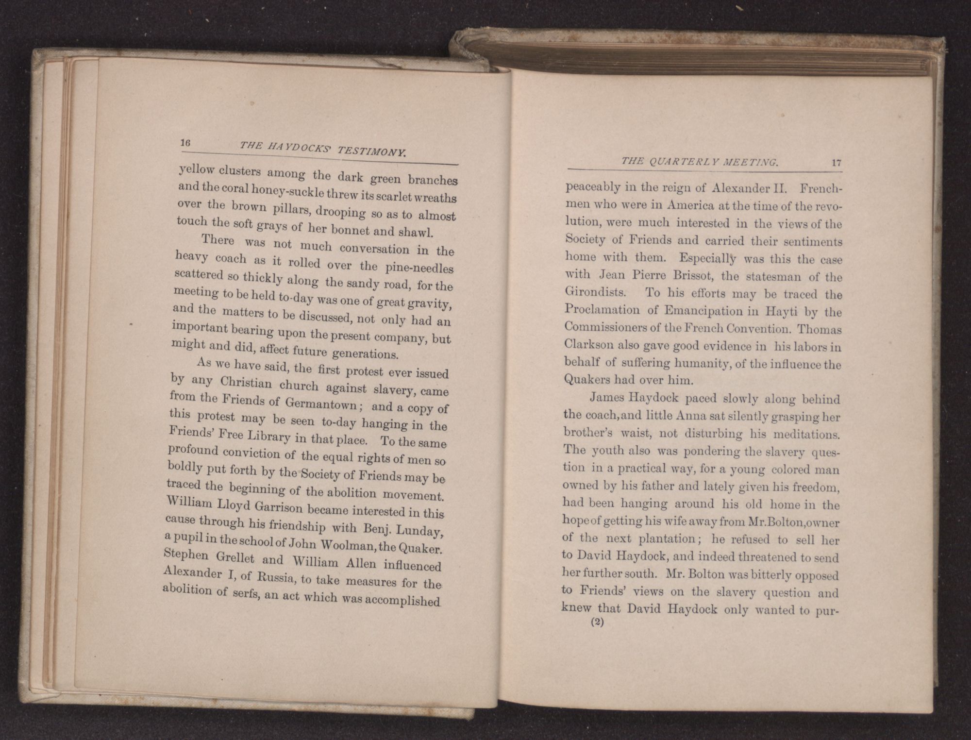 peaceably in the reign of Alexander II. Frenchmen who were in America at the time of the revolution, were much interested in the views of the Society of Friends and carried their sentiments home with them. Especially was this the case with Jean Pierre Brissot, the statesman of the Girondists. To his efforts may be traced the Proclamation of Emancipation in Hayti by the Commissioners of the French Convention. Thomas Clarkson also gave good evidence in his labors in behalf of suffering humanity, of the influence the Quakers had over him.