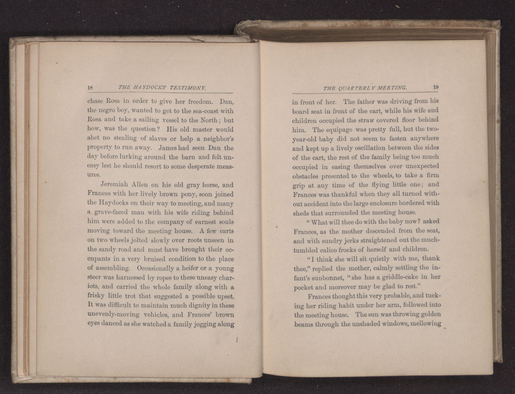 “What will thee do with the baby now? asked Frances, as the mother descended from the seat, and with sundry jerks straightened out the much-tumbled calico frocks of herself and children.