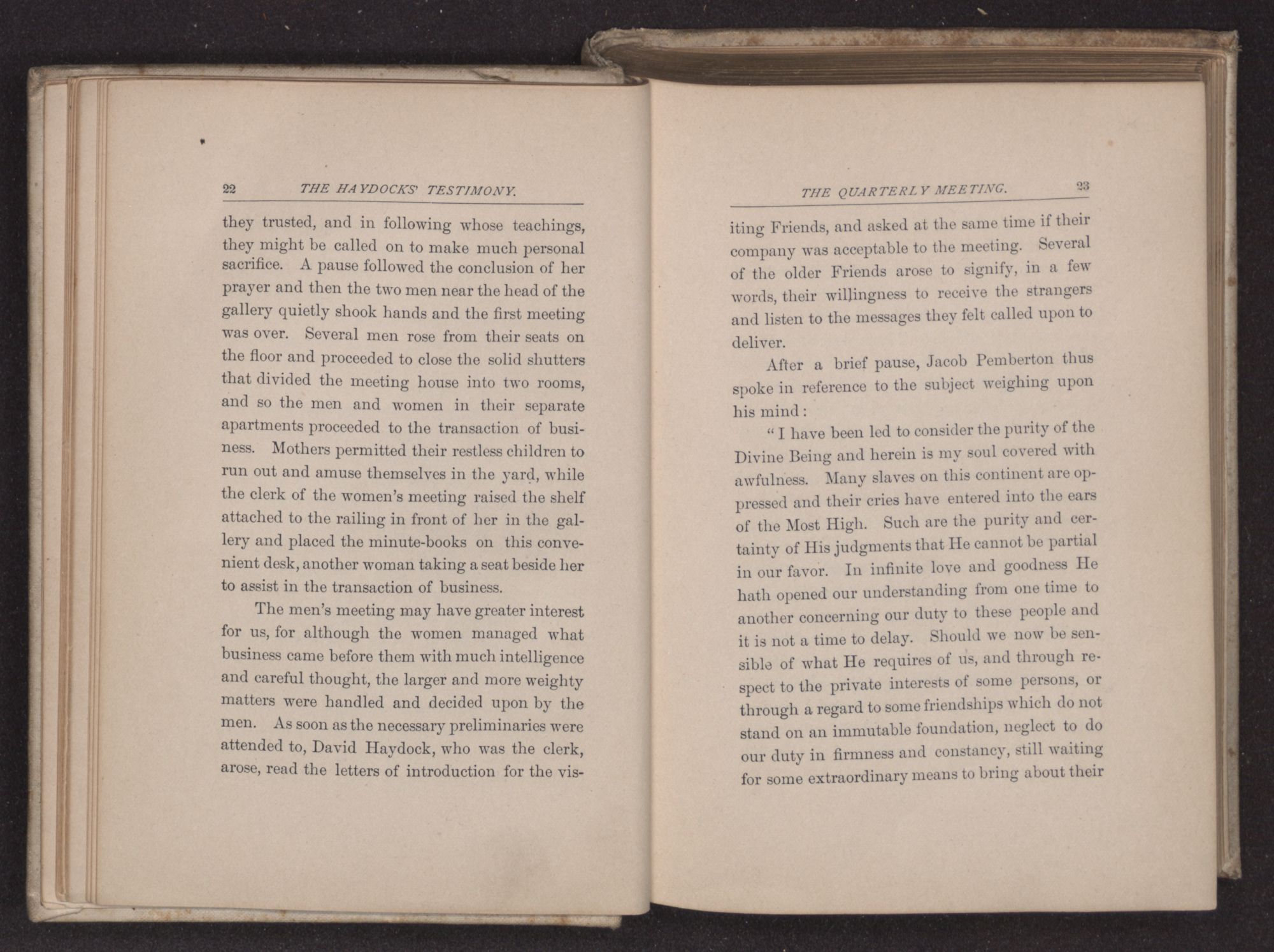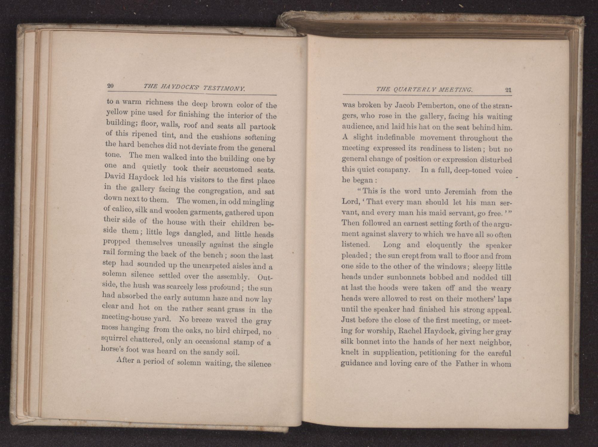 was broken by Jacob Pemberton, one of the strangers, who rose in the gallery, facing his waiting audience, and laid his hat on the seat behind him. A slight indefinable movement throughout the meeting expressed its readiness to listen; but no general change of position or expression disturbed this quiet company. In a full, deep-toned voice he began: