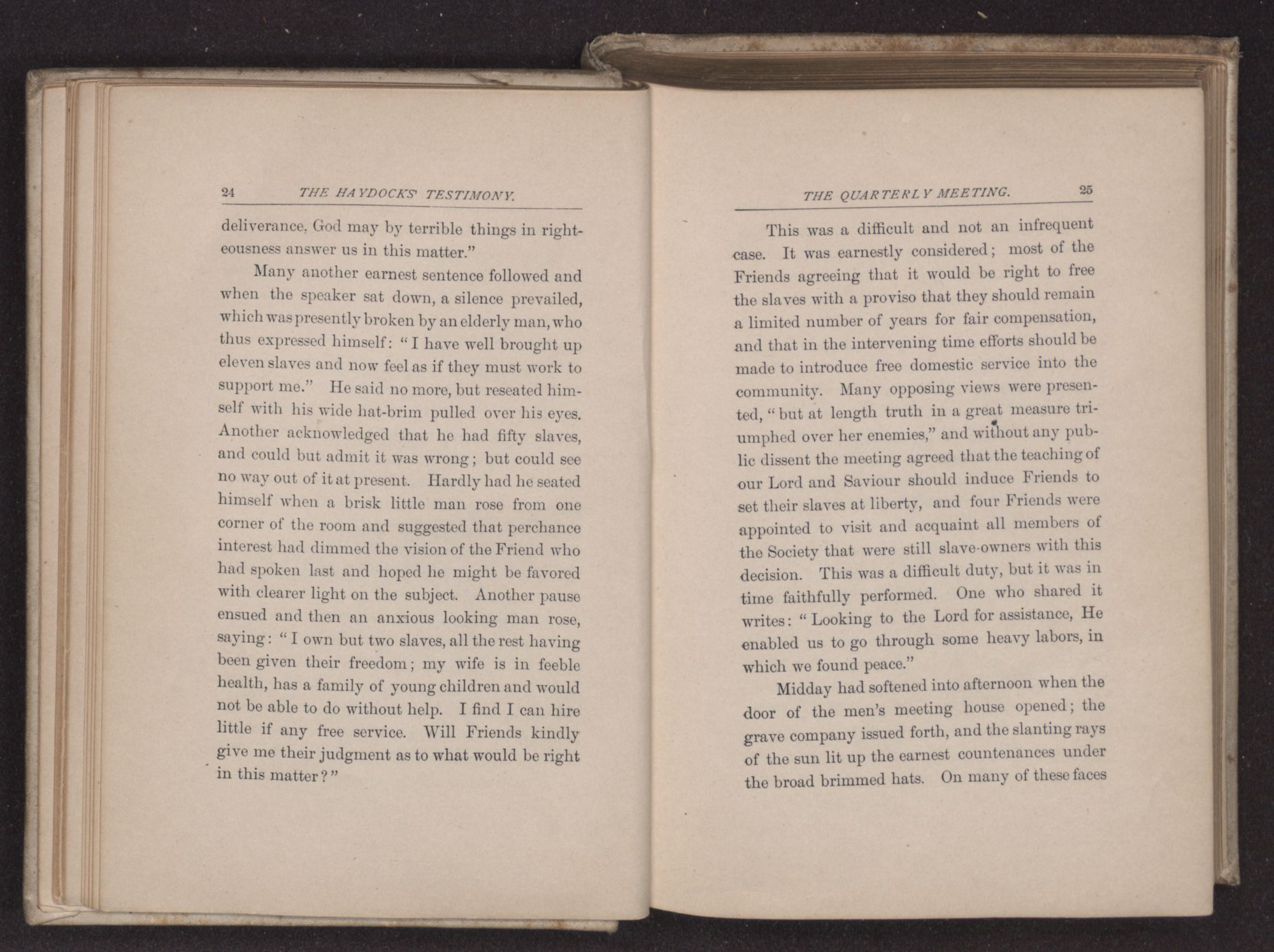 Many another earnest sentence followed and when the speaker sat down, a silence prevailed, which was presently broken by an elderly man, who thus expressed himself: “I have well brought up eleven slaves and now feel as if they must work to support me.” He said no more, but reseated himself with his wide hat-brim pulled over his eyes. Another acknowledged that he had fifty slaves, and could but admit it was wrong; but could see no way out of it at present. Hardly had he seated himself when a brisk little man rose from one corner of the room and suggested that perchance interest had dimmed the vision of the Friend who had spoken last and hoped he might be favored with clearer light on the subject. Another pause ensued and then an anxious looking man rose, saying: “I own but two slaves, all the rest having been given their freedom; my wife is in feeble health, has a family of young children and would not be able to do without help. I find I can hire little if any free service. Will Friends kindly give me their judgment as to what would be right in this matter?”