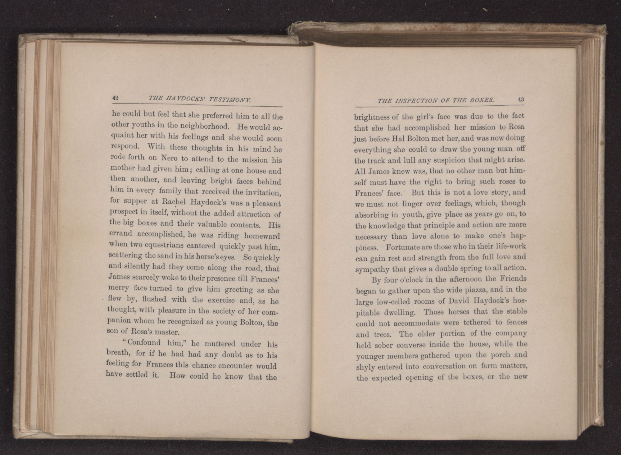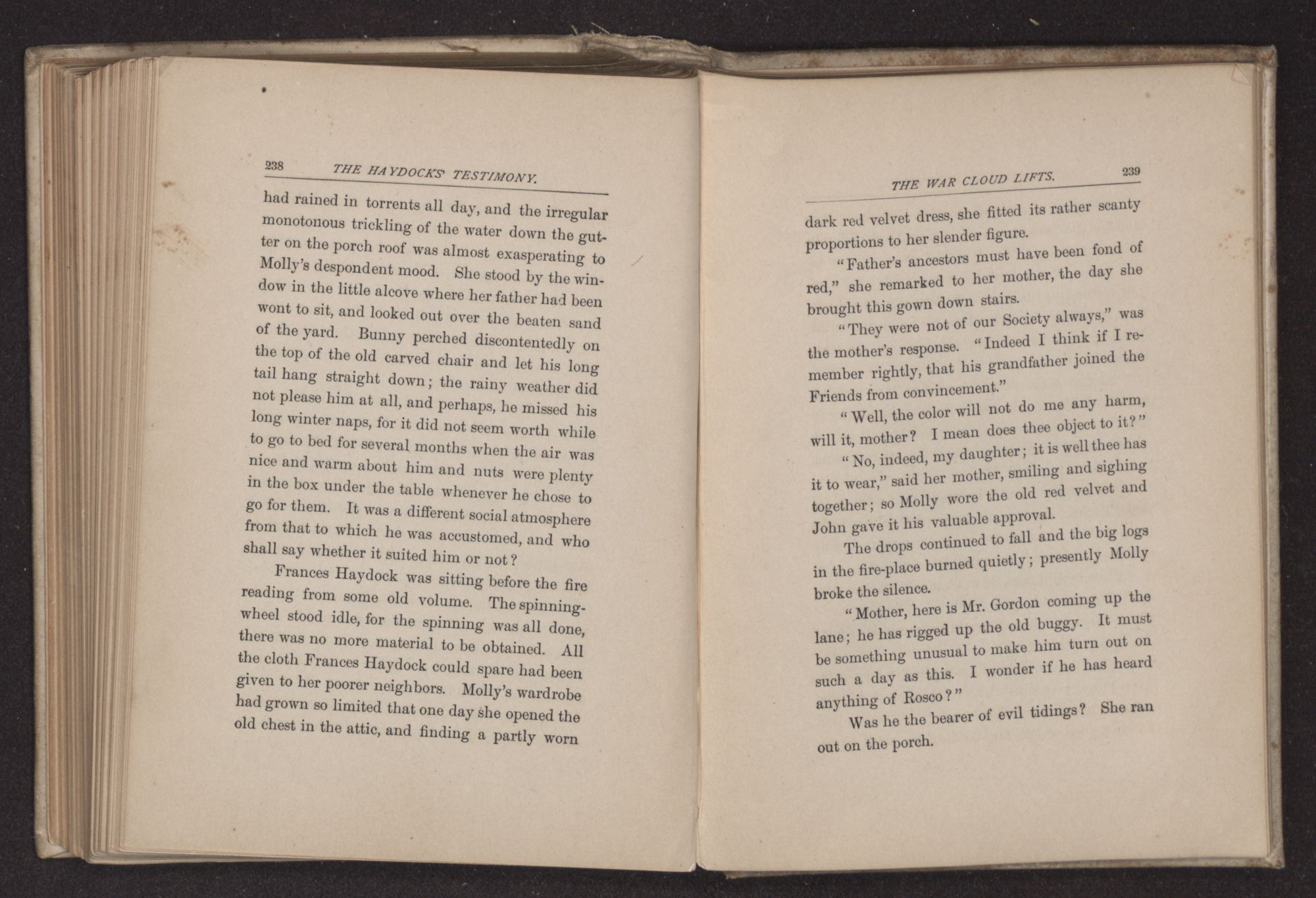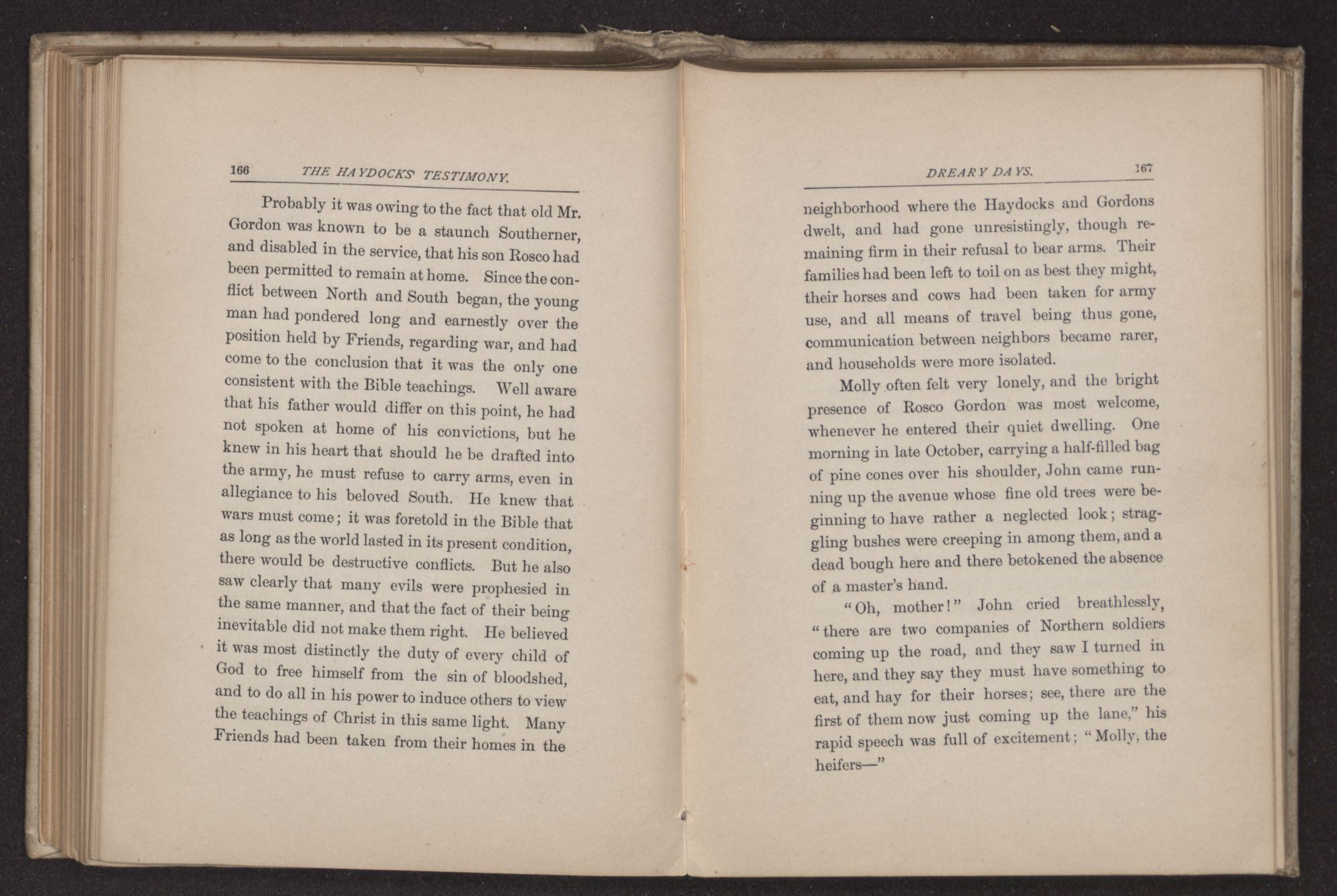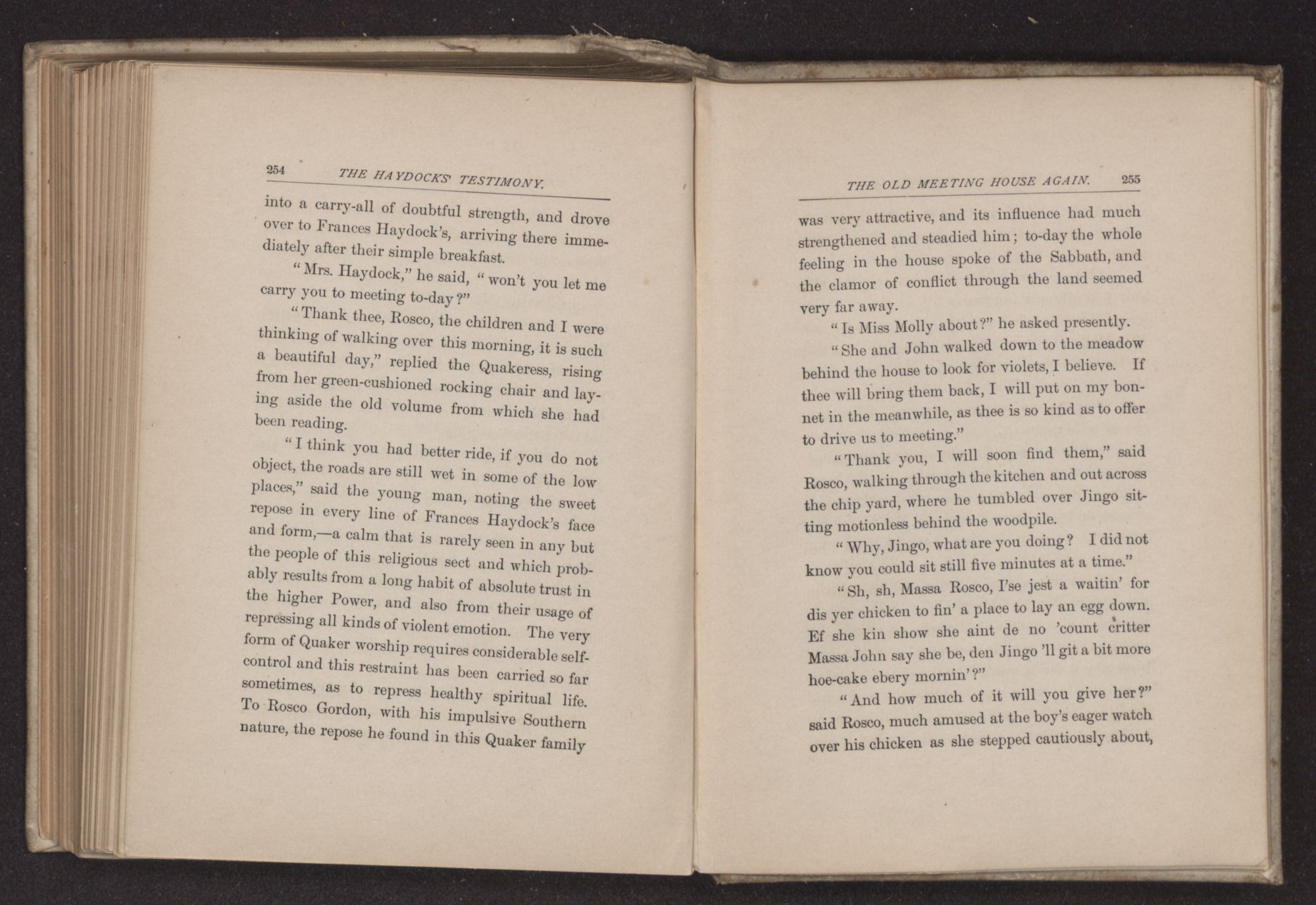 “I think you had better ride, if you do not object, the roads are still wet in some of the low places,” said the young man, noting the sweet repose in every line of Frances Haydock's face and form,—a calm that is rarely seen in any but the people of this religious sect and which probably results from a long habit of absolute trust in the higher Power, and also from their usage of repressing all kinds of violent emotion. The very form of Quaker worship requires considerable self-control and this restraint has been carried so far sometimes, as to repress healthy spiritual life. To Rosco Gordon, with his impulsive Southern nature, the repose he found in this Quaker family