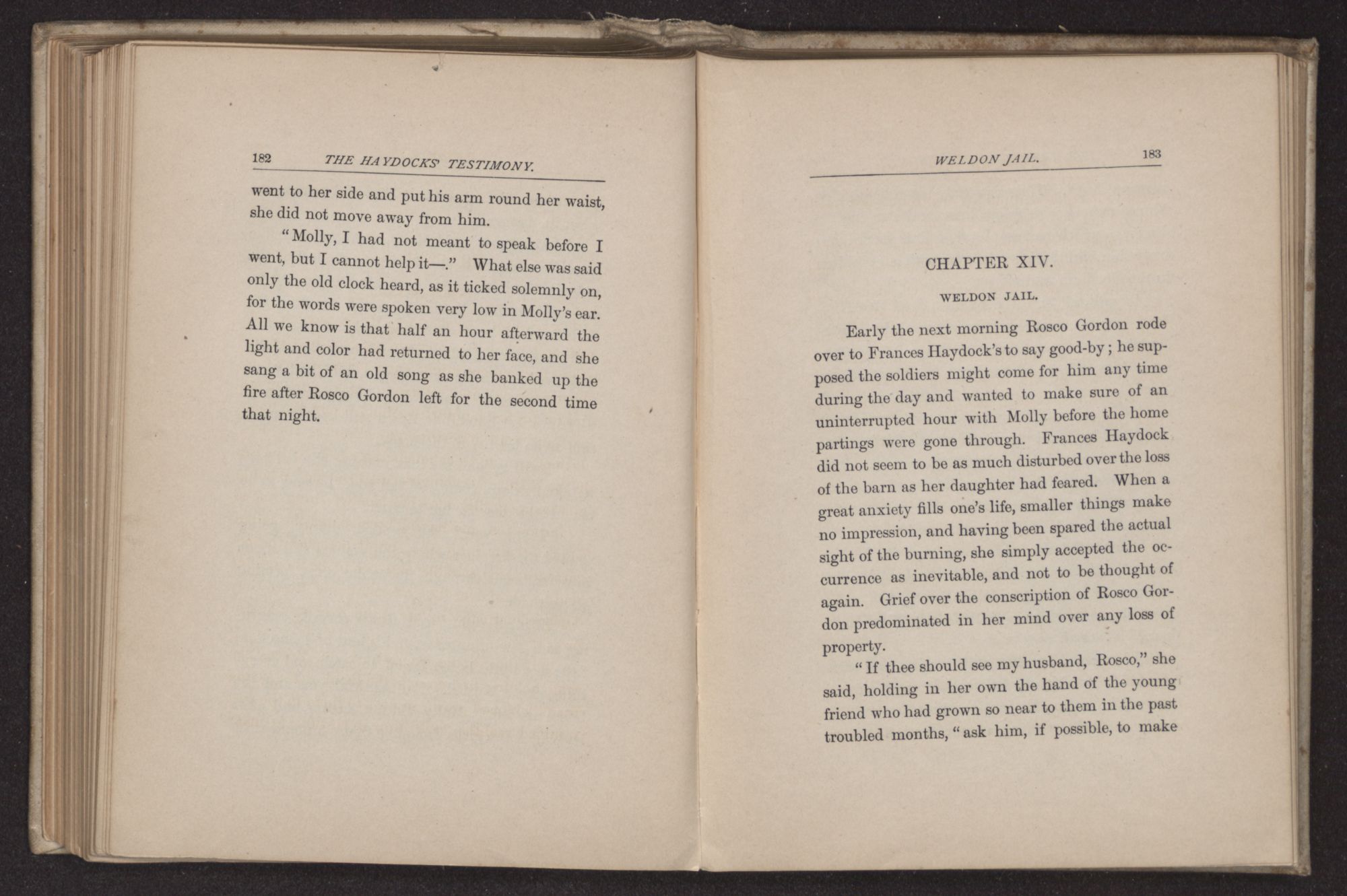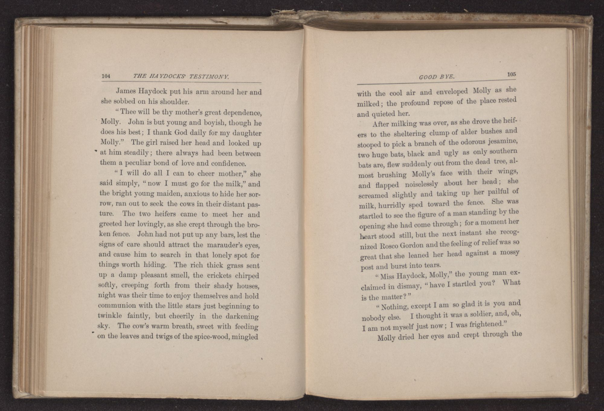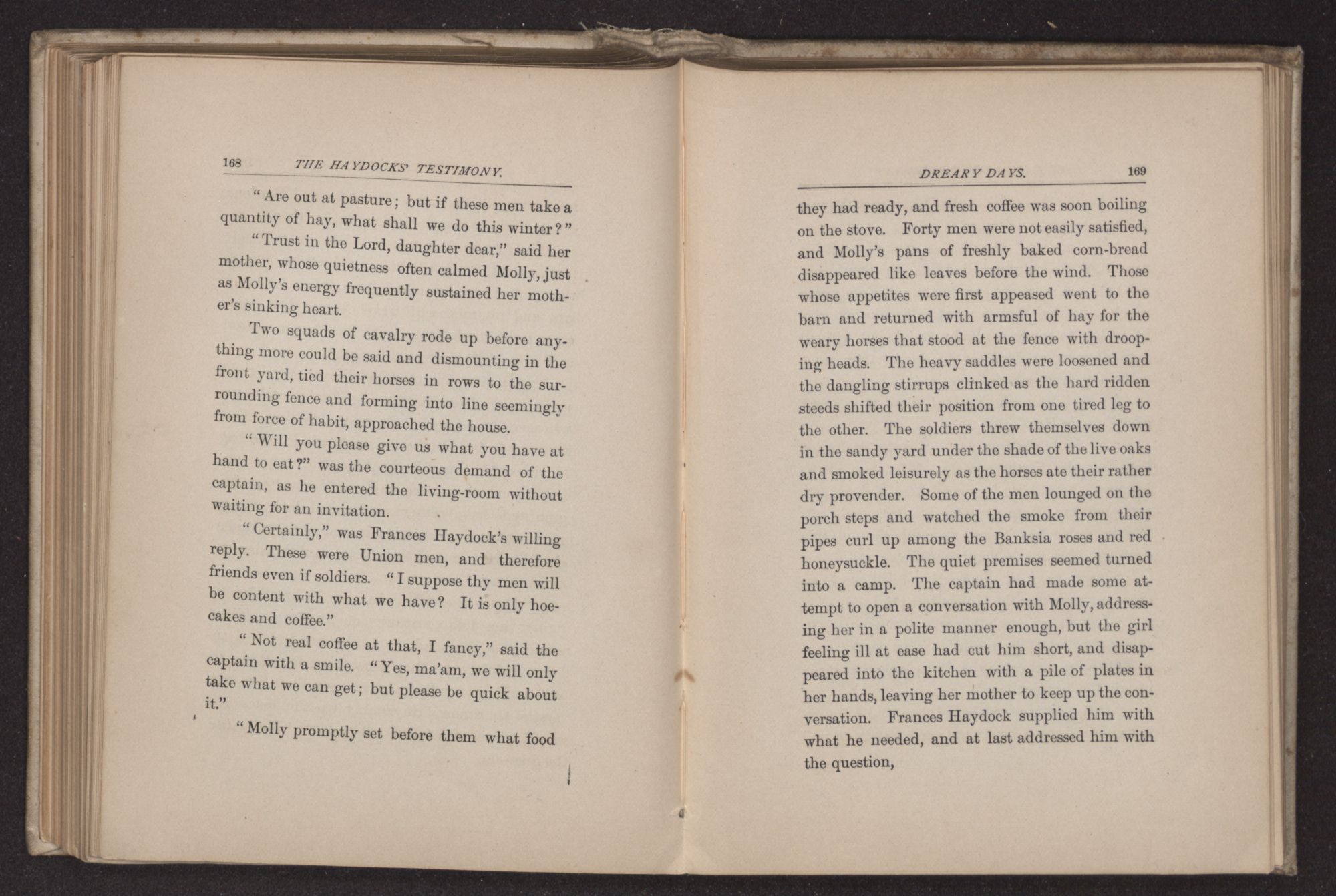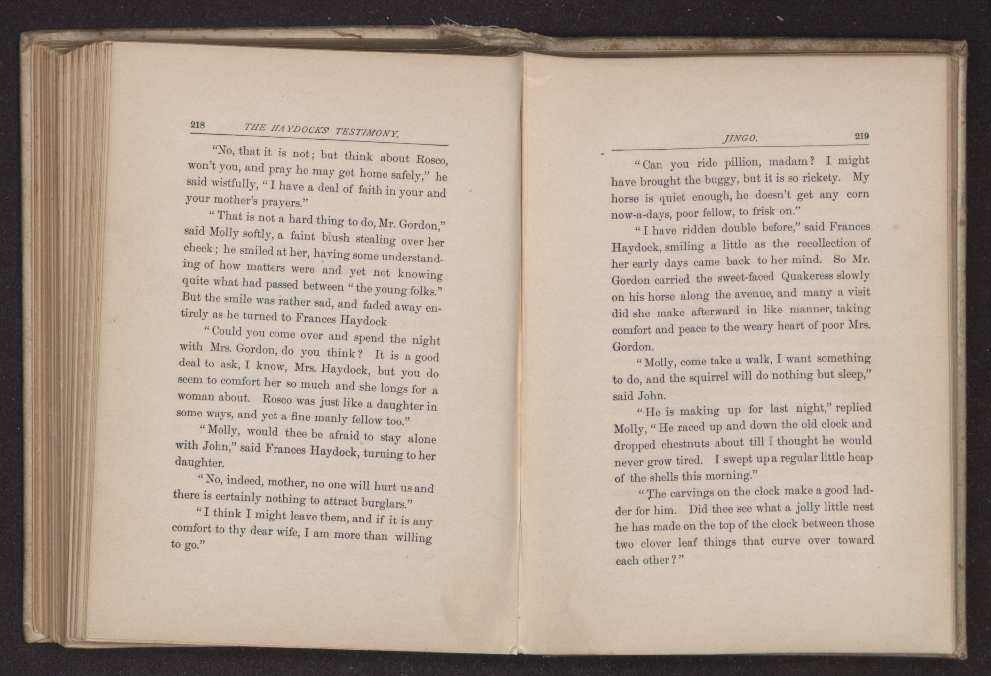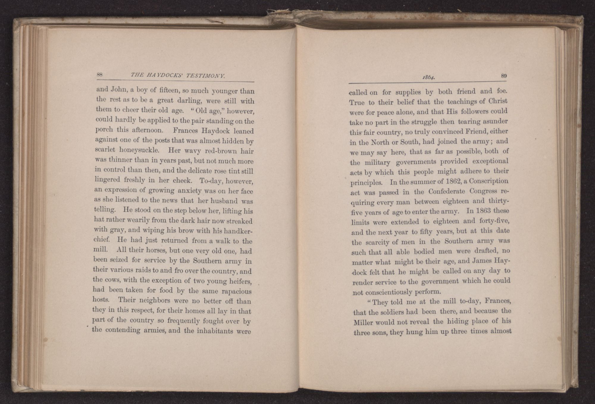 “I think you had better ride, if you do not object, the roads are still wet in some of the low places,” said the young man, noting the sweet repose in every line of Frances Haydock's face and form,—a calm that is rarely seen in any but the people of this religious sect and which probably results from a long habit of absolute trust in the higher Power, and also from their usage of repressing all kinds of violent emotion. The very form of Quaker worship requires considerable self-control and this restraint has been carried so far sometimes, as to repress healthy spiritual life. To Rosco Gordon, with his impulsive Southern nature, the repose he found in this Quaker family