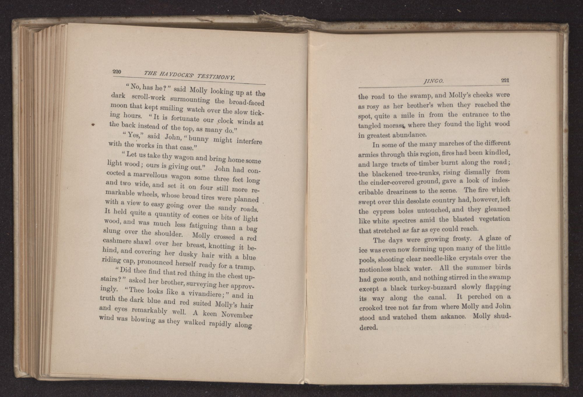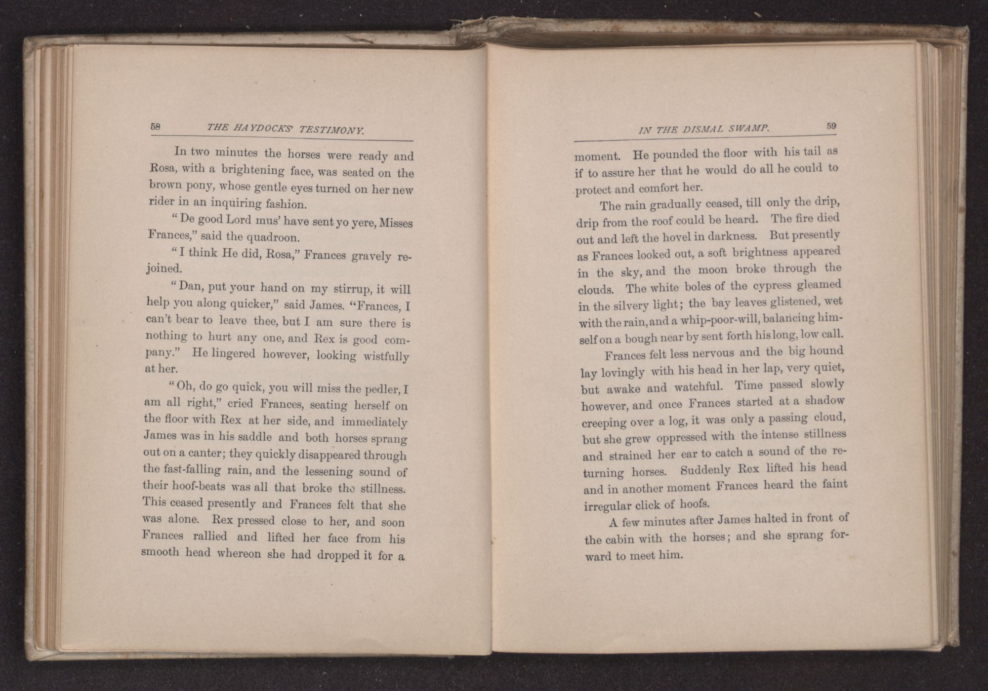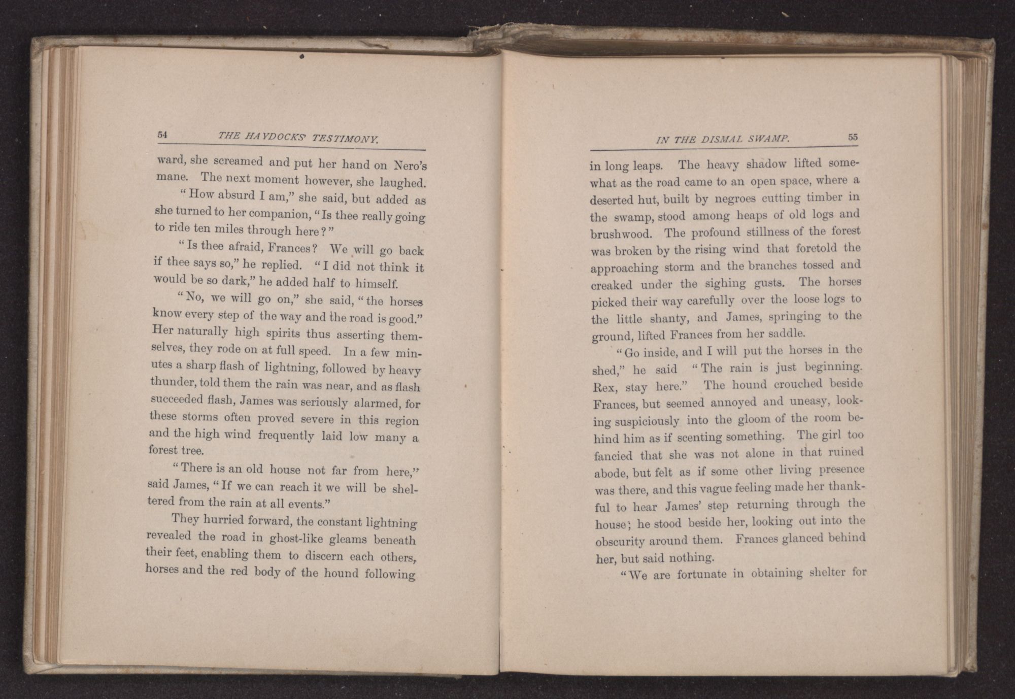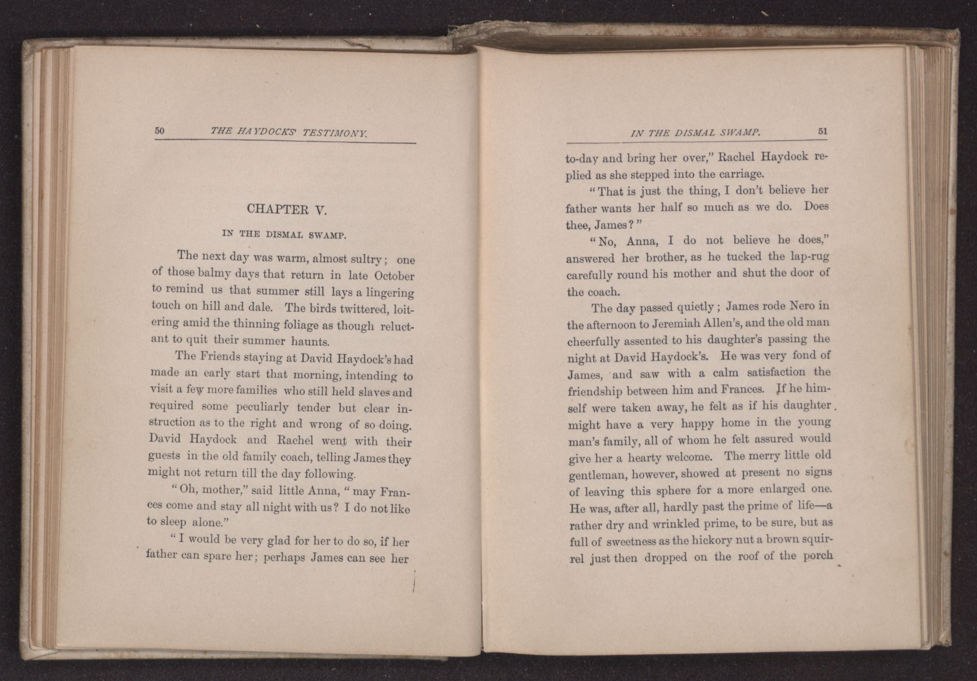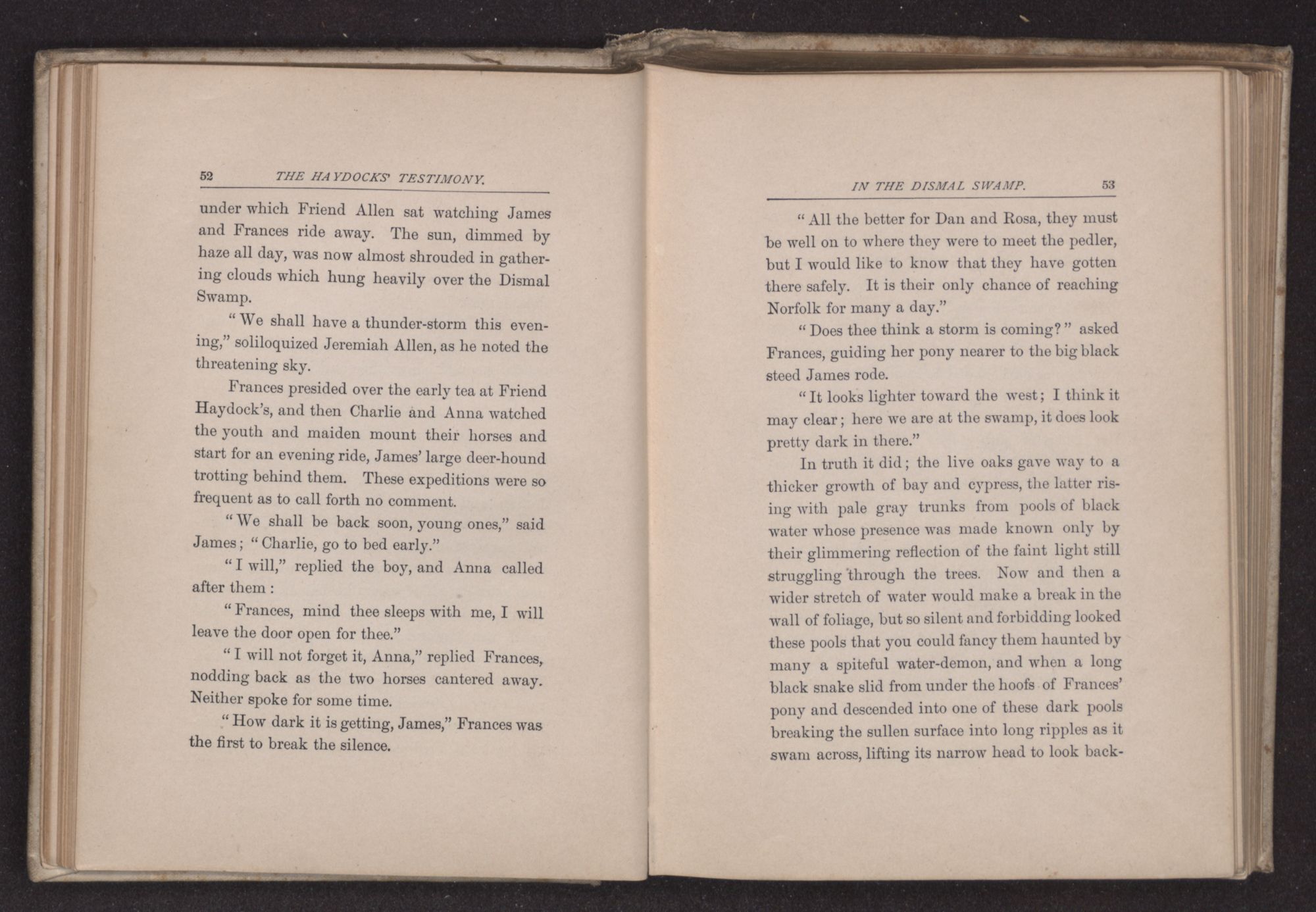 the borders of the Dismal Swamp, a number of Quakers had dared to make their habitation amid pines and live-oaks, where wild animals had long roamed undisturbed. David Haydock, the father of the young man above spoken of, came from England, several years before the date at which our story begins, with his wife and family, and not liking the bleak winds of New England where he first landed, he wandered southward in the spring of 17— to a more genial climate. His friend Jeremiah Allen, whose family had been longer in America, accompanied him. The two men differed in character, but were at one in their religious sympathies, than which nothing in reality makes a stronger bond of friendship. They built themselves homes, and cleared and cultivated the land that now rewarded them with abundant harvests. Jeremiah Allen had lost his fragile wife soon after their marriage, and her name was carved on a gray head-stone in a little New England grave-yard. Frances, his only child, is now seventeen, and David Haydock's wife Rachel cared kindly for the motherless child and loved her almost as a daughter, especially since the death of her own sweet girl at about the age of Frances.