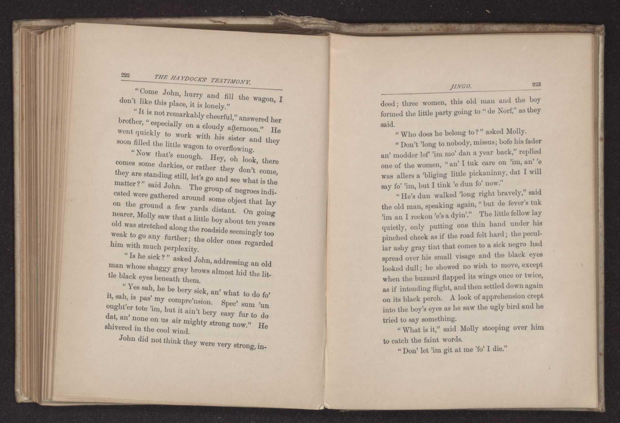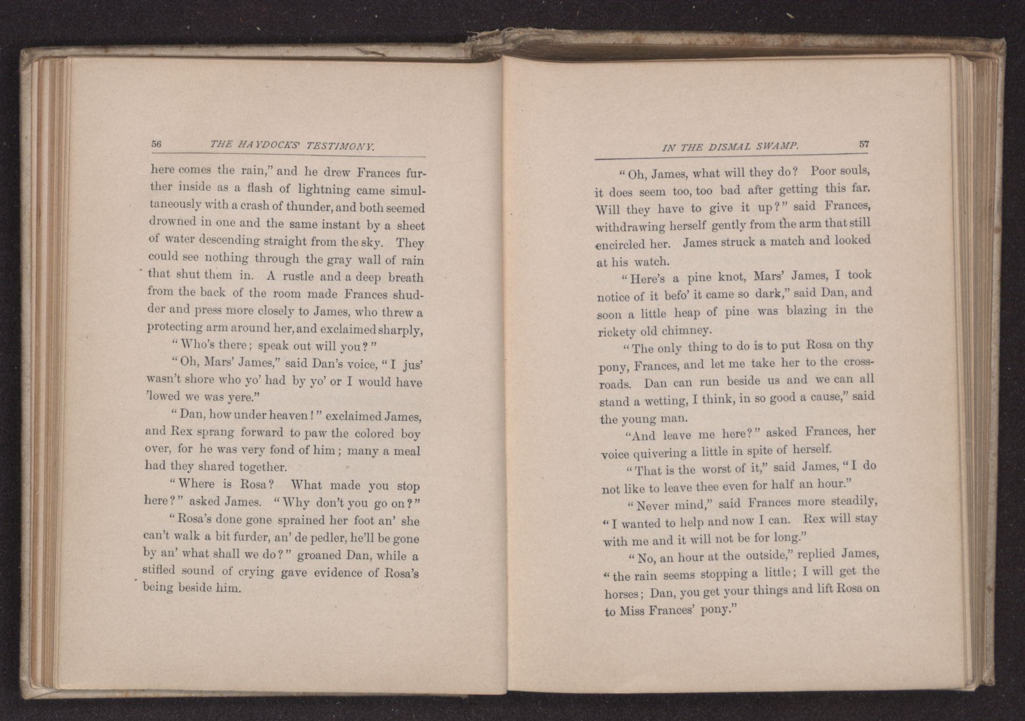 “Mars’ James, oh, do tell me what to do! Mars’ Bolton dun say he gwine sell Rosa down Souf nex’ week. I seed Rosa dis ebening. We mus’ get off to de swamp or some whar befo’ dat. When Mars’ Pemberton go ’way?”