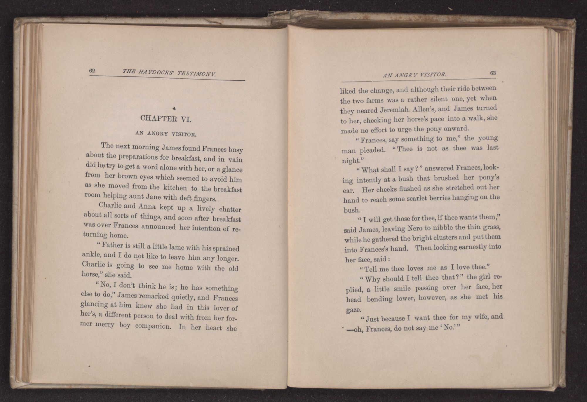 “If there is nothing, I will ask mother to send for what thee wants,” said James, rising from the hearth and picking up the berries Frances had dropped from her belt, “Would this color do?”