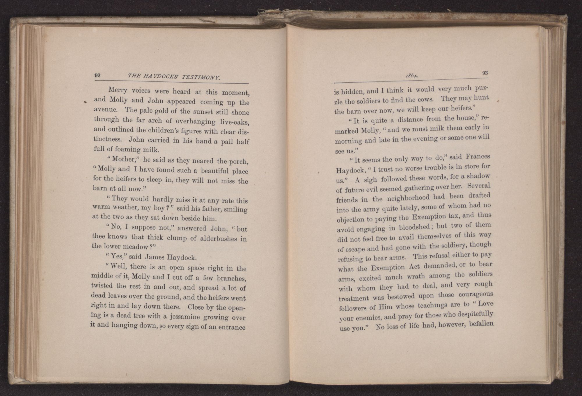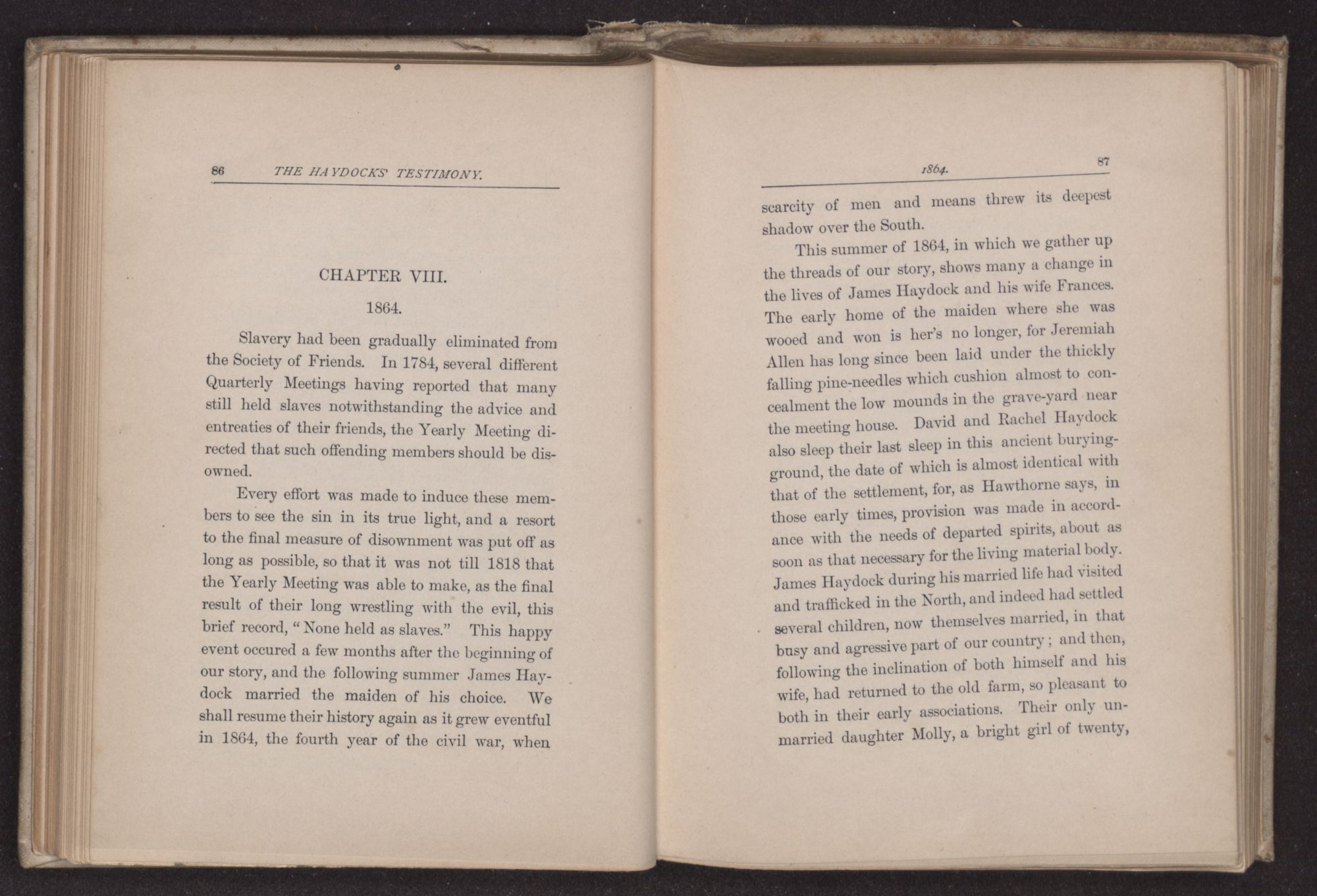 Thus it happened that David Haydock and Jeremiah Allen, both Elders in the meeting, felt a heavy responsibility resting upon them in regard to these matters. They had liberated their slaves some years before, and though two negroes, a man and his wife, had remained with the Haydocks, the rest of their people had gone North, for a “free nigger” was looked upon with dislike and indeed was liable to be kidnapped and resold, if he remained in the South. The Friends had almost as great an objection to hiring a slave as to owning one, and so it resulted in many families having to do most of their own household work, often a hard sacrifice to principle. The cases of those Friends who still held slaves in this vicinity, in opposition to the general views of the Society, were to be brought up at the approaching Quarterly Meeting and they were to be dealt with as the sense of the Meeting should indicate.