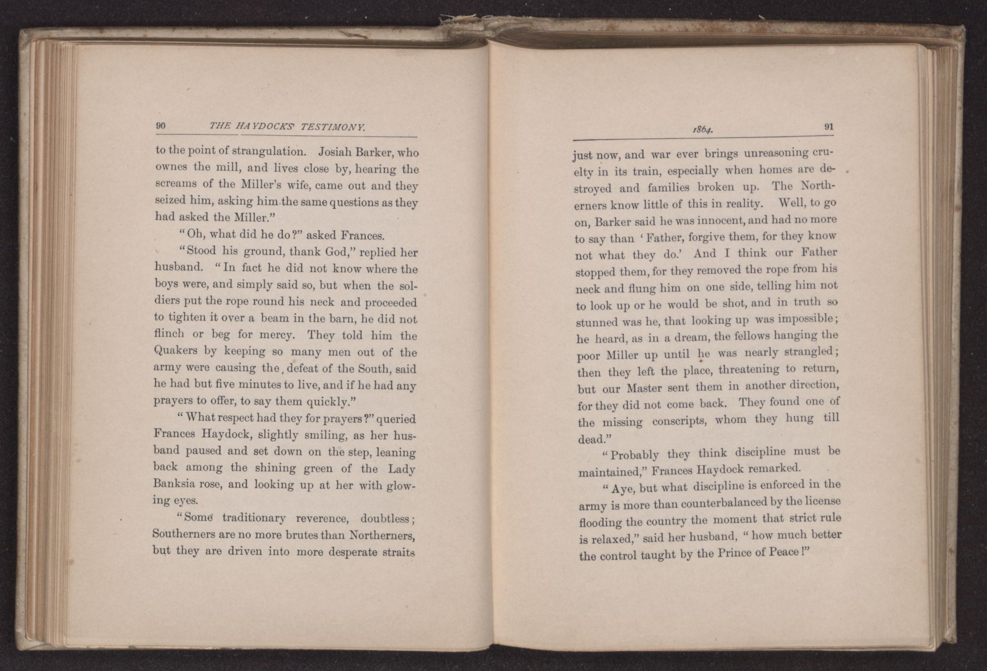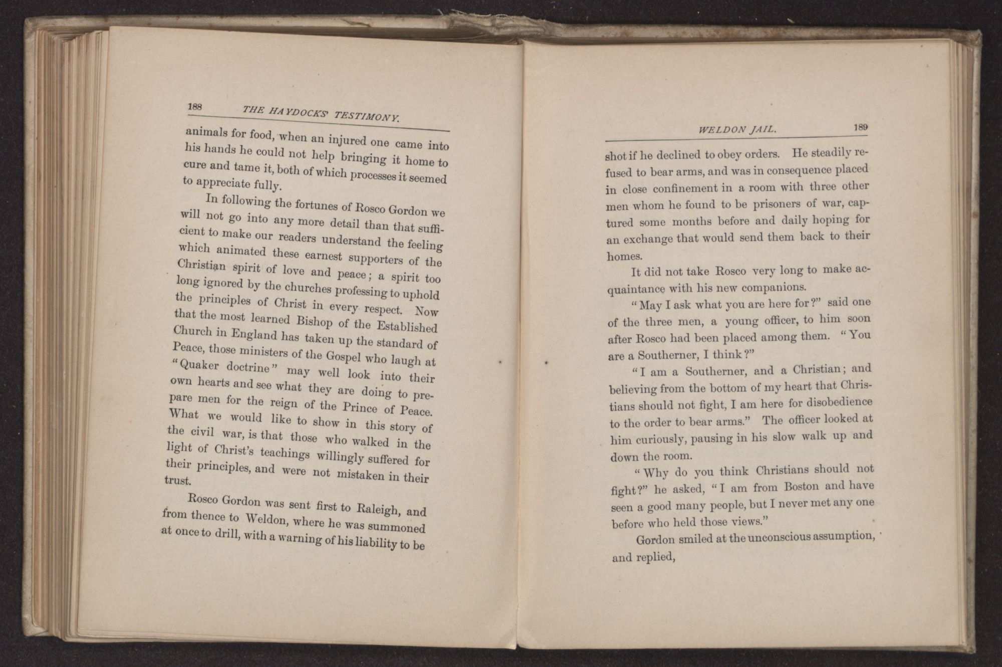In the Spring of 1862, two brothers, N. M. H. and J. D. H. were drafted, arrested and taken to Raleigh. Refusing to bear arms they were kept in close confinement, and deprived of food and drink for four and a half days. They were so patient and gentle that ministers of different denominations came and encouraged them to be faithful. J. D. H. was taken before Gen. D—, who said he would not require him to bear arms, but would set him in front of the battle to stop bullets. They bound heavy logs of wood on his shoulders and marched him about till exhausted, when he was returned to jail. His brother N. M. H. had been enduring a different punishment. Three times they suspended him by his thumbs till his toes barely touched the ground, and kept him in this excruciating position nearly two hours each time. They next tried the bayonet; the orders were to thrust them four inches deep, but though much scarred and pierced it was not done as deeply as they had threatened. One of the men, after thus wounding him, came back to entreat his forgiveness. In the various changes of the next four months some kindness was shown them, but also much cruelty. It was not till seven months had been passed in these fiery ordeals that their release was obtained; another friend thinking