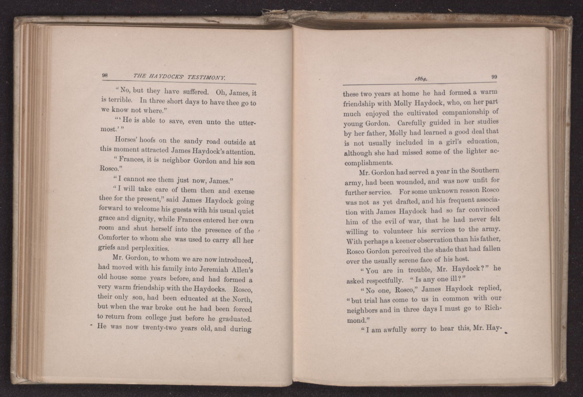James Haydock and Rosco Gordon had ridden one bright spring morning in April, to the nearest official station, hoping to obtain more definite news than they had yet received concerning the ratification of peace between the long contending sections of the country. The troops now nearest them were of the Federal army, but the Confederates were not very distant, and at any time the tide of battle might roll in one furious destructive wave over their defenceless homes. Arriving at the quarters, they were struck with the expression on the face of the officer in charge, as he read a brief dispatch just handed him. James Haydock approached, asking,
