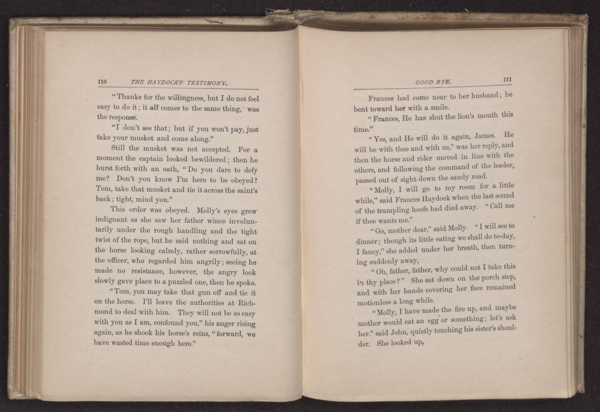 “It is hard for families like that,” she said to herself, as she walked to her own little pony. Her father was still talking to the visiting Friends and the Haydocks. Frances wondered why James did not come as usual to assist her in mounting, but the young man having been keenly interested in the day's proceedings, and also much attracted toward Jacob Pemberton, had lingered to listen to what they were still saying. Frances felt a little provoked at his forgetfulness and going to her father, touched his arm, “Father, the sun is nearly down, shall we go?”