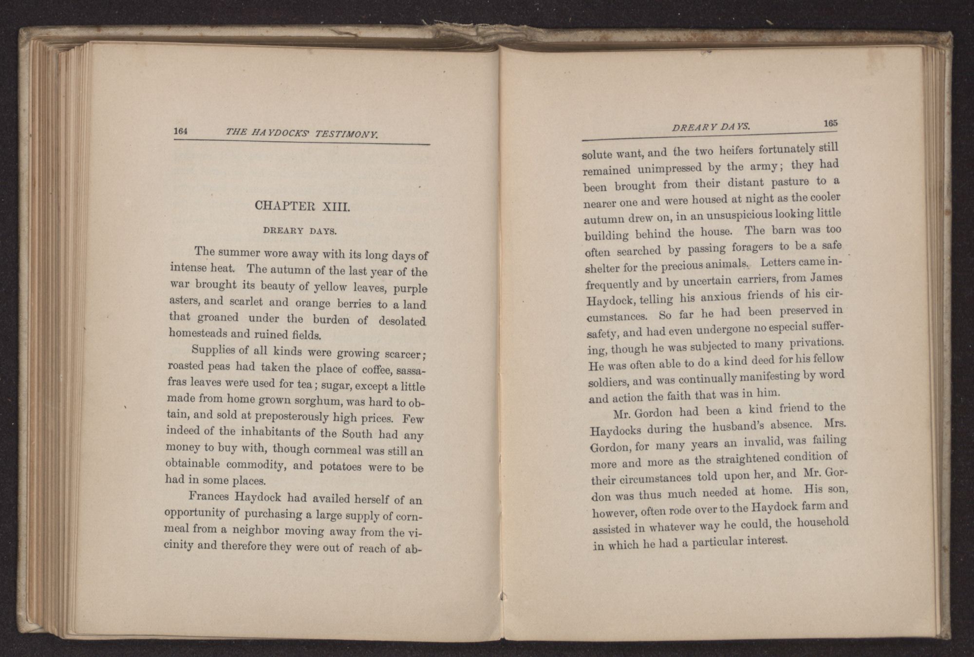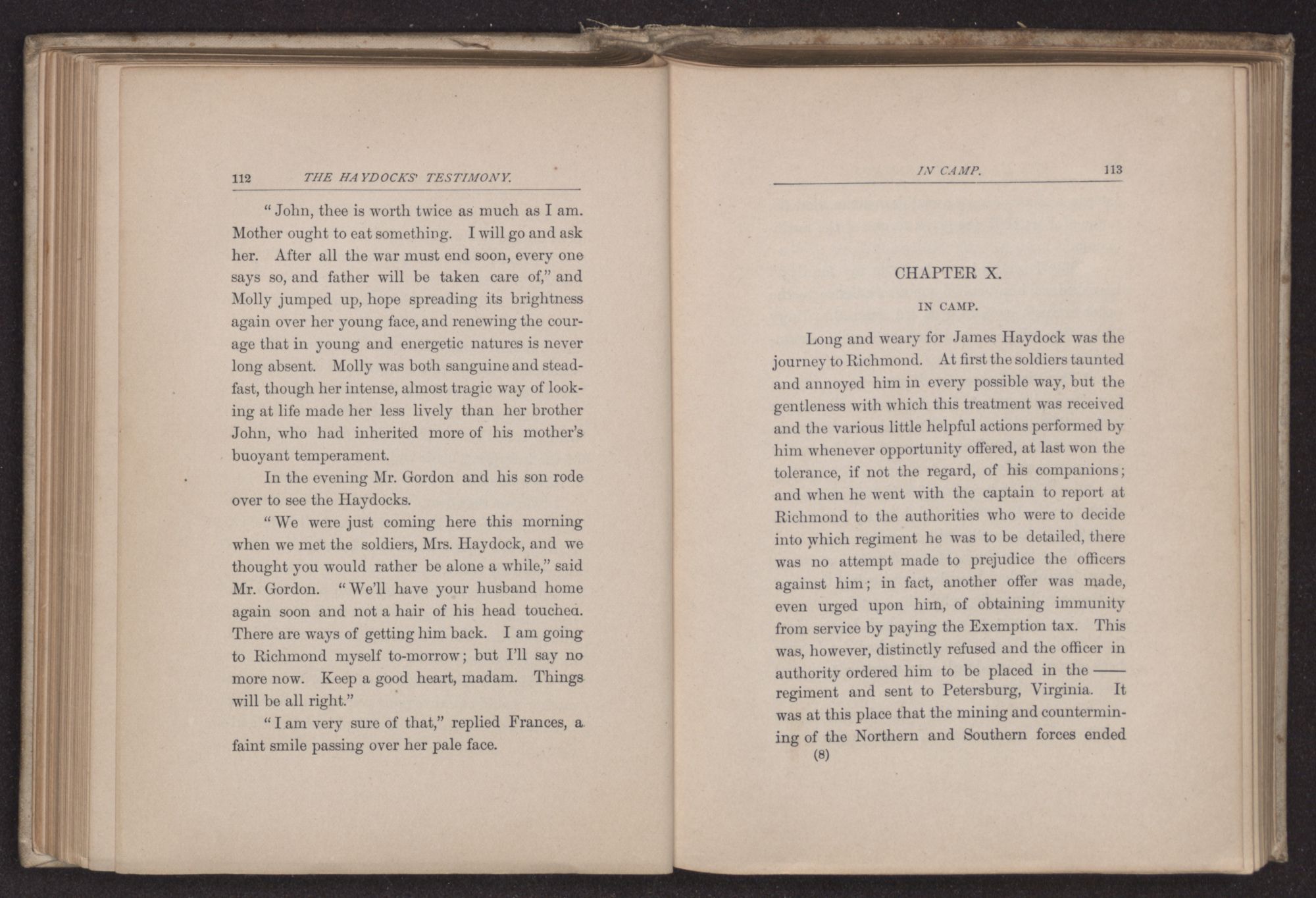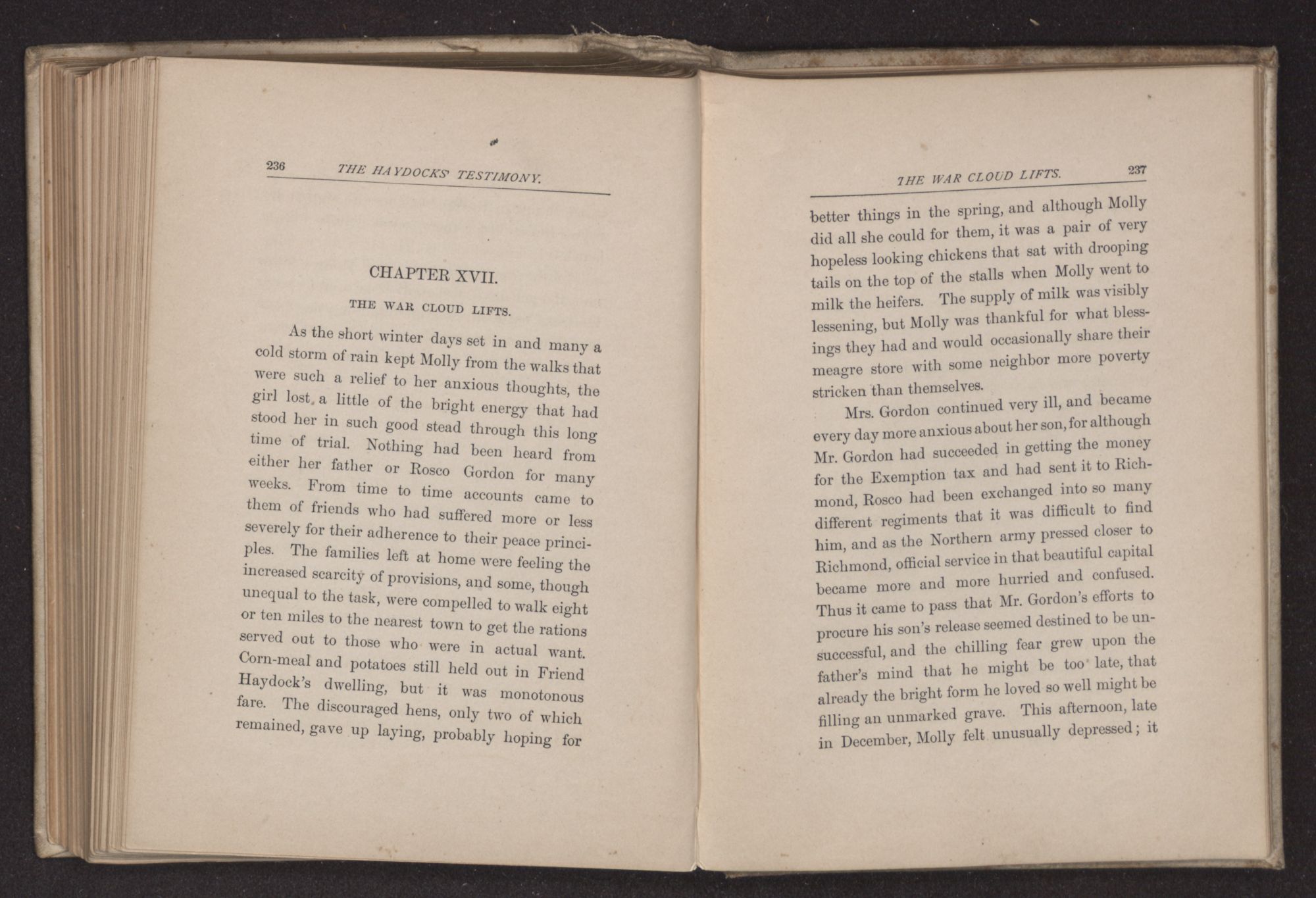 “There was a rumor last night that Richmond had fallen, Mrs. Haydock,” said Rosco Gordon, turning to address her as she sat quietly behind him; few words had been exchanged as they drove along, for a cast-off knapsack here, and a broken musket there, on the side of the road, continually reminded them of the misery throughout the land, the sorrow of bereaved families in the