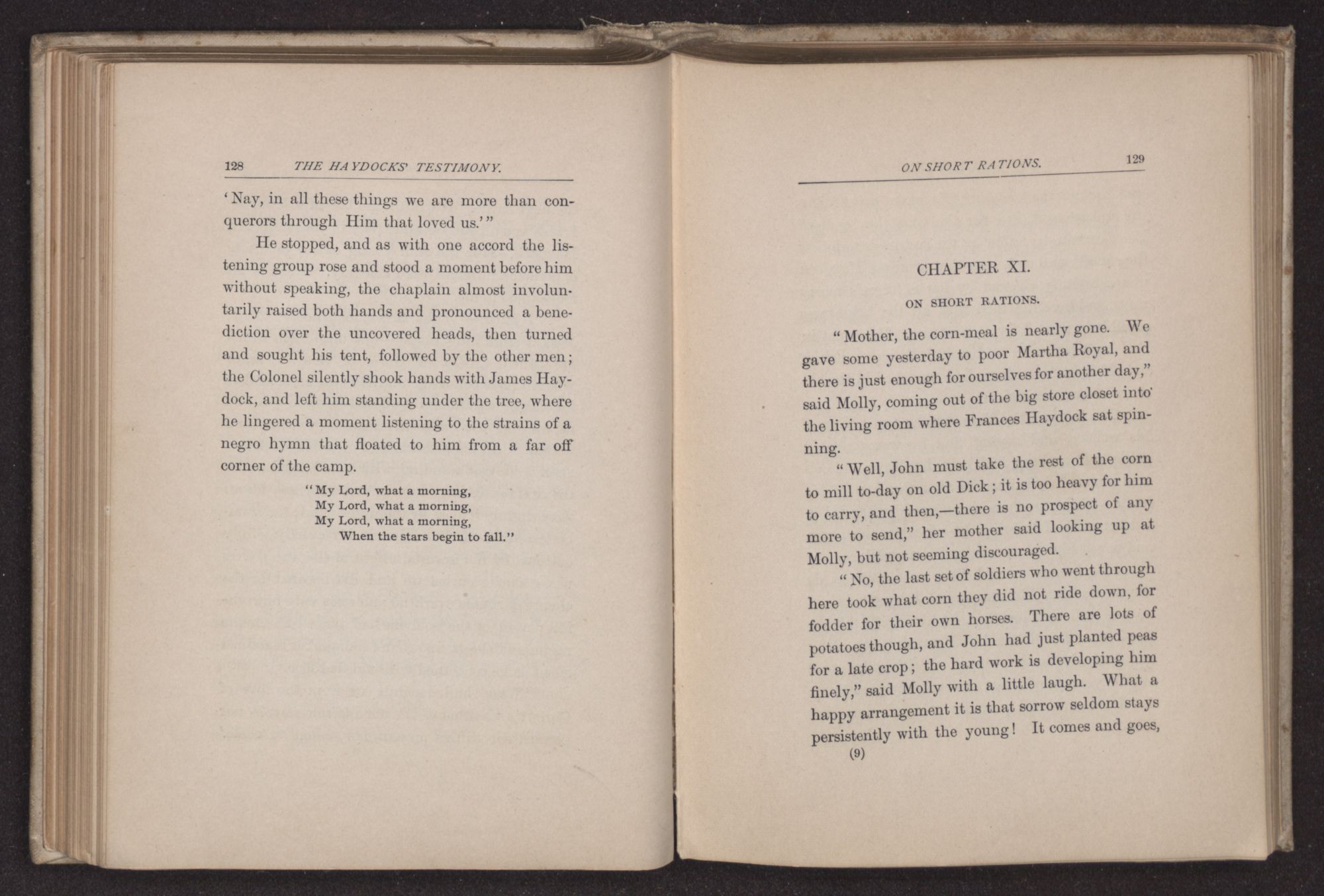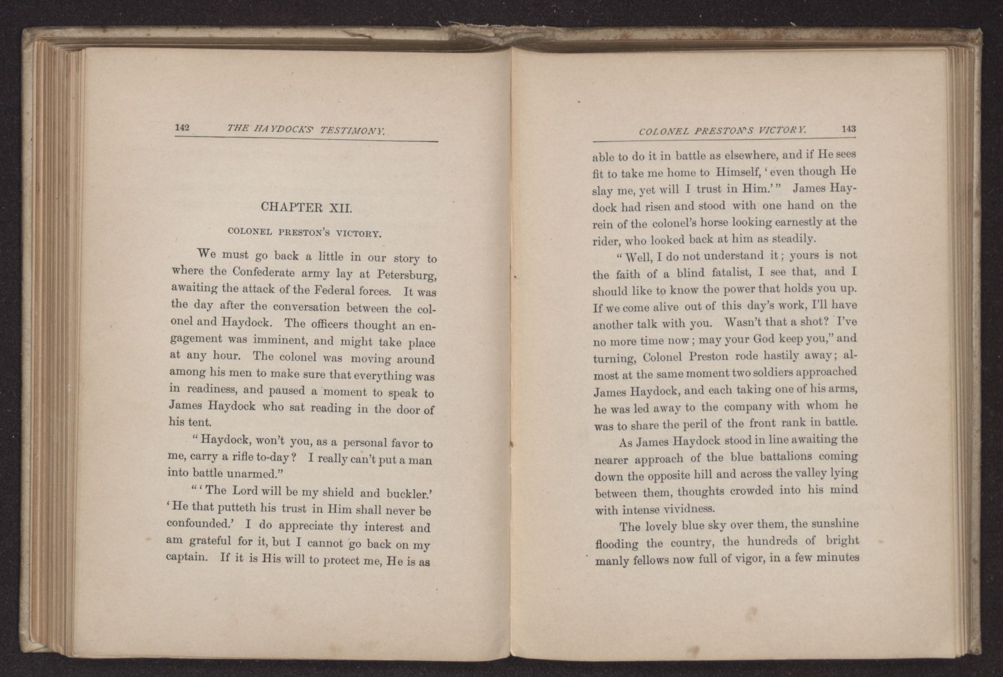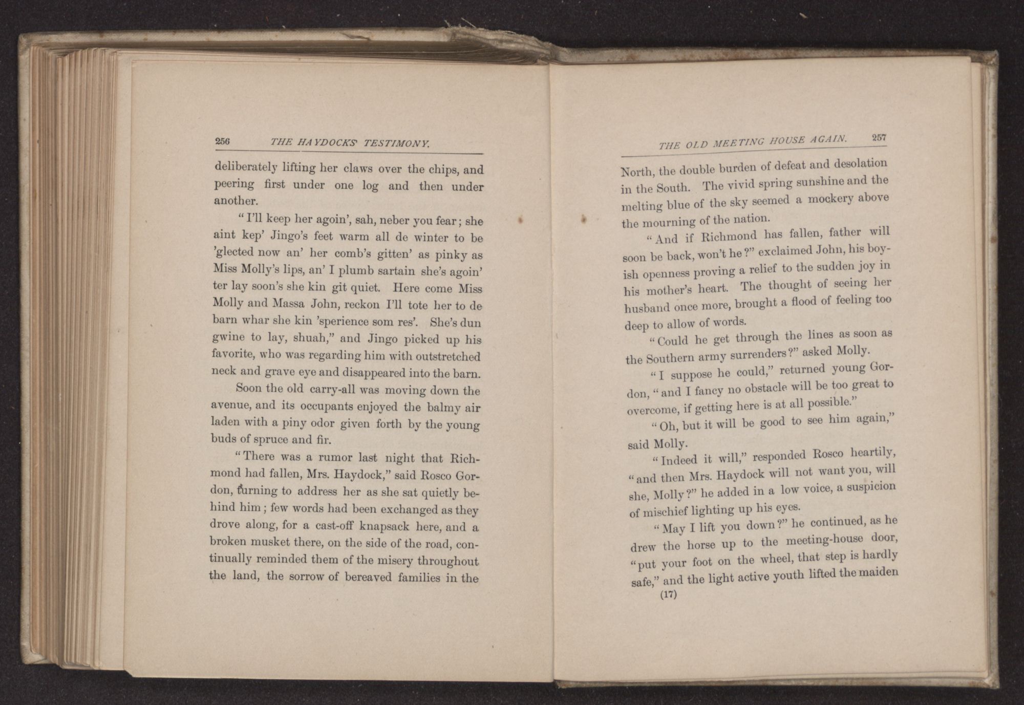 Richmond had fallen, and James Haydock had been one of the first to pass down through the Great Swamp and return to his family. Finding the home empty on his arrival, with the exception of Jingo, he left his hard ridden horse in the little stable and went at once to the meeting-house as the colored boy directed; he could not wait for the return of his household, and he wished also to return thanks in unison with the rest of
