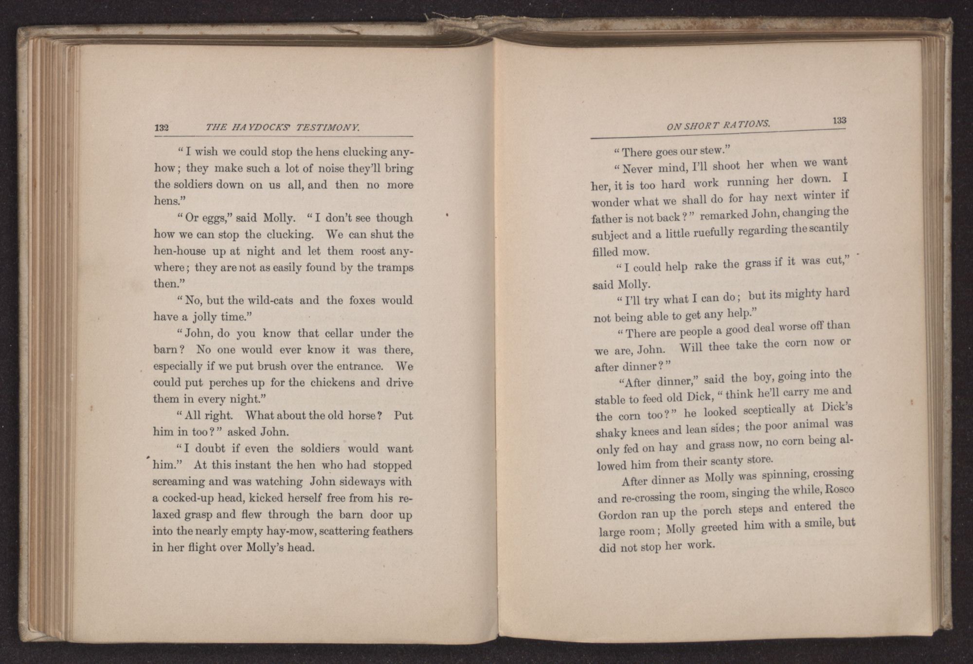 so sincerely, she could not but be relieved by the lifting of her most crushing anxiety, and daily did she give thanks to the loving Father whose commands they were endeavoring to obey and who had protected them amid much danger. Poverty has the one advantage of lessening care, except it be a grinding poverty that makes hourly sustenance a doubt. No horses, no cows were left; for the heifers had finally fallen a prey to a body of hungry foragers, and Molly, after the first shock, was glad, for the poor animals had been going on very small rations for some weeks and wore a pitifully unsatisfied look whenever she or John went to milk them. No corn to hoe, no garden to keep in order, made the duties of the household remarkably light. There were pine cones and light wood to be gathered, and John usually took his gun with him when he made his expeditions to the swamp, for a stray squirrel was a not unwelcome addition to their ordinary fare of hoe-cake and potatoes. Did I say there were no living animals about the place? This was incorrect, for of the two domesticated chickens, one still remained. Its existence was owing to the fancy it evinced for Jingo, a predeliction