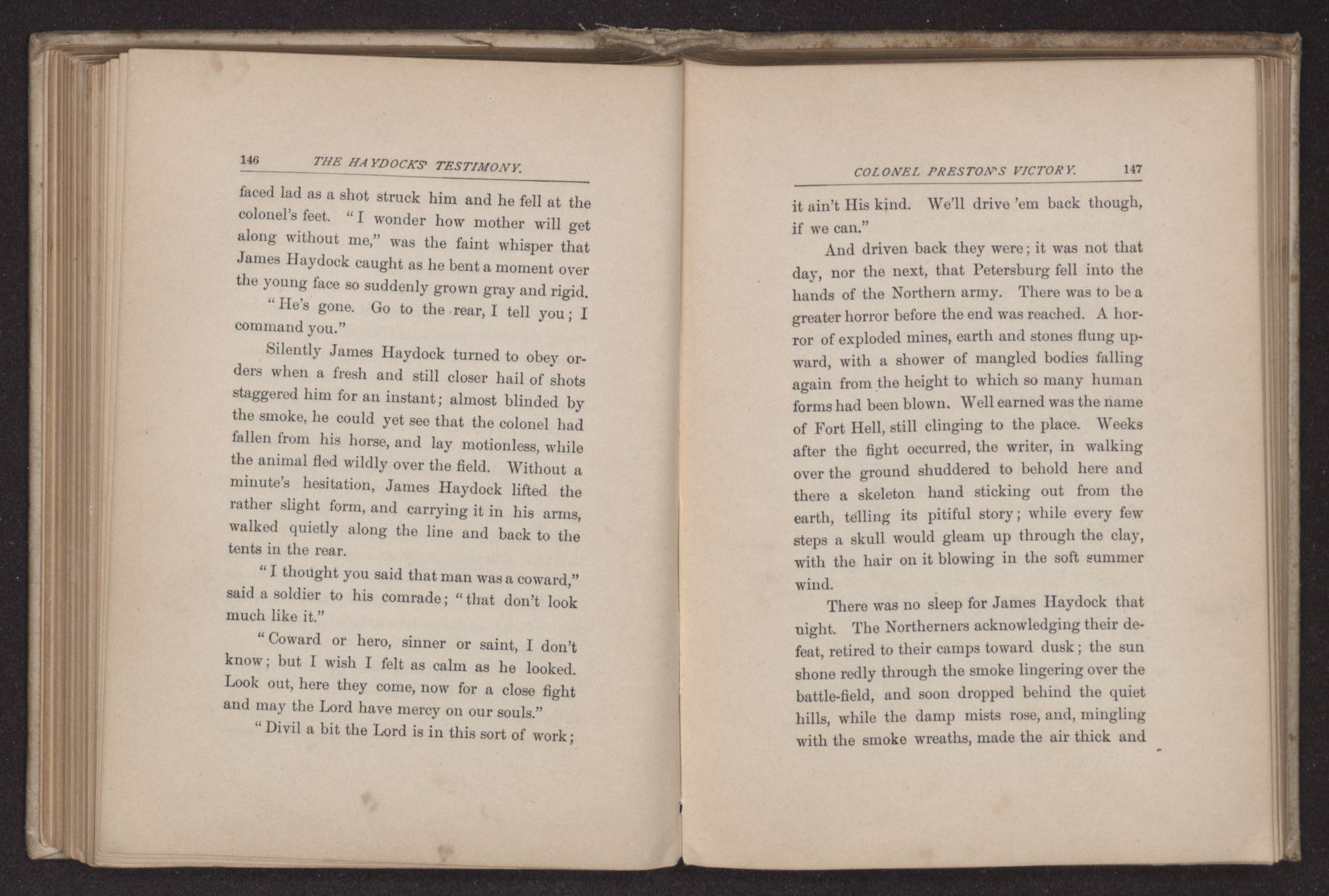 “I saw far more than I cared to,” was James Haydock's reply. “I would I could blot out from my mind the remembrance of one battle. It had been raging for hours across a valley, to and fro; the smoke hung in a thick curtain between the hills and through it we could hear the scream of the shells mingled with the shrieks of the wounded and the cry of the agonized horses, all in one terrible confusion. After one desperate charge of cavalry, the colonel of the regiment tried to gather his men together again, and in answer to his bugle call, more than an hundred horses wheeled into line, but the riders that had gone with them into that storm-cloud were not there. After the battle was over, (and on neither side was anything