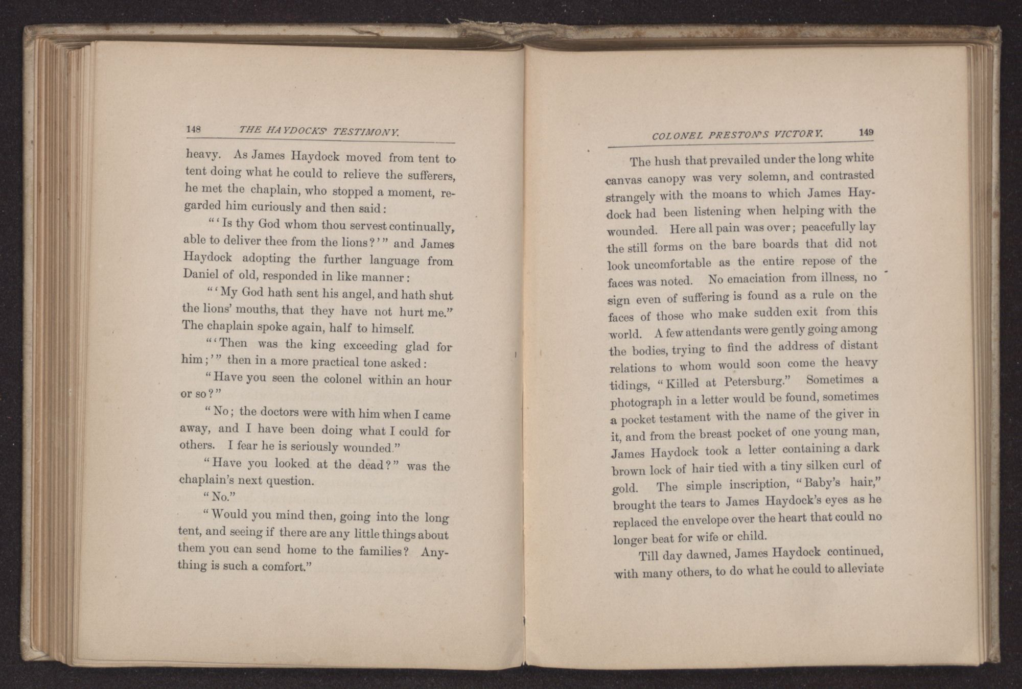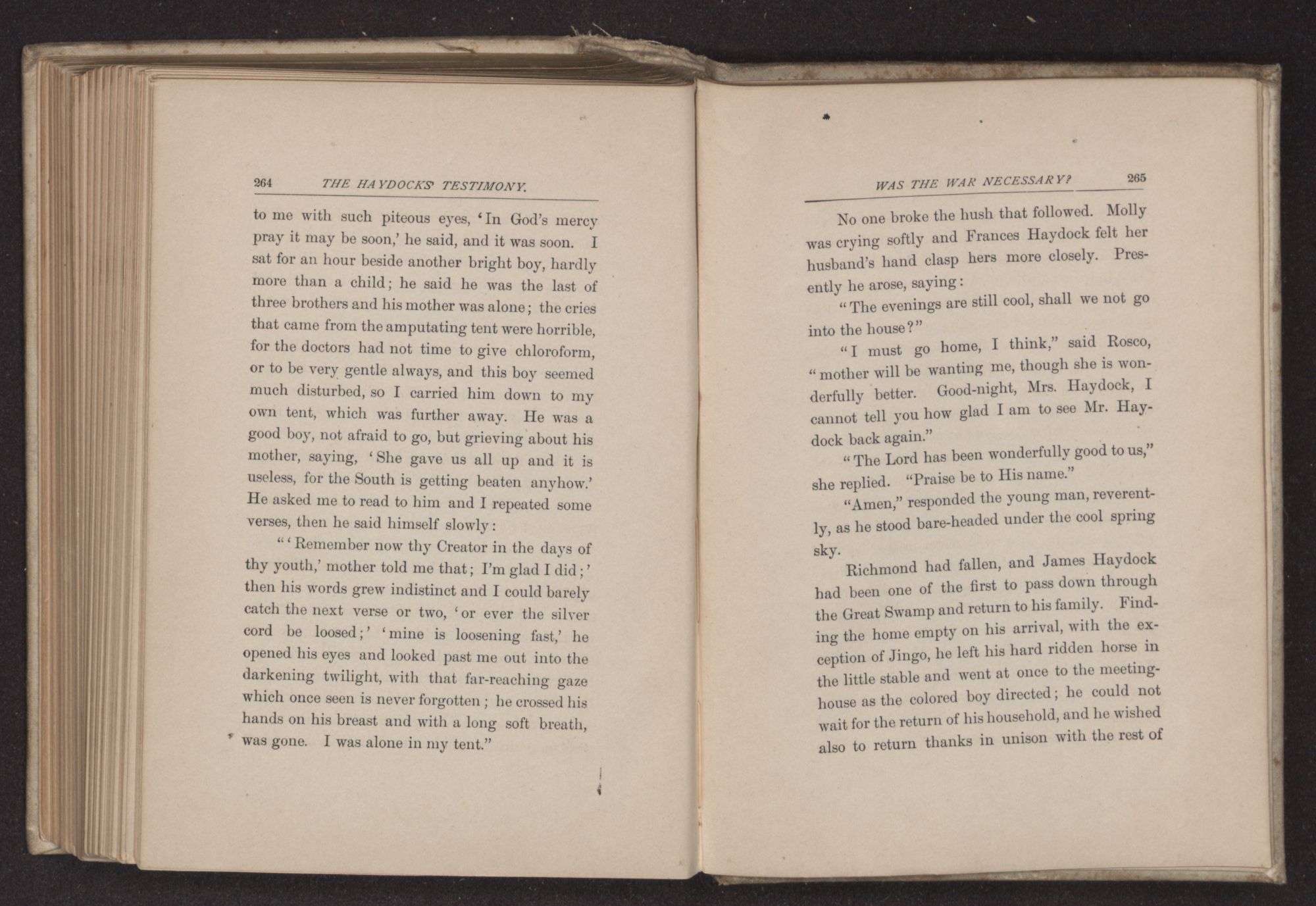 to me with such piteous eyes, ‘In God's mercy pray it may be soon,’ he said, and it was soon. I sat for an hour beside another bright boy, hardly more than a child; he said he was the last of three brothers and his mother was alone; the cries that came from the amputating tent were horrible, for the doctors had not time to give chloroform, or to be very gentle always, and this boy seemed much disturbed, so I carried him down to my own tent, which was further away. He was a good boy, not afraid to go, but grieving about his mother, saying, ‘She gave us all up and it is useless, for the South is getting beaten anyhow.’ He asked me to read to him and I repeated some verses, then he said himself slowly: