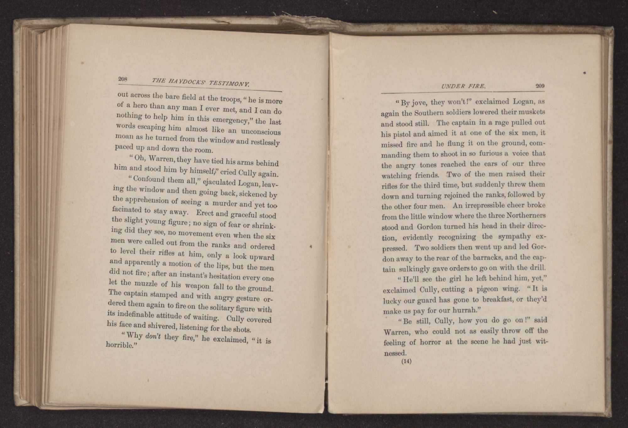 Being still firm in his refusal to fight, he was ordered to be shot. A little scaffold was prepared on which he was placed, and the men were drawn up in line ready to execute the sentence, when he prayed, “Father, forgive them; for they know not what they do.” Upon hearing this they lowered their guns, and he was thrust into prison.