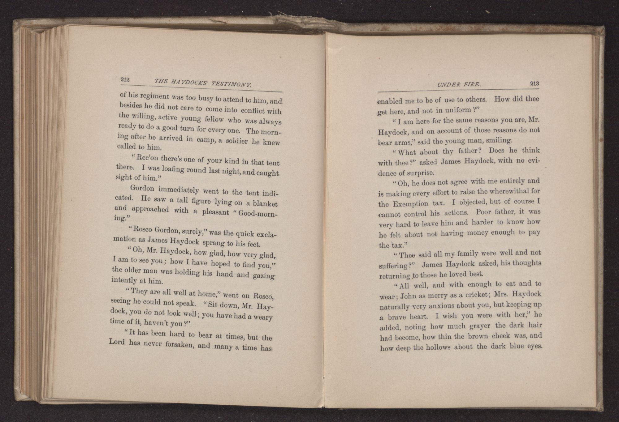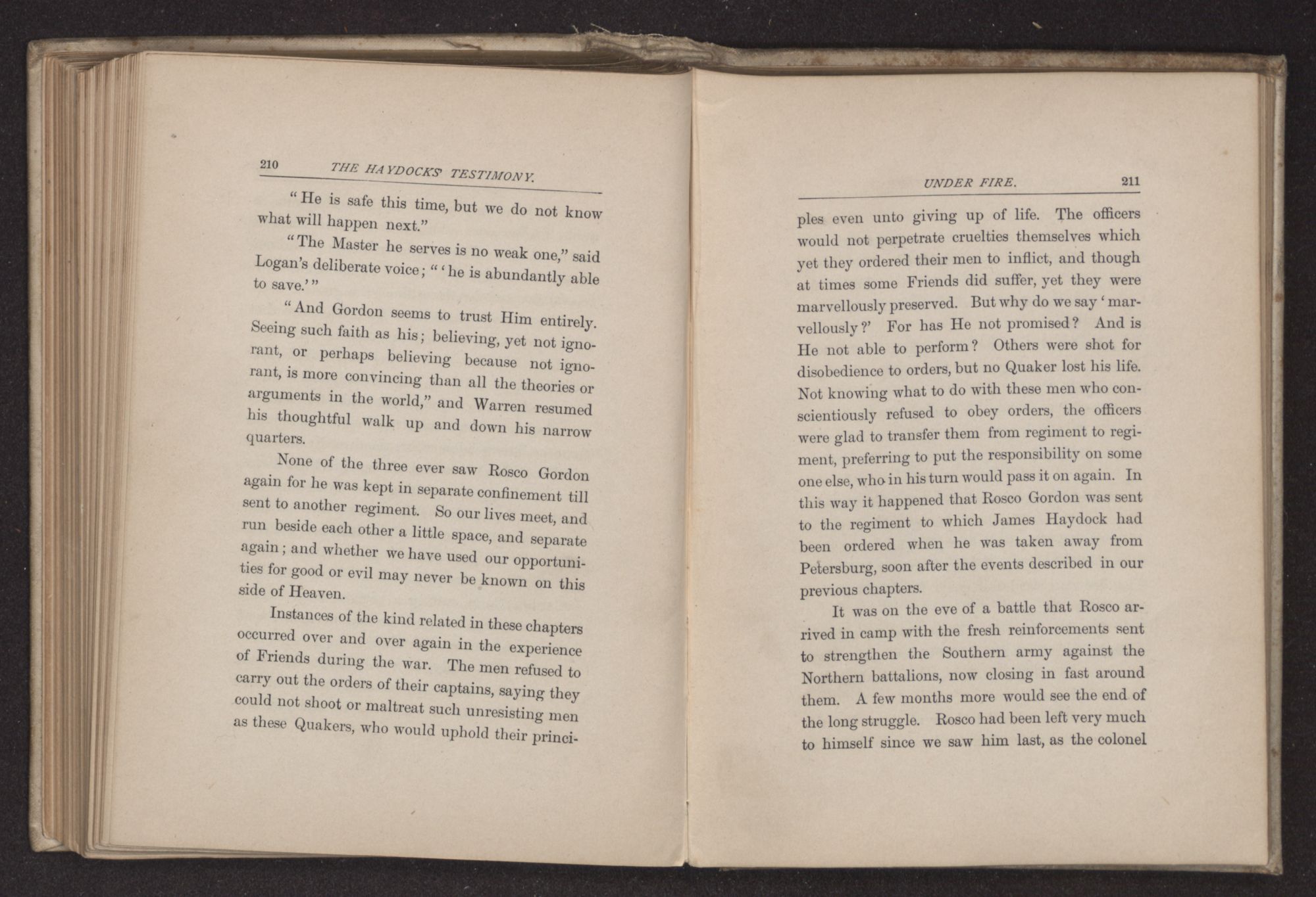 CHAPTER XVIII. THE OLD MEETING HOUSE AGAIN.Very glad and thankful was Frances Haydock to see Rosco Gordon once more and to learn that her beloved husband had been able to get through to the Union lines, and also to know that he had not suffered as much as many of the other Friends who had been impressed into the army. Weary and worn he might be, that was but the common lot of those among whom he was thrown, and no complaint was thought of on this account. Indeed, no murmuring was ever heard from the lips of these Quakers, even when they were wounded and beaten for steady refusals to bear arms. Other soldiers risked loss of life and limb for what they believed to be their duty, why should not the Friends take equal risk for the Captain under whom they served, the Prince of Peace? In following Him, however, none lost either life or limb, though they did endure that which perhaps was harder, the scorn and hatred