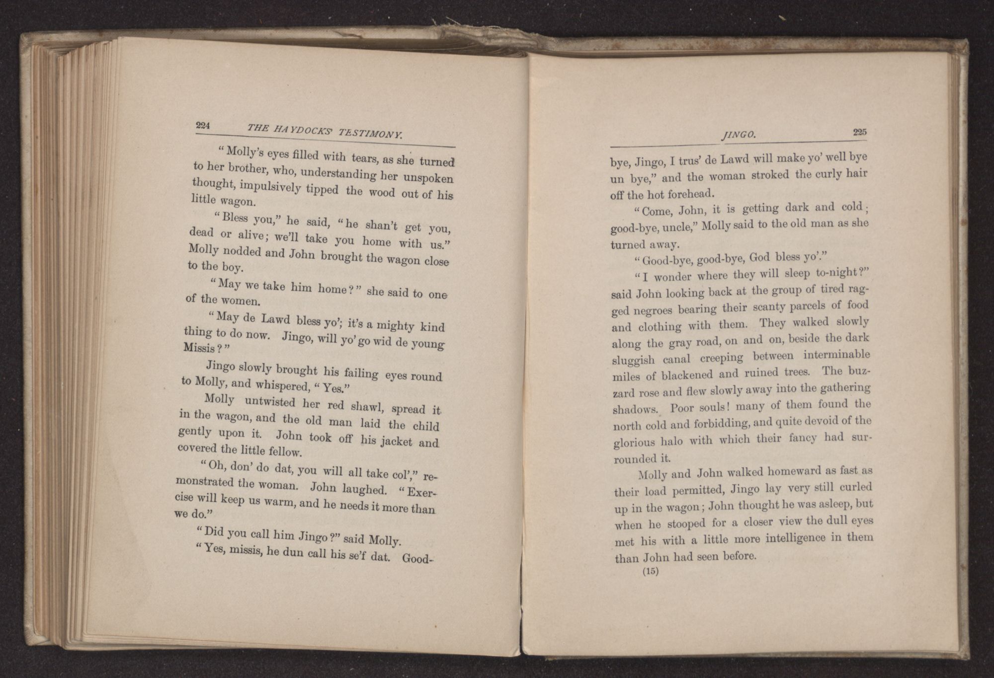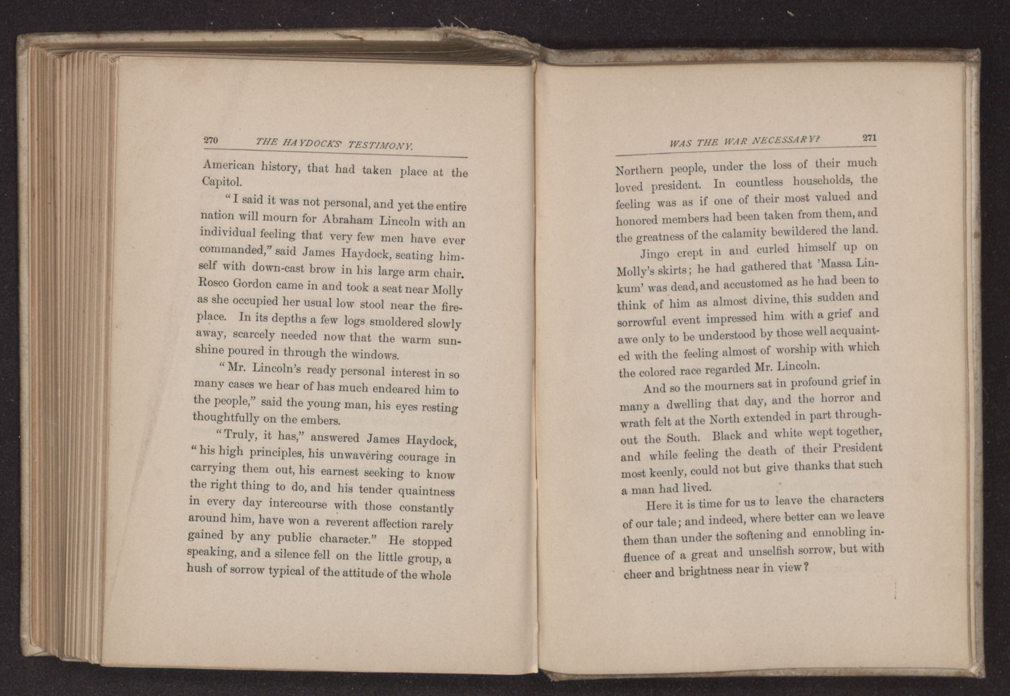 Jingo crept in and curled himself up on Molly's skirts; he had gathered that ’Massa Linkum’ was dead, and accustomed as he had been to think of him as almost divine, this sudden and sorrowful event impressed him with a grief and awe only to be understood by those well acquainted with the feeling almost of worship with which the colored race regarded Mr. Lincoln.