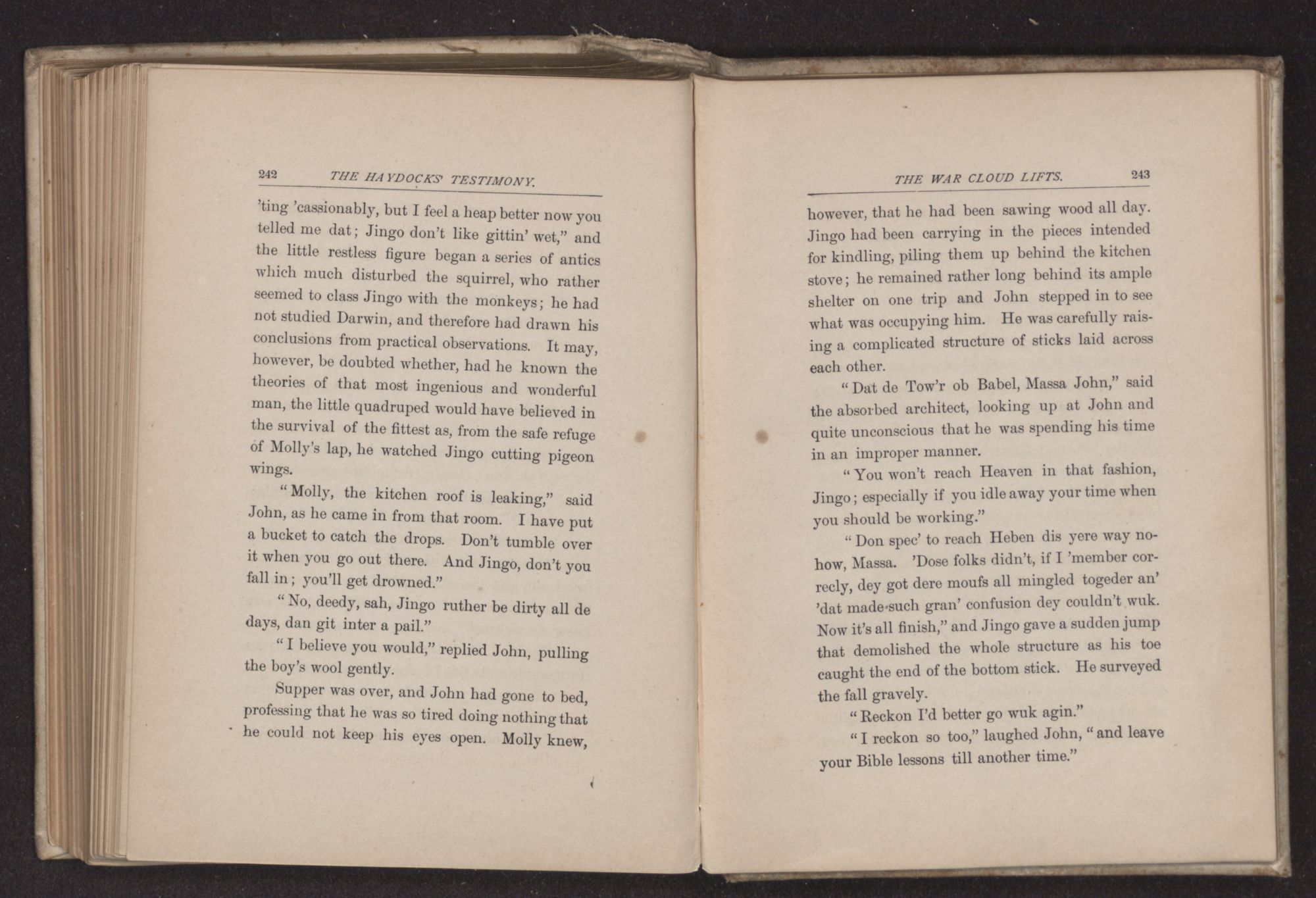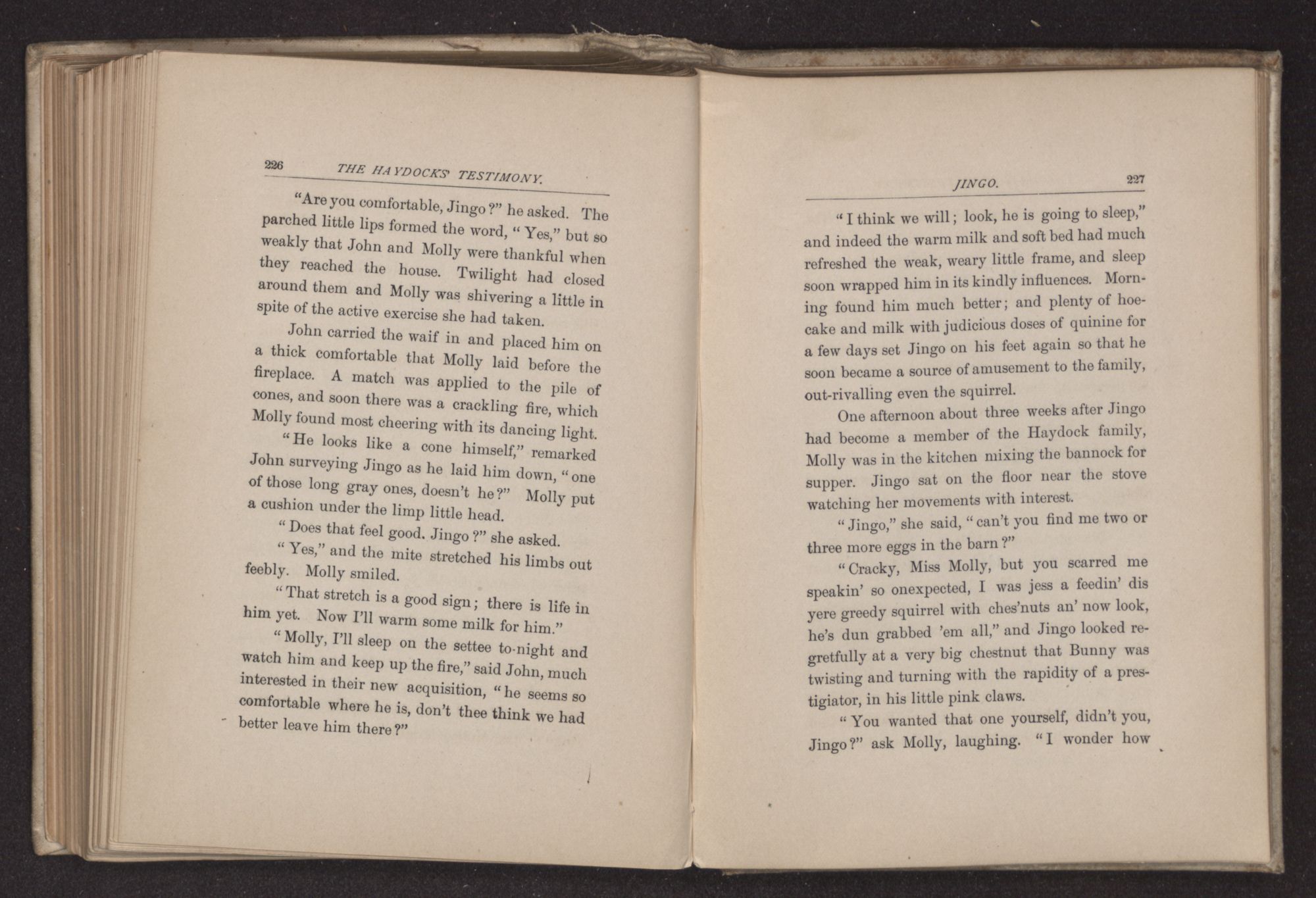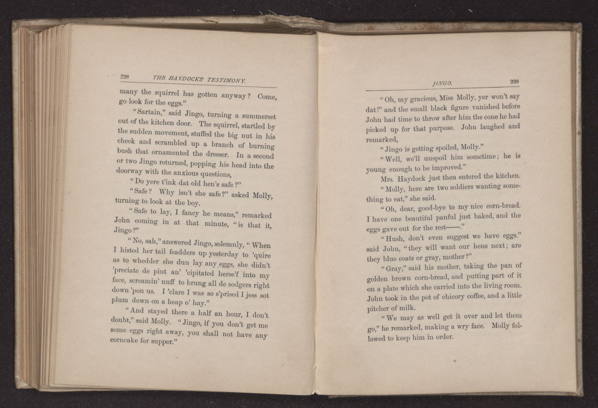 “Laws sake, Massa John, I'll gib it a bit ob what ever yer kin spar me. It reelly don't ’quire haf what as dat triflin’ squirrel gits.” Jingo did not like the squirrel, probably because the small beast regarded him with an unconquerable suspicion, and when perched on the clock, slyly dropped chestnut shells on to Jingo's head as he sat at the foot of the ancient piece of furniture, studying his spelling lesson.