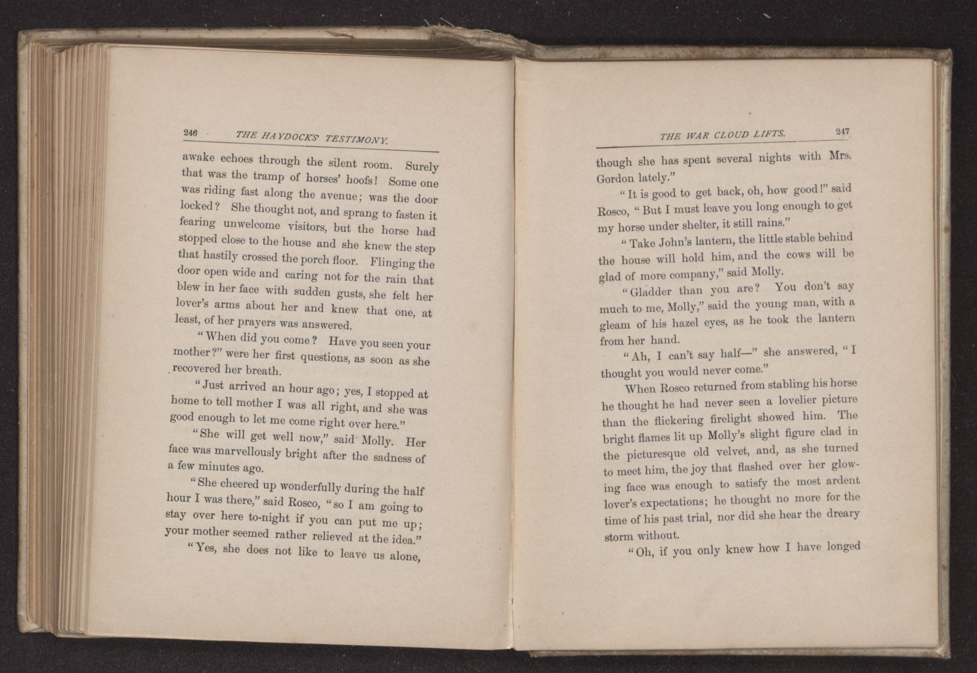 When Rosco returned from stabling his horse he thought he had never seen a lovelier picture than the flickering firelight showed him. The bright flames lit up Molly's slight figure clad in the picturesque old velvet, and, as she turned to meet him, the joy that flashed over her glowing face was enough to satisfy the most ardent lover's expectations; he thought no more for the time of his past trial, nor did she hear the dreary storm without.