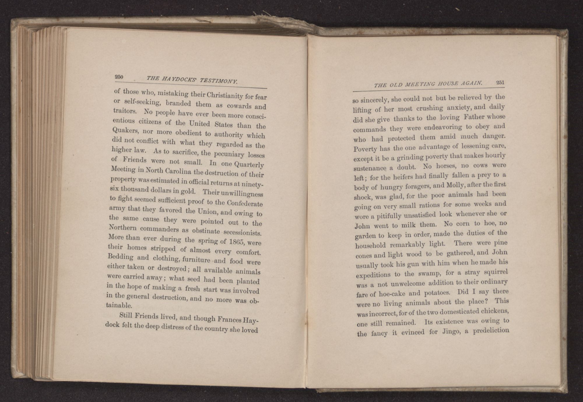 of those who, mistaking their Christianity for fear or self-seeking, branded them as cowards and traitors. No people have ever been more conscientious citizens of the United States than the Quakers, nor more obedient to authority which did not conflict with what they regarded as the higher law. As to sacrifice, the pecuniary losses of Friends were not small. In one Quarterly Meeting in North Carolina the destruction of their property was estimated in official returns at ninetysix thousand dollars in gold. Their unwillingness to fight seemed sufficient proof to the Confederate army that they favored the Union, and owing to the same cause they were pointed out to the Northern commanders as obstinate secessionists. More than ever during the spring of 1865, were their homes stripped of almost every comfort. Bedding and clothing, furniture and food were either taken or destroyed; all available animals were carried away; what seed had been planted in the hope of making a fresh start was involved in the general destruction, and no more was obtainable.