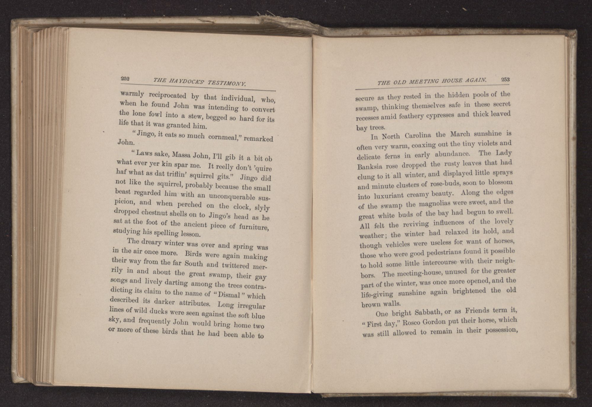 In North Carolina the March sunshine is often very warm, coaxing out the tiny violets and delicate ferns in early abundance. The Lady Banksia rose dropped the rusty leaves that had clung to it all winter, and displayed little sprays and minute clusters of rose-buds, soon to blossom into luxuriant creamy beauty. Along the edges of the swamp the magnolias were sweet, and the great white buds of the bay had begun to swell. All felt the reviving influences of the lovely weather; the winter had relaxed its hold, and though vehicles were useless for want of horses, those who were good pedestrians found it possible to hold some little intercourse with their neighbors. The meeting-house, unused for the greater part of the winter, was once more opened, and the life-giving sunshine again brightened the old brown walls.
