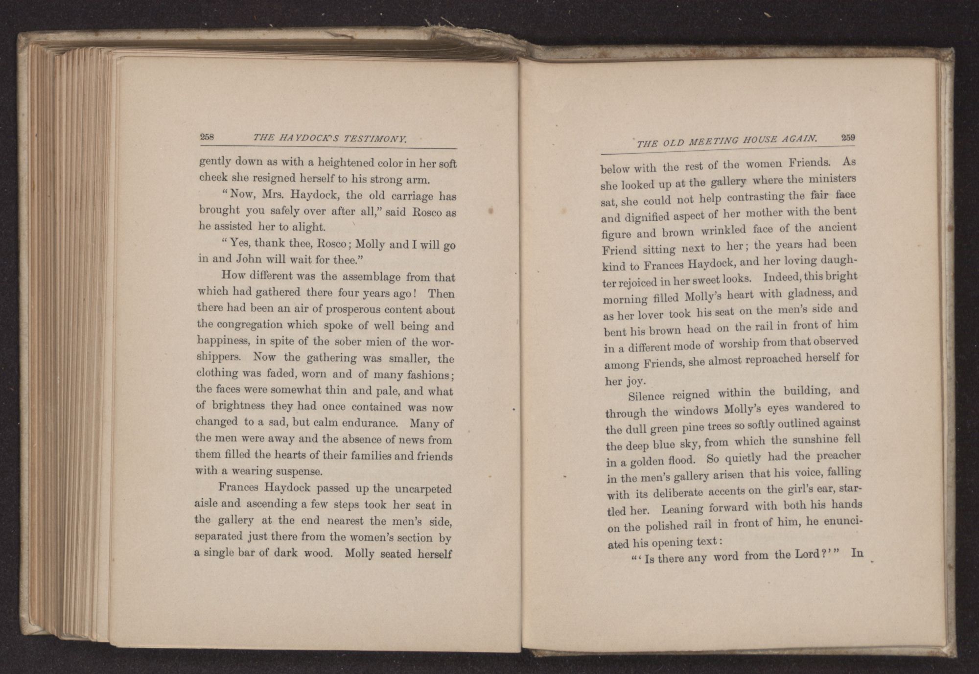A pleasant faced old man straightened the brown cushions on the browner benches in the meeting house, set the carpet foot-stools or bosses, in order, and locking the heavy door, shut away the sunshine from the now empty building. He handed the key to David Haydock as he was getting into the coach.