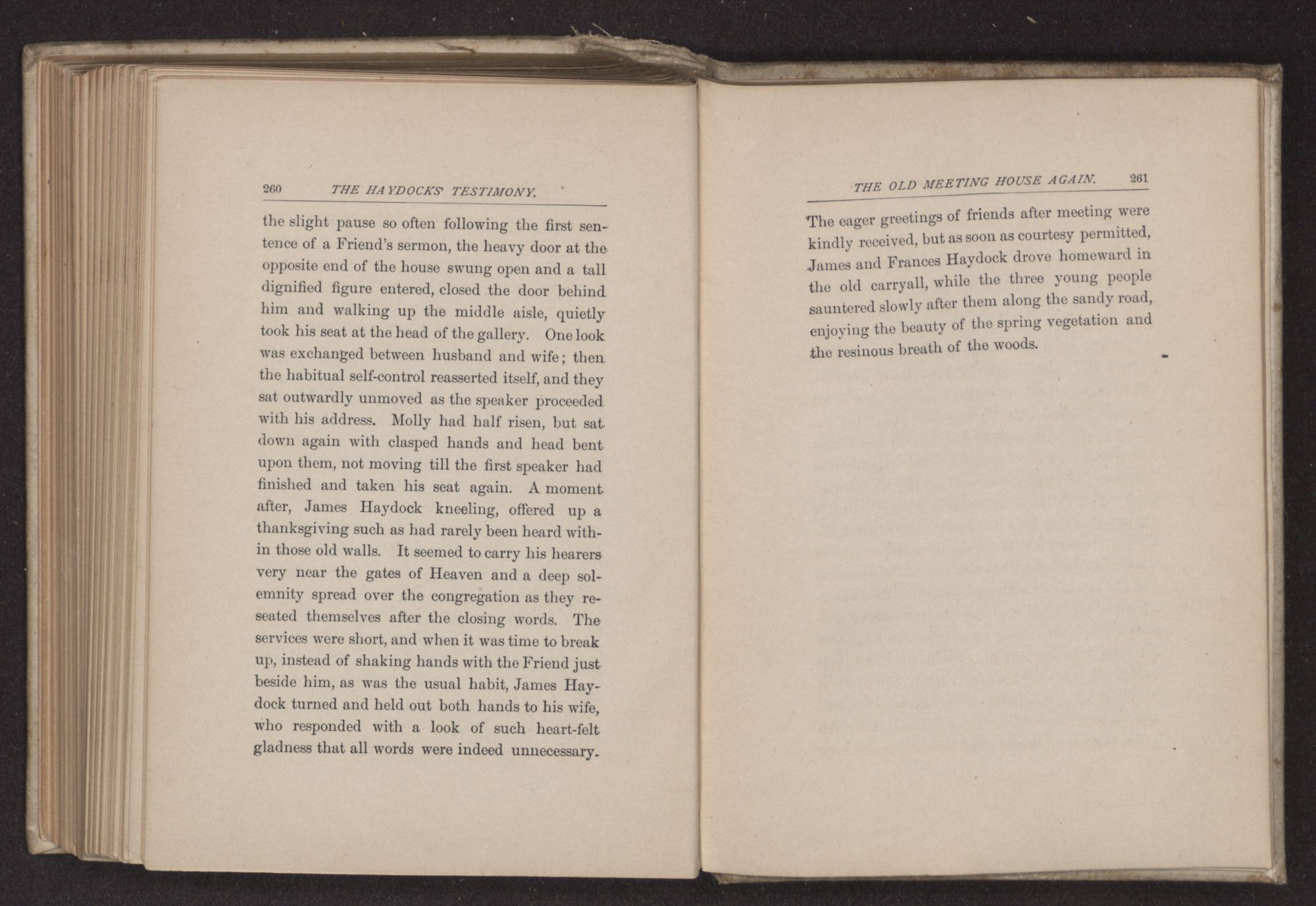 the slight pause so often following the first sentence of a Friend's sermon, the heavy door at the opposite end of the house swung open and a tall dignified figure entered, closed the door behind him and walking up the middle aisle, quietly took his seat at the head of the gallery. One look was exchanged between husband and wife; then the habitual self-control reasserted itself, and they sat outwardly unmoved as the speaker proceeded with his address. Molly had half risen, but sat down again with clasped hands and head bent upon them, not moving till the first speaker had finished and taken his seat again. A moment after, James Haydock kneeling, offered up a thanksgiving such as had rarely been heard within those old walls. It seemed to carry his hearers very near the gates of Heaven and a deep solemnity spread over the congregation as they reseated themselves after the closing words. The services were short, and when it was time to break up, instead of shaking hands with the Friend just beside him, as was the usual habit, James Haydock turned and held out both hands to his wife, who responded with a look of such heart-felt gladness that all words were indeed unnecessary.