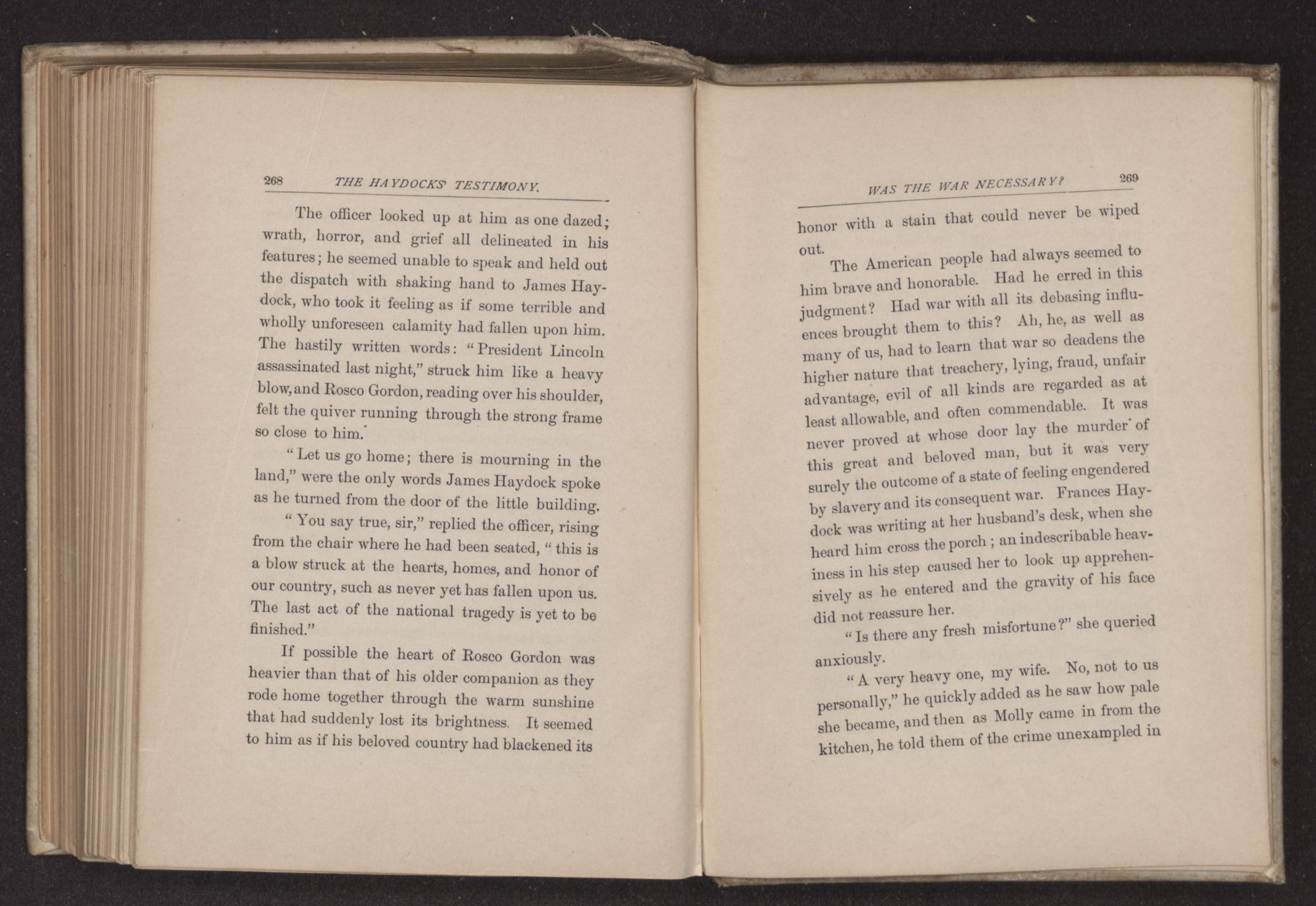 The American people had always seemed to him brave and honorable. Had he erred in this judgment? Had war with all its debasing influences brought them to this? Ah, he, as well as many of us, had to learn that war so deadens the higher nature than treachery, lying, fraud, unfair advantage, evil of all kinds are regarded as at least allowable, and often commendable. It was never proved at whose door lay the murder of this great and beloved man, but it was very surely the outcome of a state of feeling engendered by slavery and its consequent war. Frances Haydock was writing at her husband's desk, when she heard him cross the porch; an indescribable heaviness in his step caused her to look up apprehensively as he entered and the gravity of his face did not reassure her.