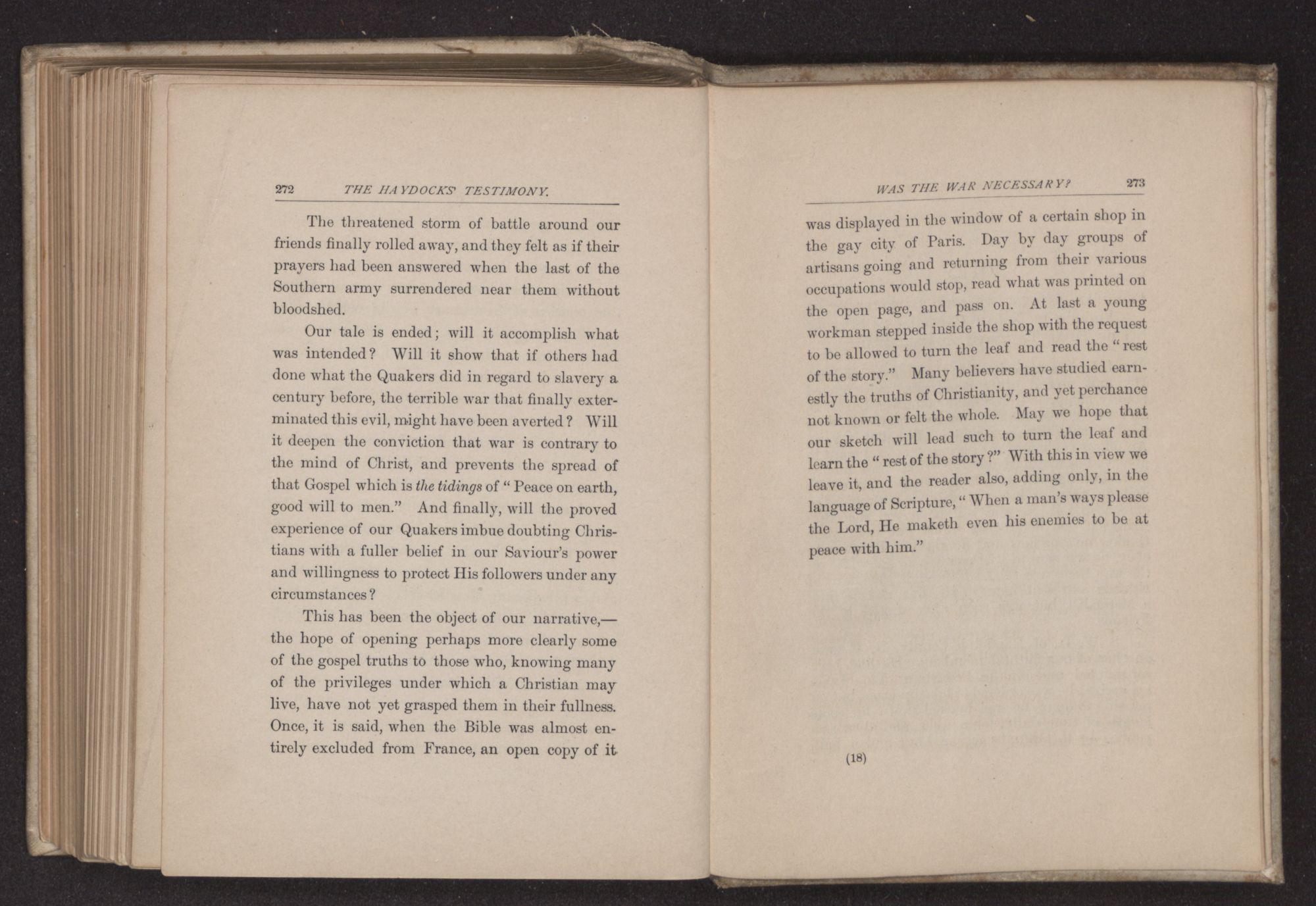 Our tale is ended; will it accomplish what was intended? Will it show that if others had done what the Quakers did in regard to slavery a century before, the terrible war that finally exterminated this evil, might have been averted? Will it deepen the conviction that war is contrary to the mind of Christ, and prevents the spread of that Gospel which is the tidings of “Peace on earth, good will to men.” And finally, will the proved experience of our Quakers imbue doubting Christians with a fuller belief in our Saviour's power and willingness to protect His followers under any circumstances?