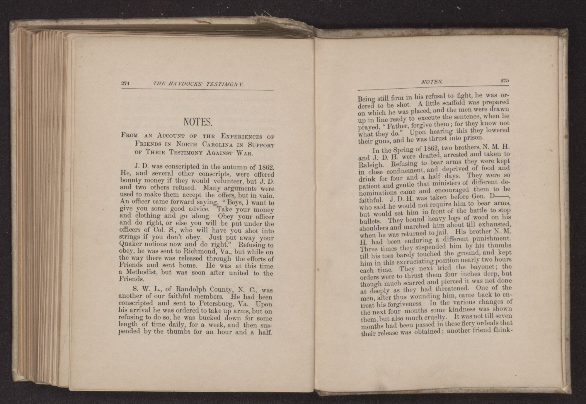 S. W. L., of Randolph County, N. C., was another of our faithful members. He had been conscripted and sent to Petersburg, Va. Upon his arrival he was ordered to take up arms, but on refusing to do so, he was bucked down for some length of time daily, for a week, and then suspended by the thumbs for an hour and a half.