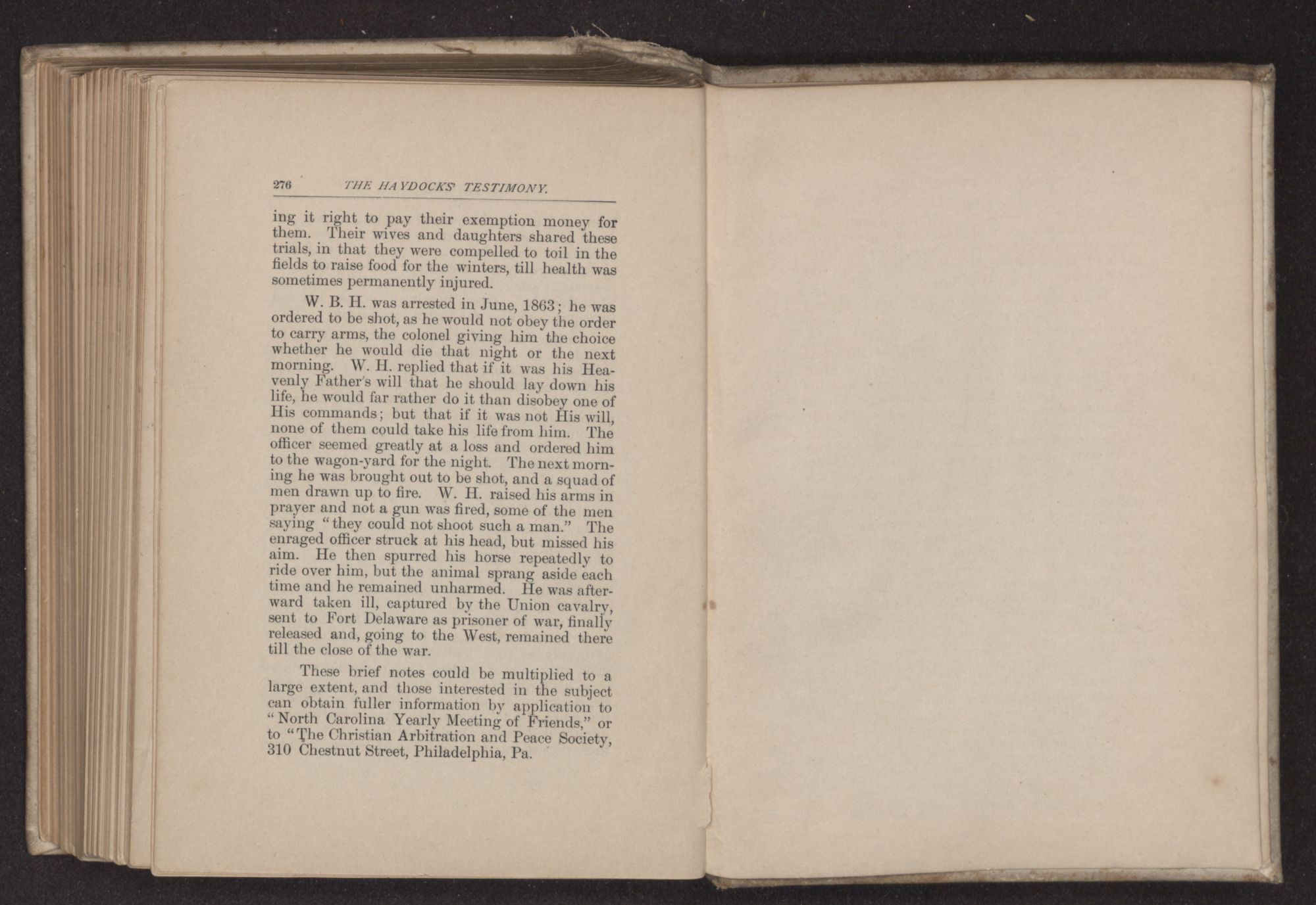 W. B. H. was arrested in June, 1863; he was ordered to be shot, as he would not obey the order to carry arms, the colonel giving him the choice whether he would die that night or the next morning. W. H. replied that if it was his Heavenly Father's will that he should lay down his life, he would far rather do it than disobey one of His commands; but that if it was not His will, none of them could take his life from him. The officer seemed greatly at a loss and ordered him to the wagon-yard for the night. The next morning he was brought out to be shot, and a squad of men drawn up to fire. W. H. raised his arms in prayer and not a gun was fired, some of the men saying “they could not shoot such a man.” The enraged officer struck at his head, but missed his aim. He then spurred his horse repeatedly to ride over him, but the animal sprang aside each time and he remained unharmed. He was afterward taken ill, captured by the Union cavalry, sent to Fort Delaware as prisoner of war, finally released and, going to the West, remained there till the close of the war.