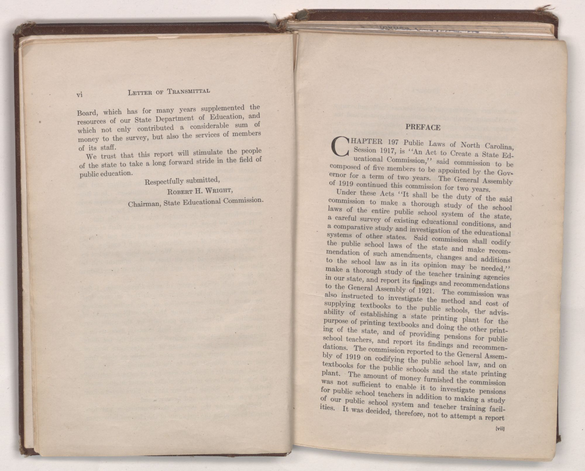 PREFACECHAPTER 197 Public Laws of North Carolina, Session 1917, is “An Act to Create a State Educational Commission,” said commission to be composed of five members to be appointed by the Governor for a term of two years. The General Assembly of 1919 continued this commission for two years.
