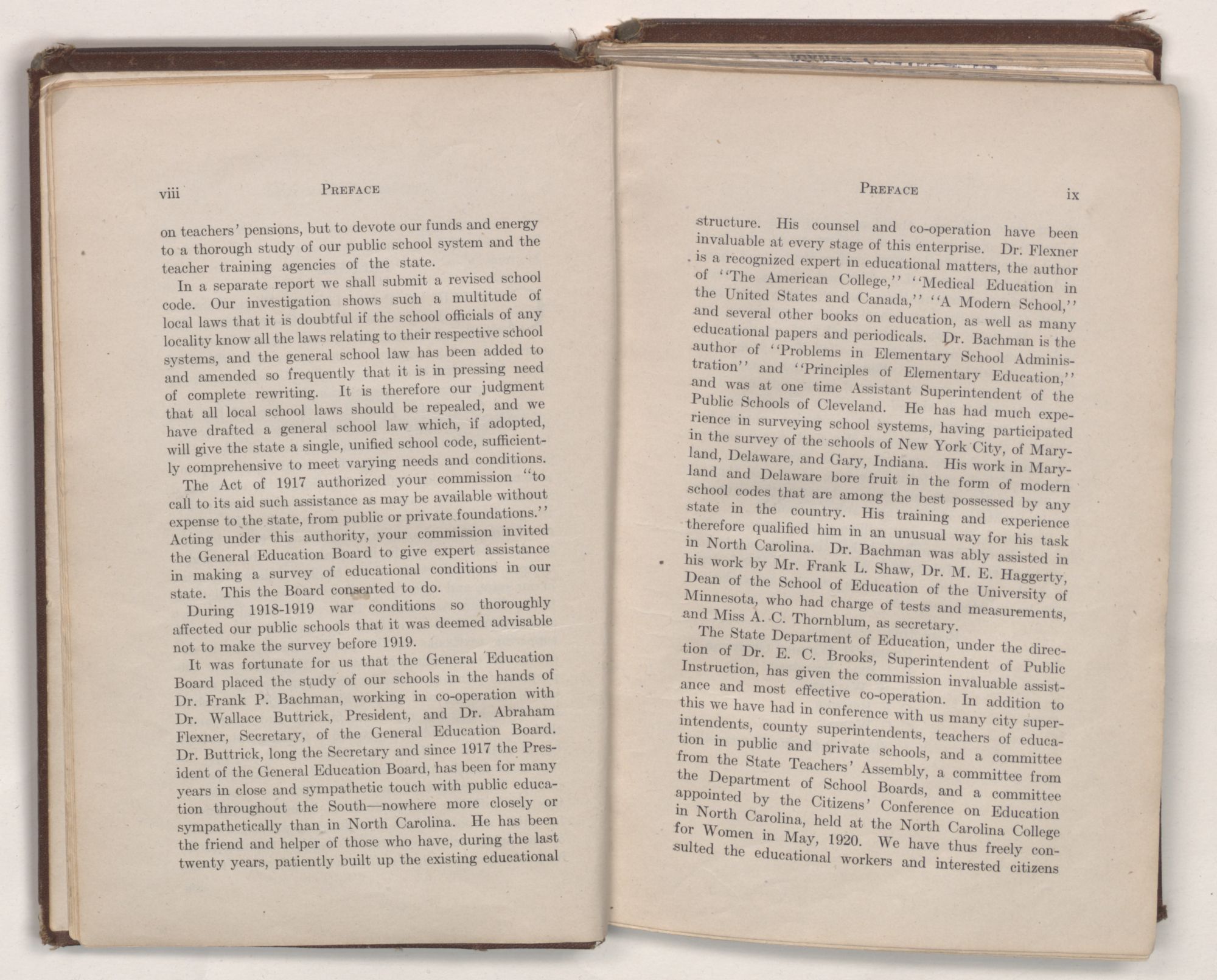 It was fortunate for us that the General Education Board placed the study of our schools in the hands of Dr. Frank P. Bachman, working in co-operation with Dr. Wallace Buttrick, President, and Dr. Abraham Flexner, Secretary, of the General Education Board. Dr. Buttrick, long the Secretary and since 1917 the President of the General Education Board, has been for many years in close and sympathetic touch with public education throughout the South—nowhere more closely or sympathetically than in North Carolina. He has been the friend and helper of those who have, during the last twenty years, patiently built up the existing educational