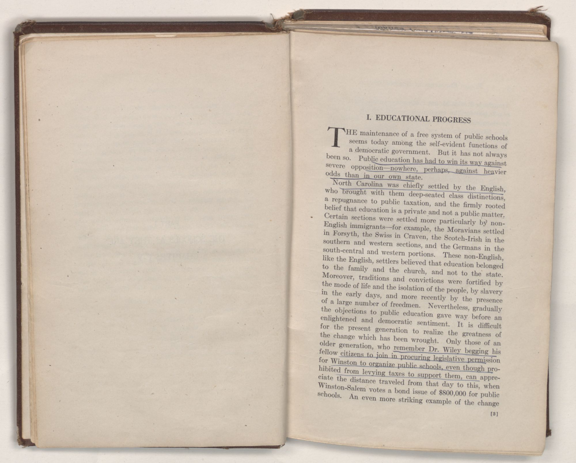 North Carolina was chiefly settled by the English, who brought with them deep-seated class distinctions, a repugnance to public taxation, and the firmly rooted belief that education is a private and not a public matter. Certain sections were settled more particularly by non-English immigrants—for example, the Moravians settled in Forsyth, the Swiss in Craven, the Scotch-Irish in the southern and western sections, and the Germans in the south-central and western portions. These non-English, like the English, settlers believed that education belonged to the family and the church, and not to the state. Moreover, traditions and convictions were fortified by the mode of life and the isolation of the people, by slavery in the early days, and more recently by the presence of a large number of freedmen. Nevertheless, gradually the objections to public education gave way before an enlightened and democratic sentiment. It is difficult for the present generation to realize the greatness of the change which has been wrought. Only those of an older generation, who remember Dr. Wiley begging his fellow citizens to join in procuring legislative permission for Winston to organize public schools, even though prohibited from levying taxes to support them, can appreciate the distance traveled from that day to this, when Winston-Salem votes a bond issue of $800,000 for public schools. An even more striking example of the change