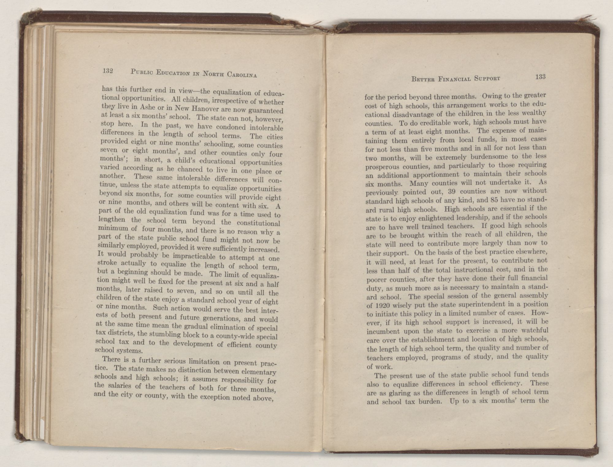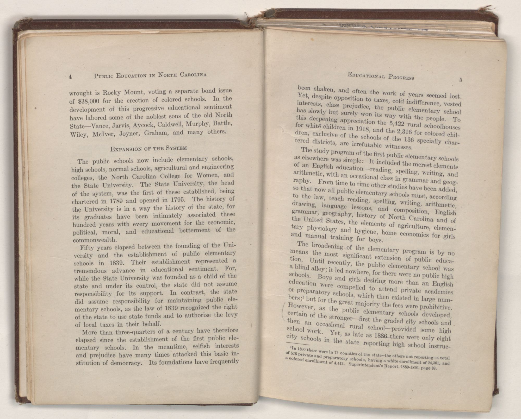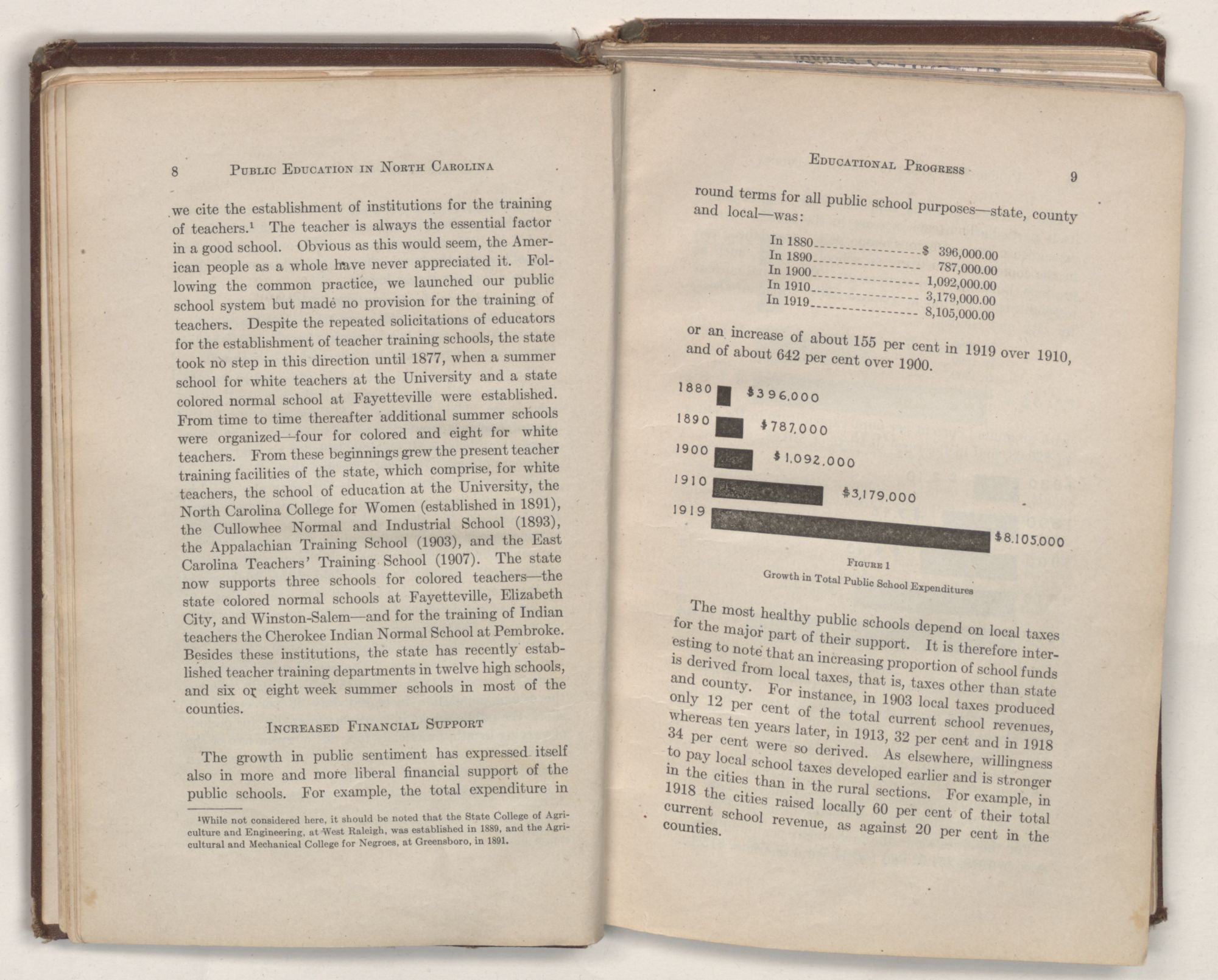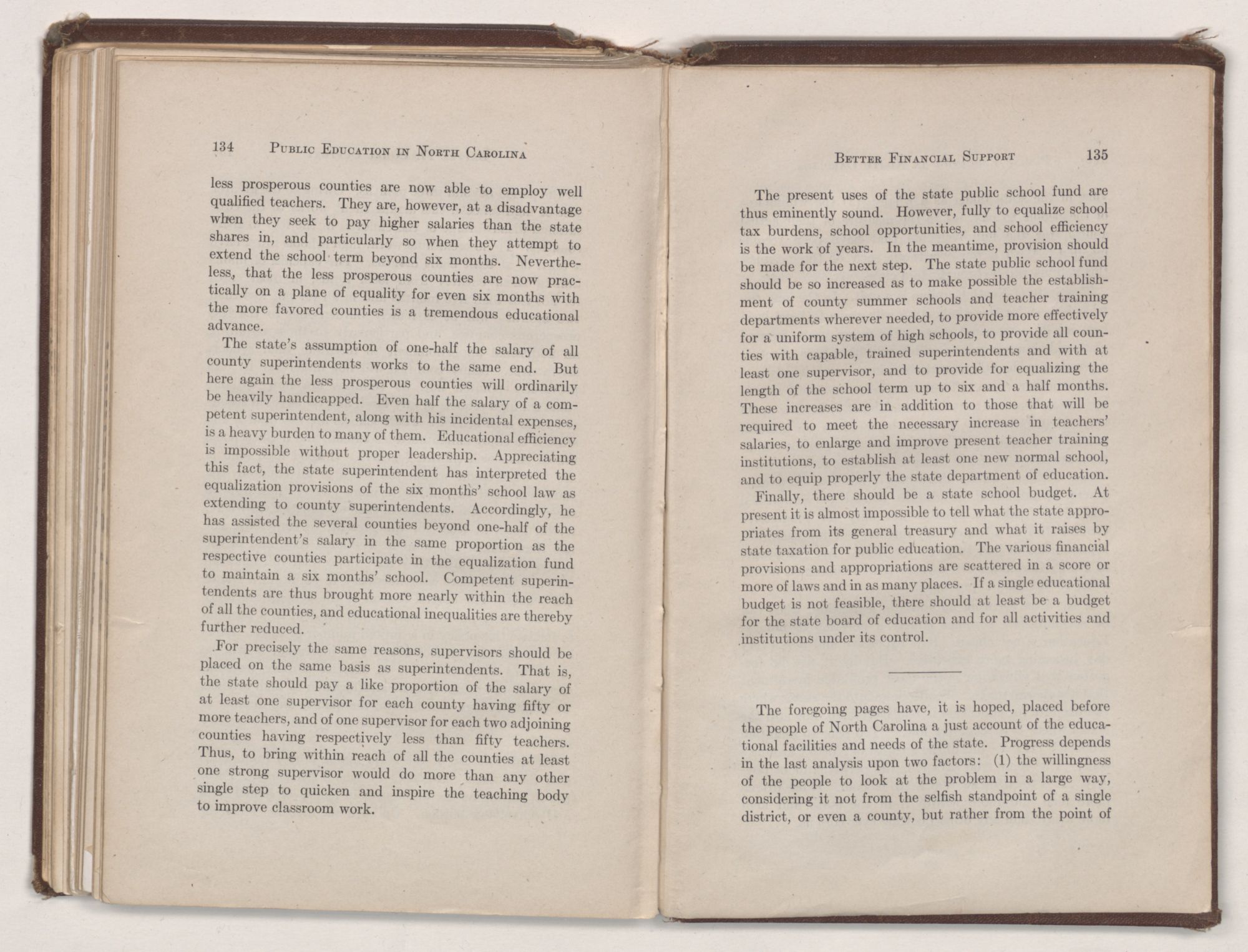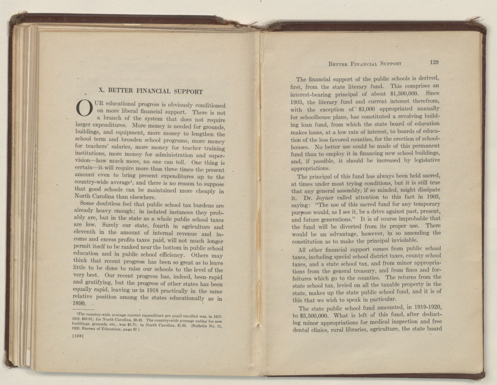 OUR educational progress is obviously conditioned on more liberal financial support. There is not a branch of the system that does not require larger expenditures. More money is needed for grounds, buildings, and equipment, more money to lengthen the school term and broaden school programs, more money for teachers’ salaries, more money for teacher training institutions, more money for administration and supervision—how much more, no one can tell. One thing is certain—it will require more than three times the present amount even to bring present expenditures up to the country-wide average1, and there is no reason to suppose that good schools can be maintained more cheaply in North Carolina than elsewhere.
