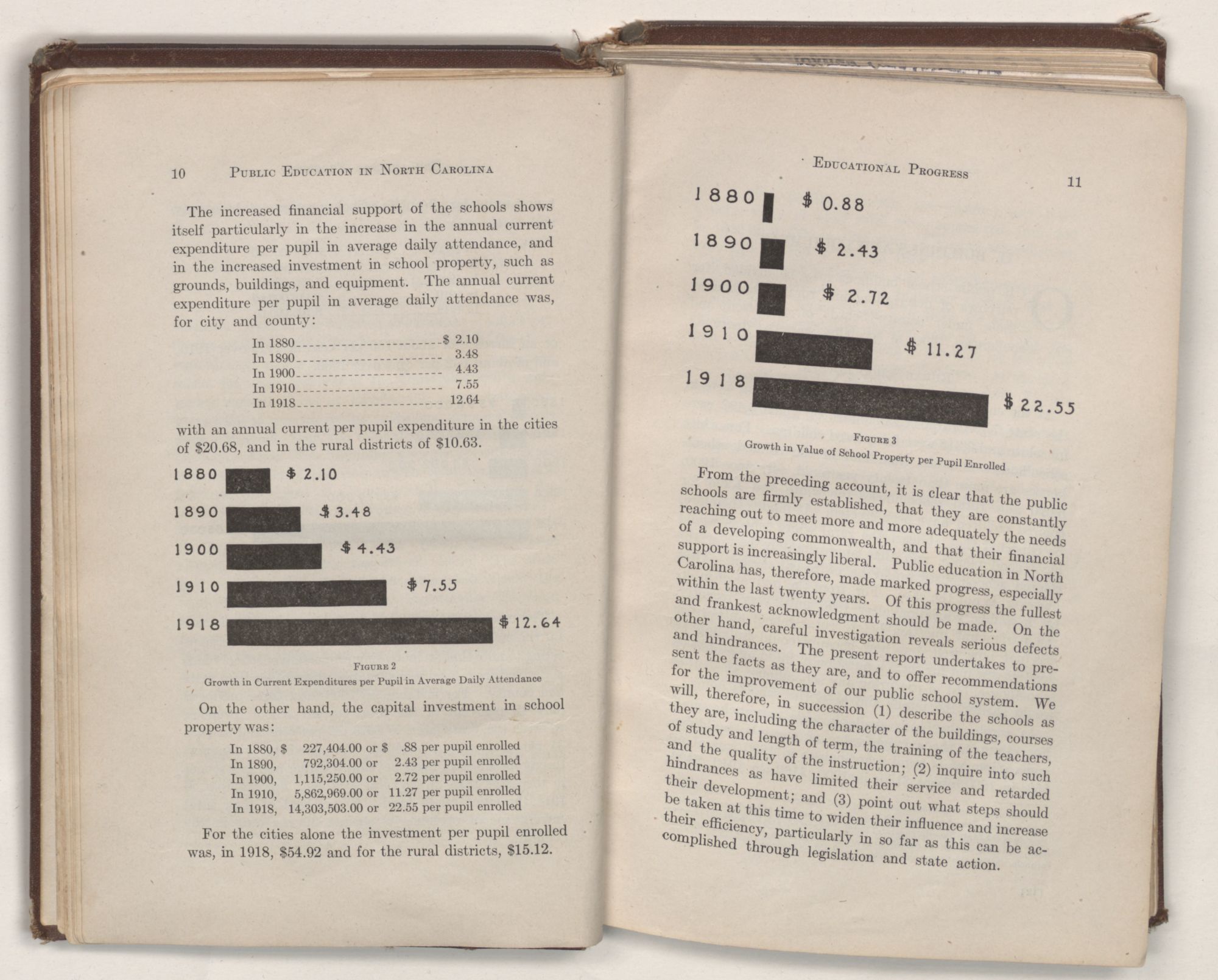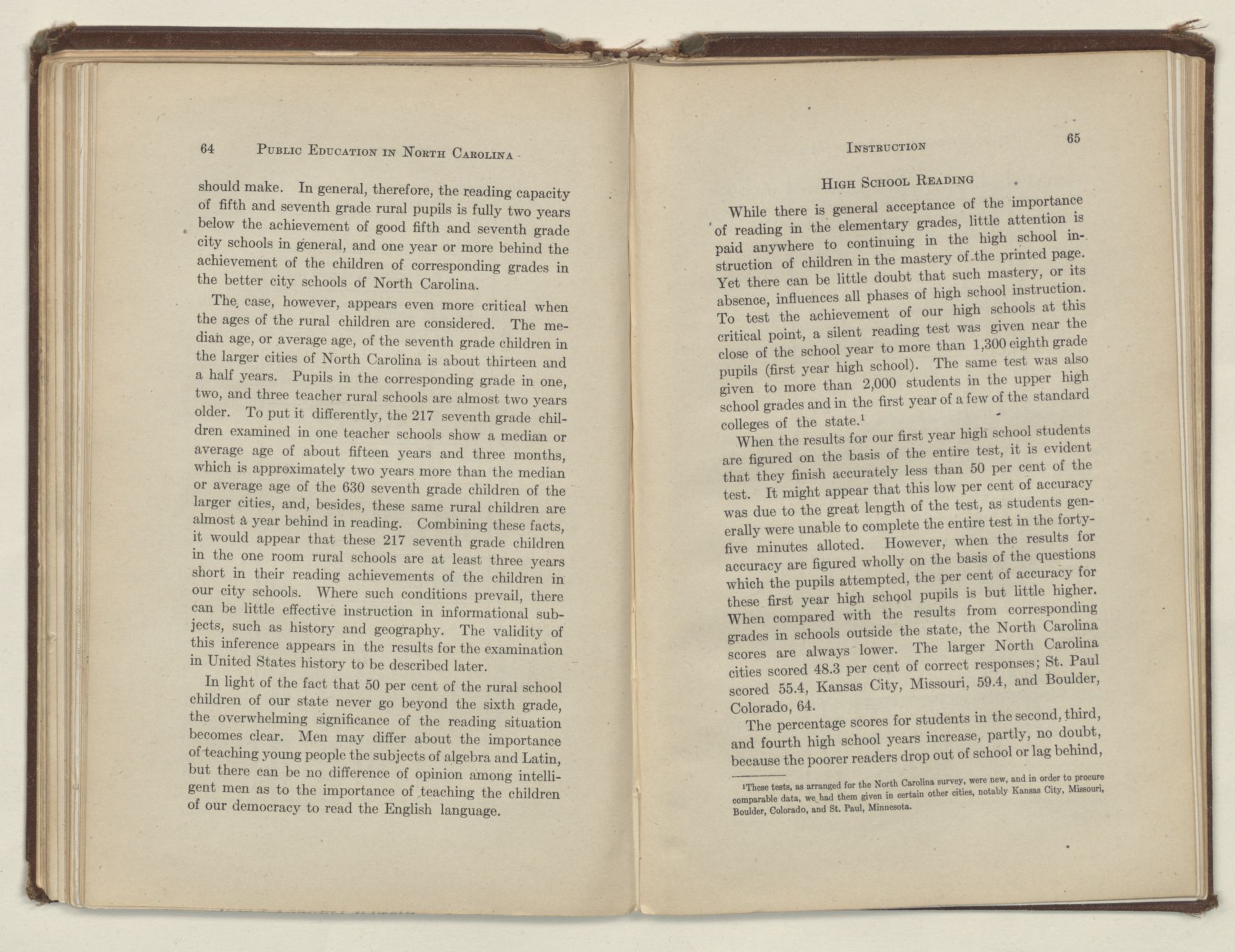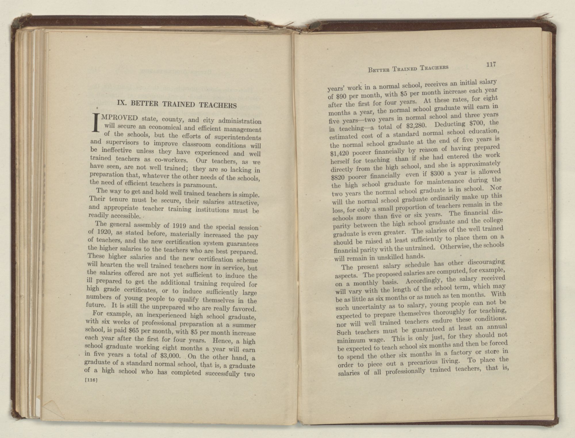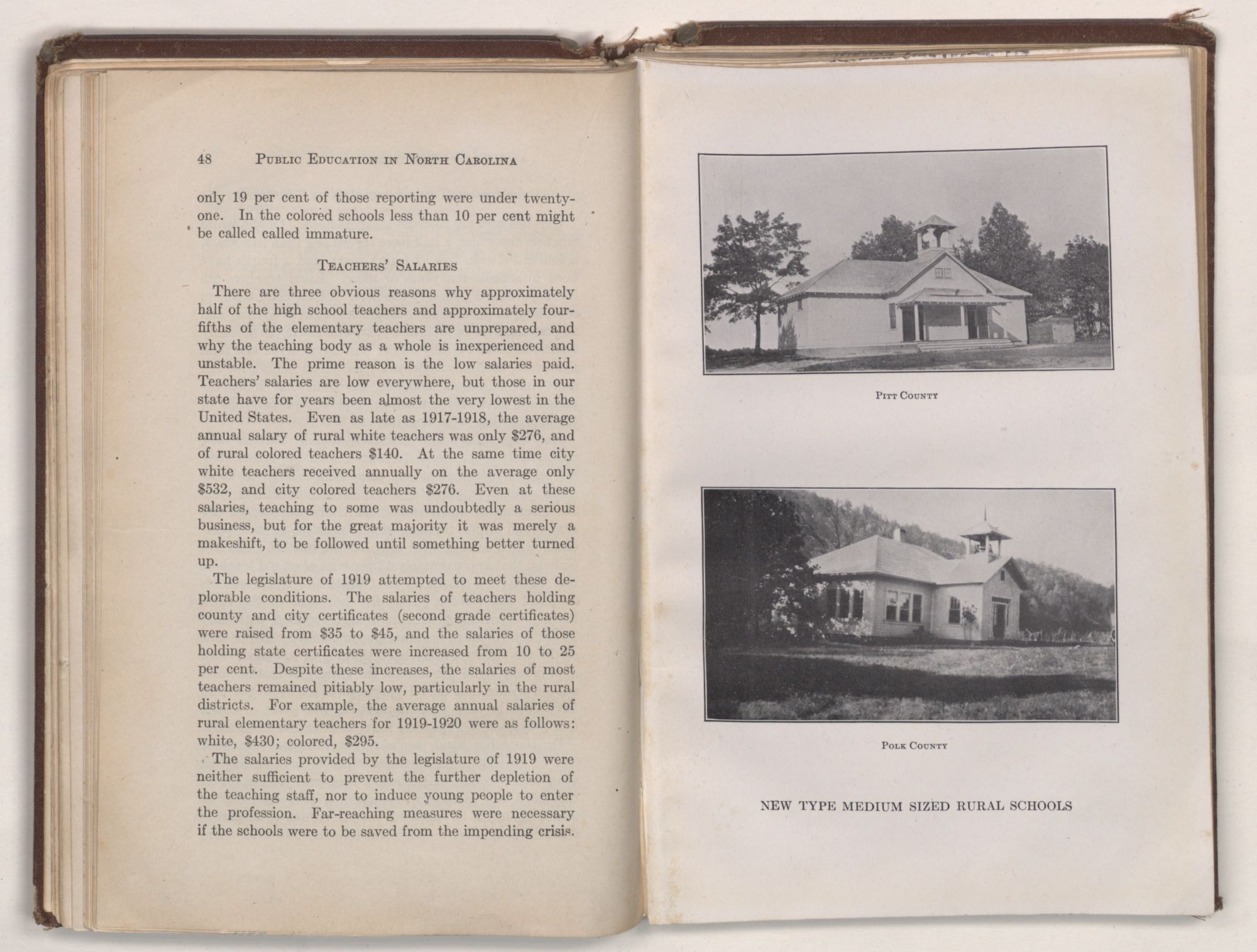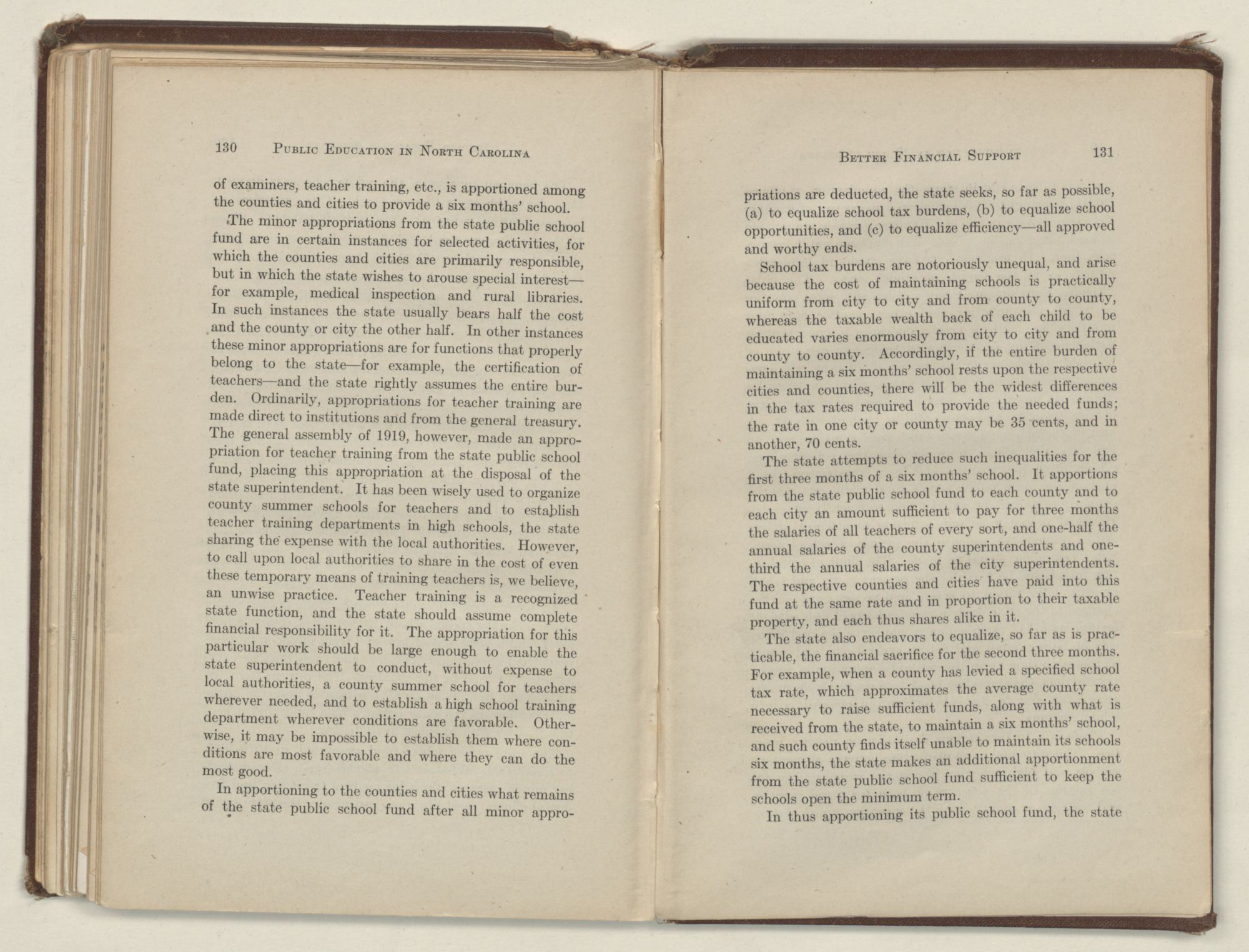 OUR educational progress is obviously conditioned on more liberal financial support. There is not a branch of the system that does not require larger expenditures. More money is needed for grounds, buildings, and equipment, more money to lengthen the school term and broaden school programs, more money for teachers’ salaries, more money for teacher training institutions, more money for administration and supervision—how much more, no one can tell. One thing is certain—it will require more than three times the present amount even to bring present expenditures up to the country-wide average1, and there is no reason to suppose that good schools can be maintained more cheaply in North Carolina than elsewhere.