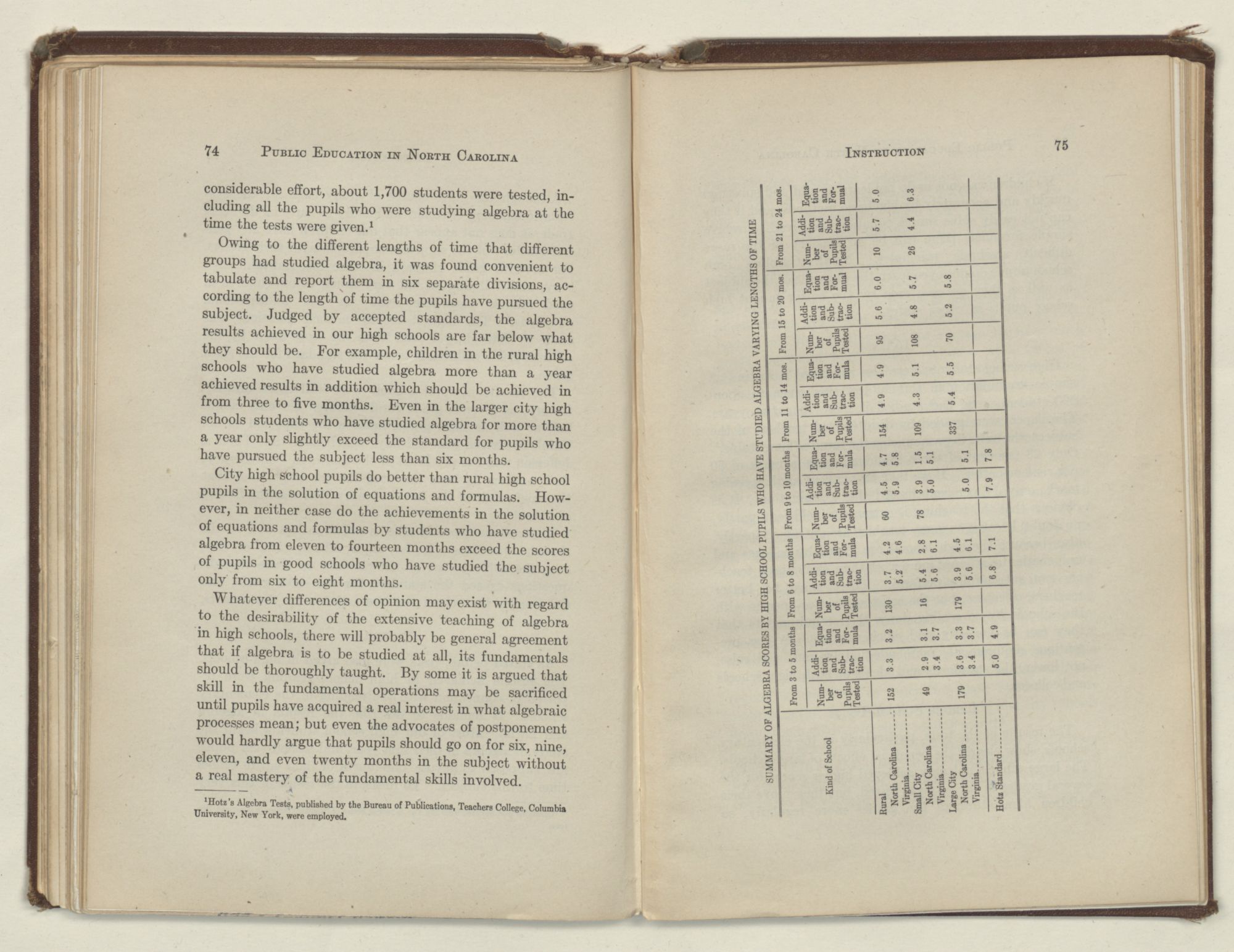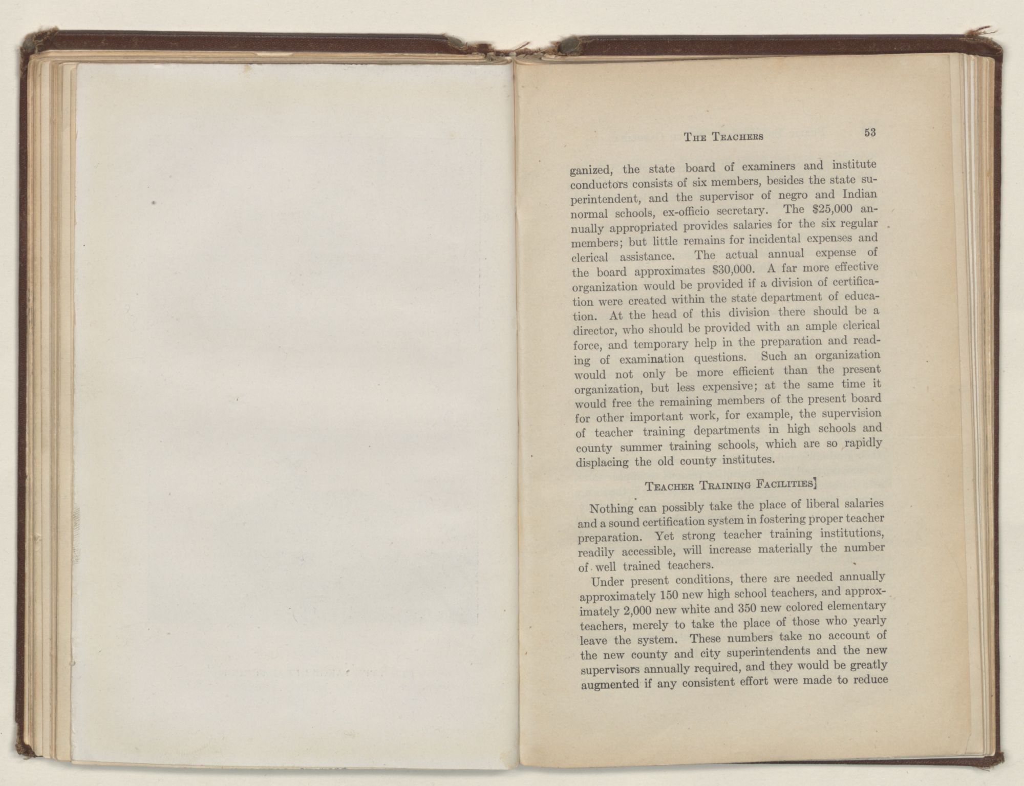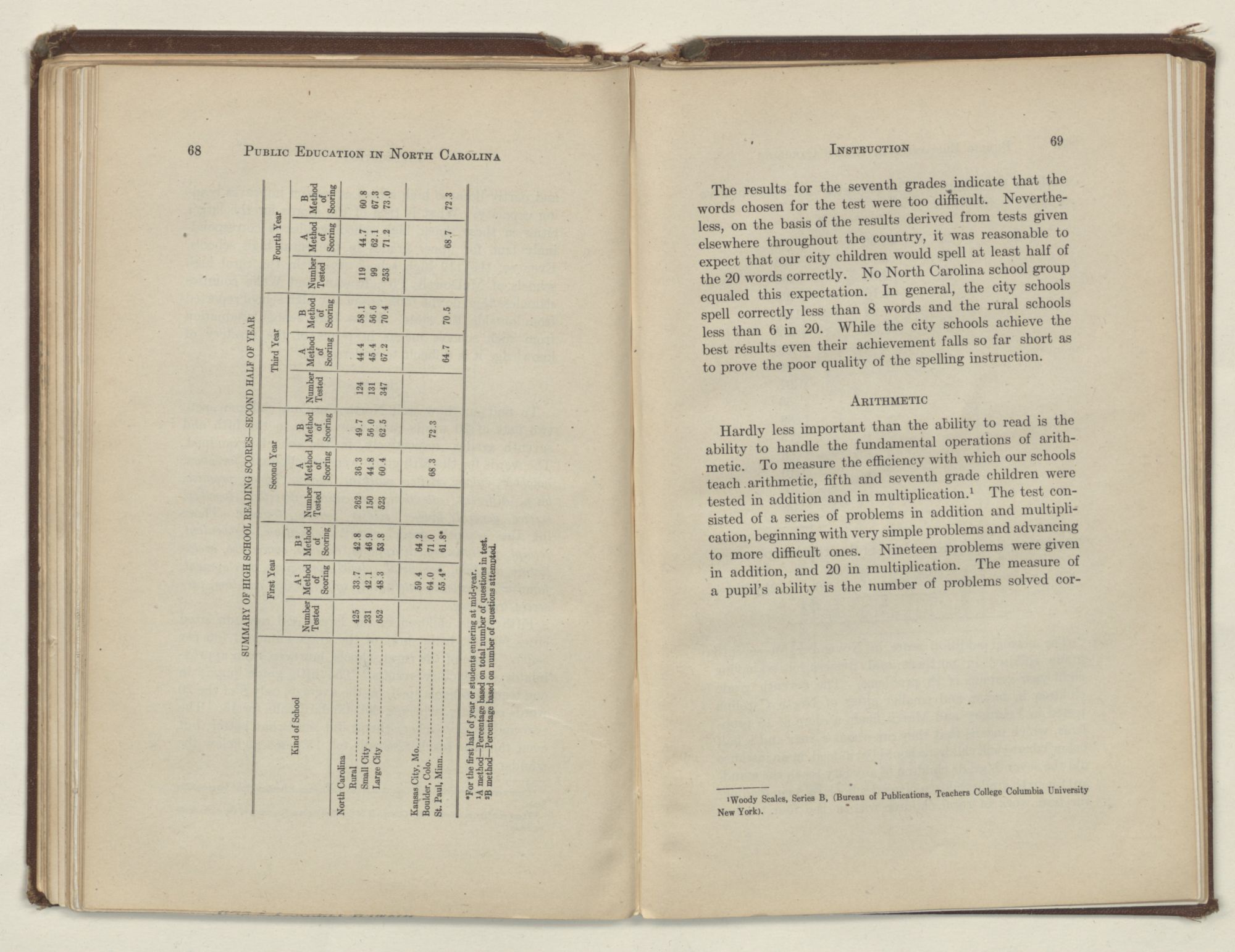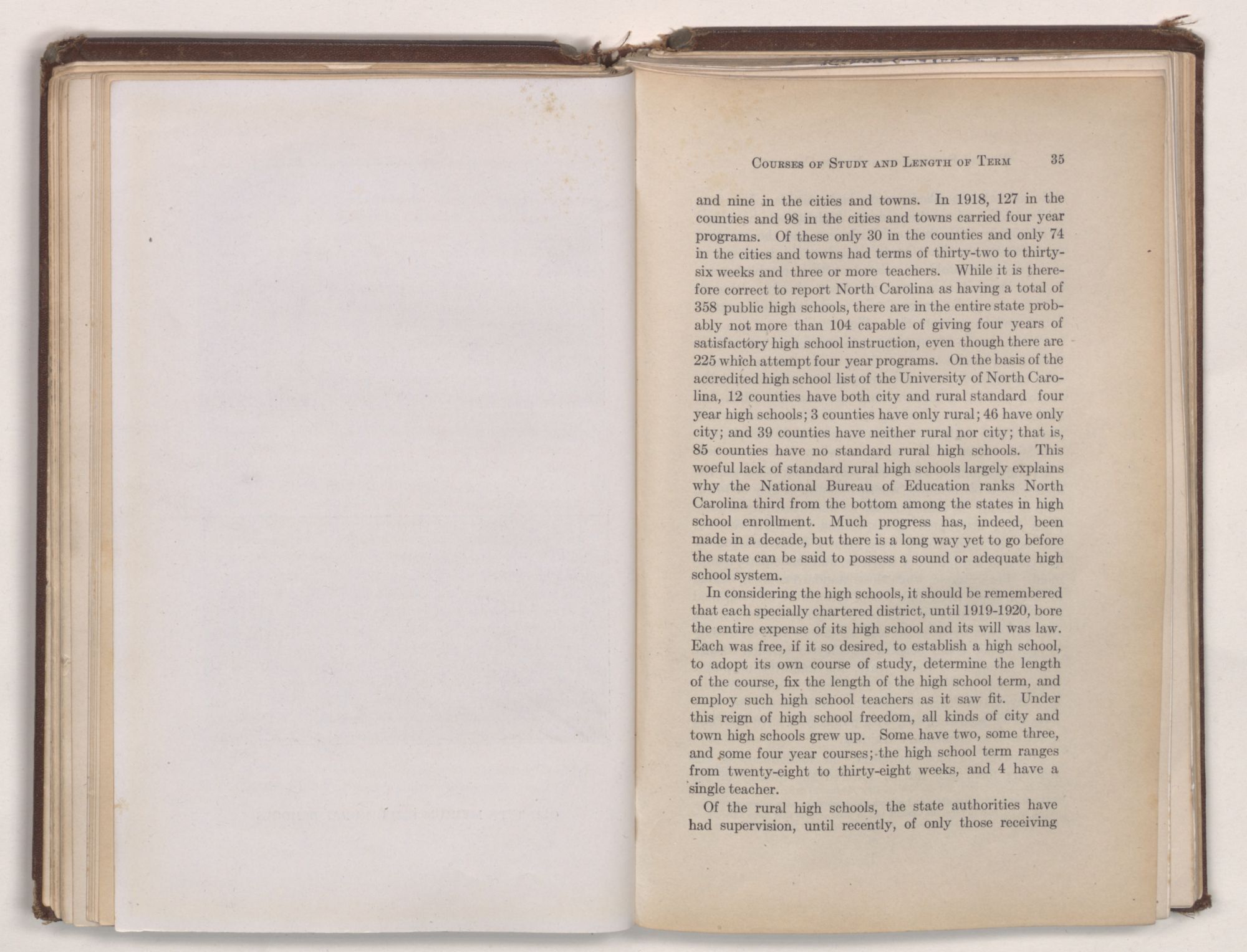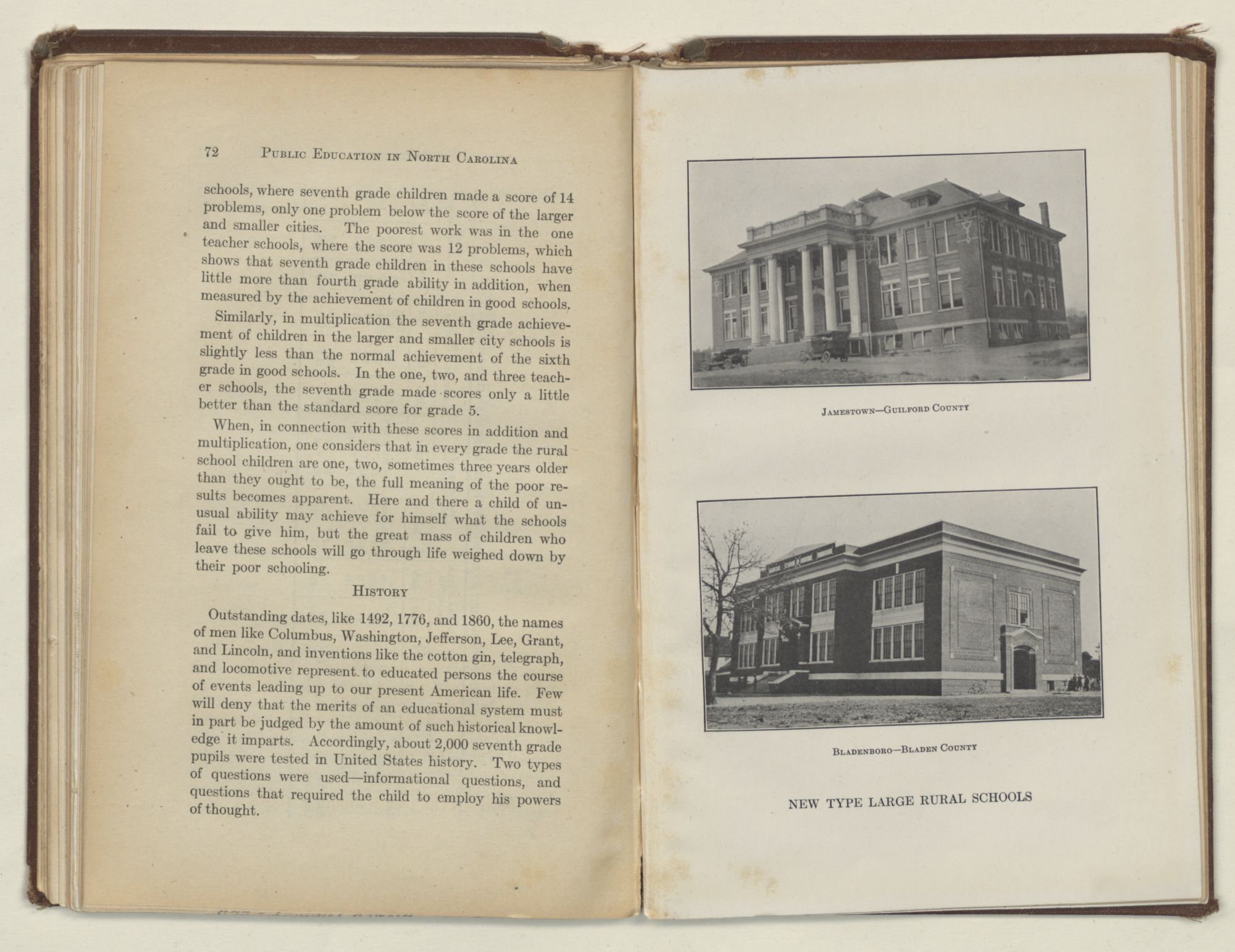 OUR educational progress is obviously conditioned on more liberal financial support. There is not a branch of the system that does not require larger expenditures. More money is needed for grounds, buildings, and equipment, more money to lengthen the school term and broaden school programs, more money for teachers’ salaries, more money for teacher training institutions, more money for administration and supervision—how much more, no one can tell. One thing is certain—it will require more than three times the present amount even to bring present expenditures up to the country-wide average1, and there is no reason to suppose that good schools can be maintained more cheaply in North Carolina than elsewhere.
