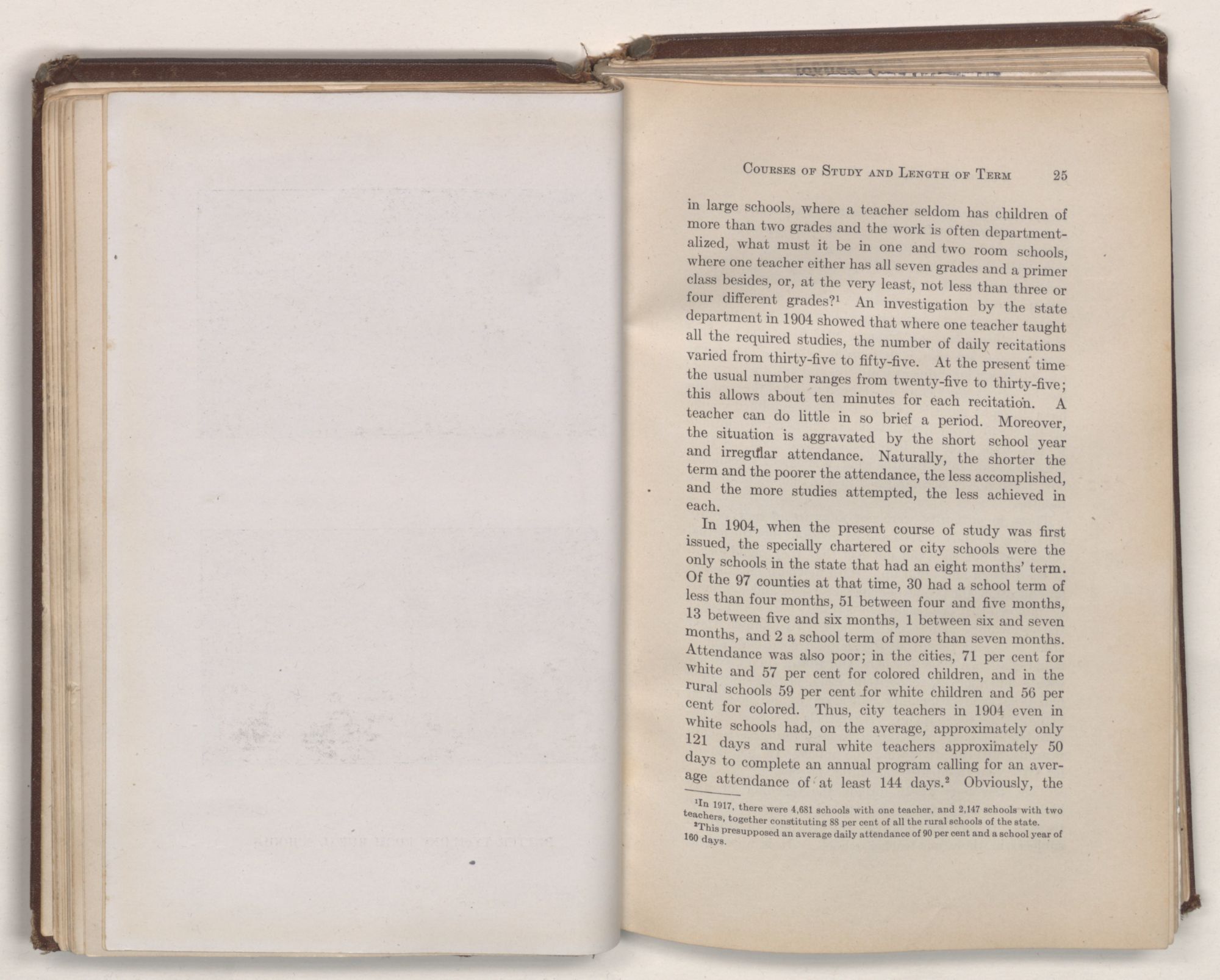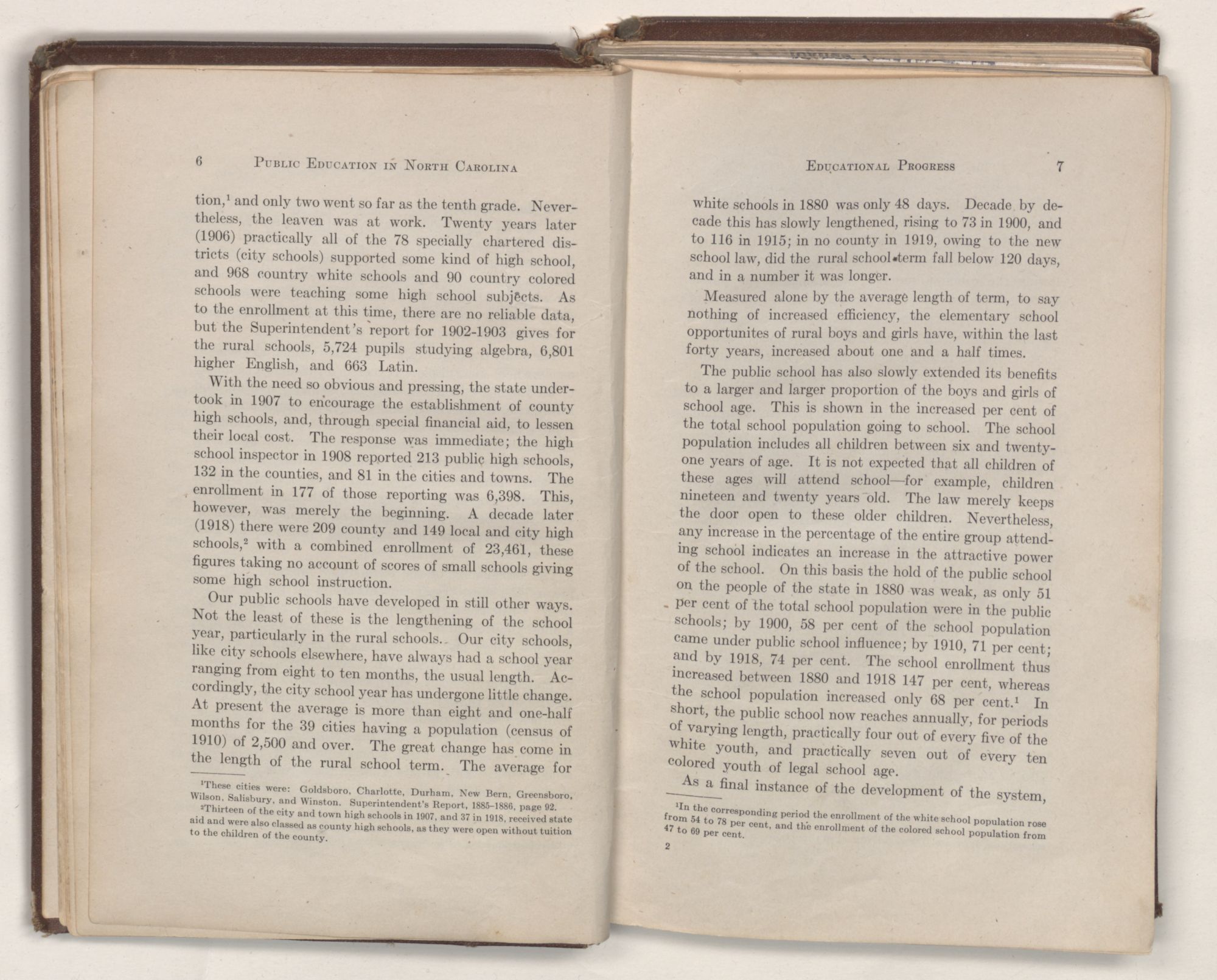 11These cities were: Goldsboro, Charlotte, Durham, New Bern, Greensboro, Wilson, Salisbury, and Winston. Superintendent's Report, 1885-1886, page 92.22Thirteen of the city and town high schools in 1907, and 37 in 1918, received state aid and were also classed as county high schools, as they were open without tuition to the children of the county.white schools in 1880 was only 48 days. Decade by decade this has slowly lengthened, rising to 73 in 1900, and to 116 in 1915; in no county in 1919, owing to the new school law, did the rural school term fall below 120 days, and in a number it was longer.