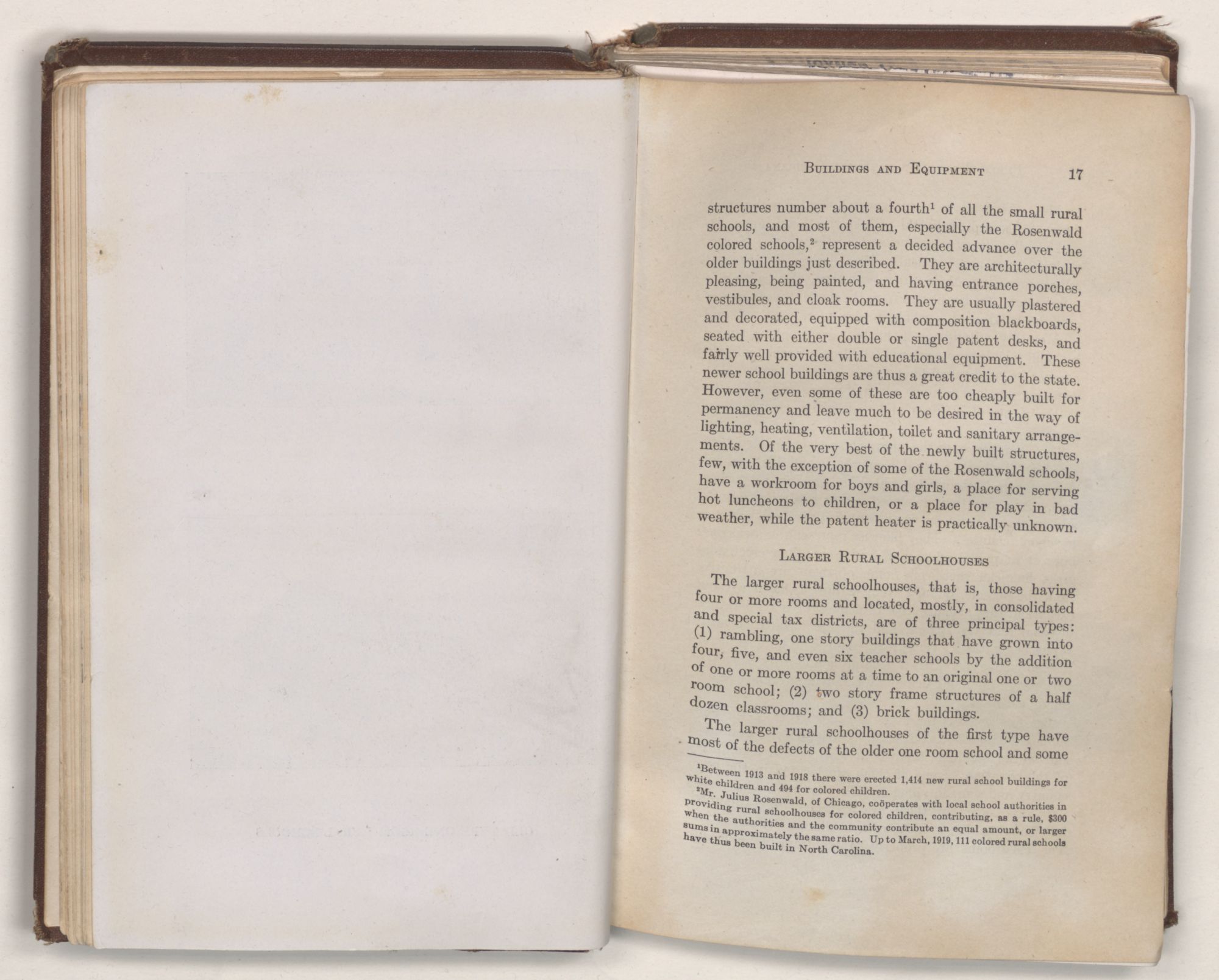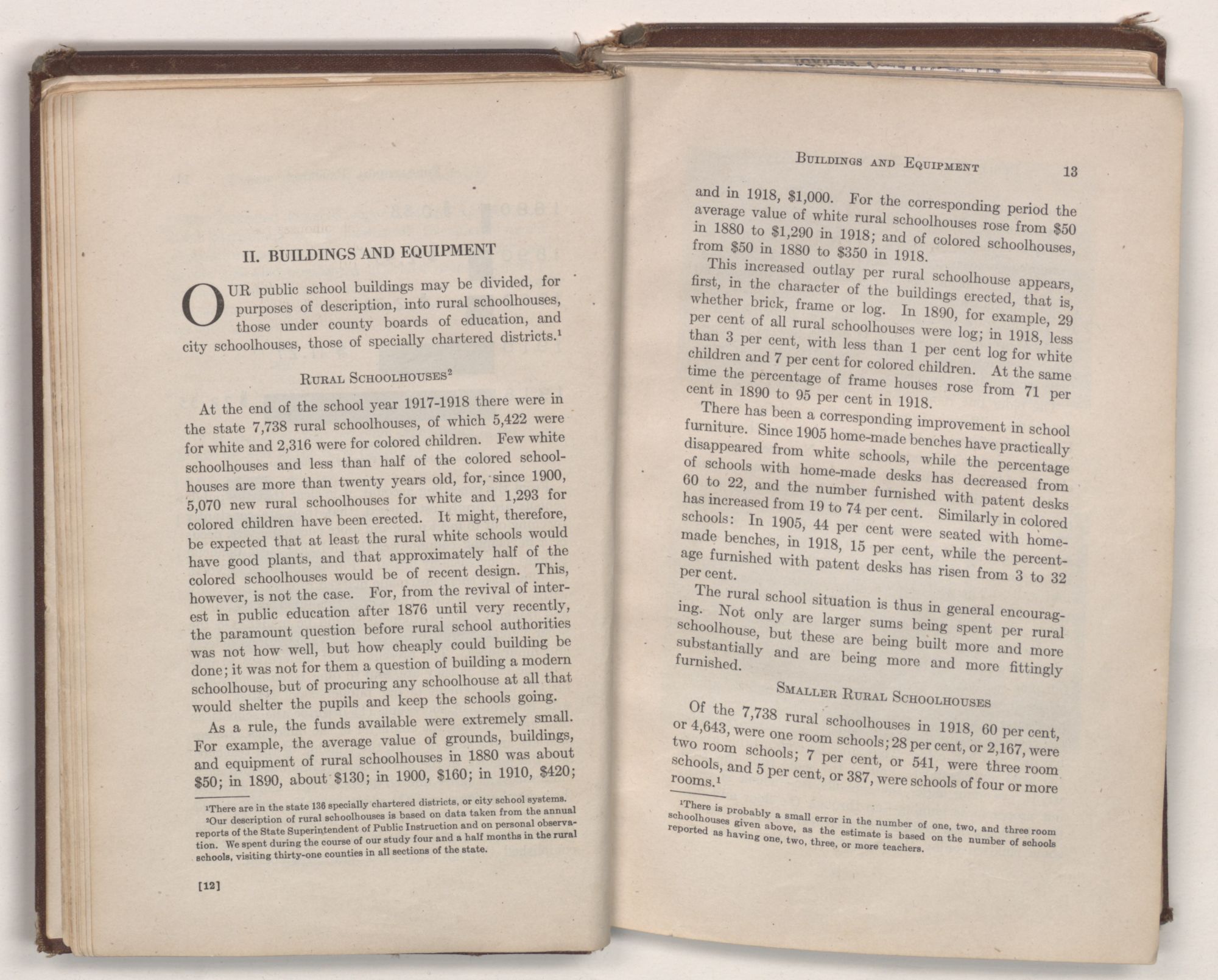 RURAL SCHOOLHOUSES2At the end of the school year 1917-1918 there were in the state 7,738 rural schoolhouses, of which 5,422 were for white and 2,316 were for colored children. Few white schoolhouses and less than half of the colored schoolhouses are more than twenty years old, for, since 1900, 5,070 new rural schoolhouses for white and 1,293 for colored children have been erected. It might, therefore, be expected that at least the rural white schools would have good plants, and that approximately half of the colored schoolhouses would be of recent design. This, however, is not the case. For, from the revival of interest in public education after 1876 until very recently, the paramount question before rural school authorities was not how well, but how cheaply could building be done; it was not for them a question of building a modern schoolhouse, but of procuring any schoolhouse at all that would shelter the pupils and keep the schools going.