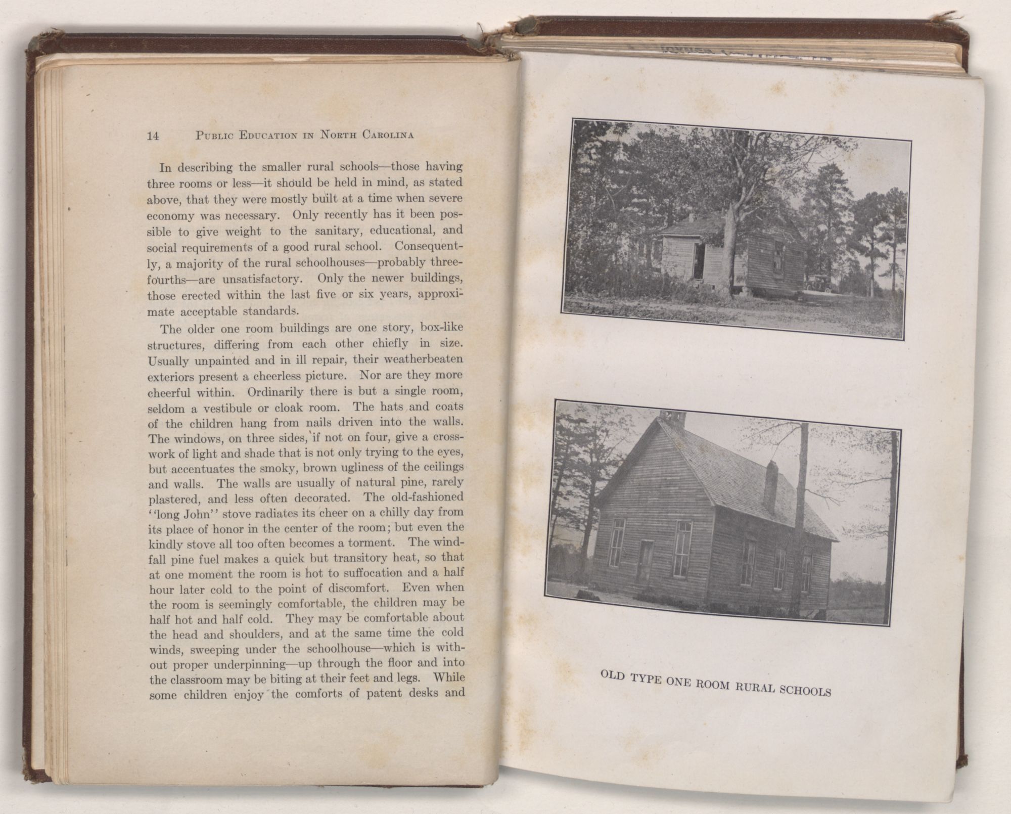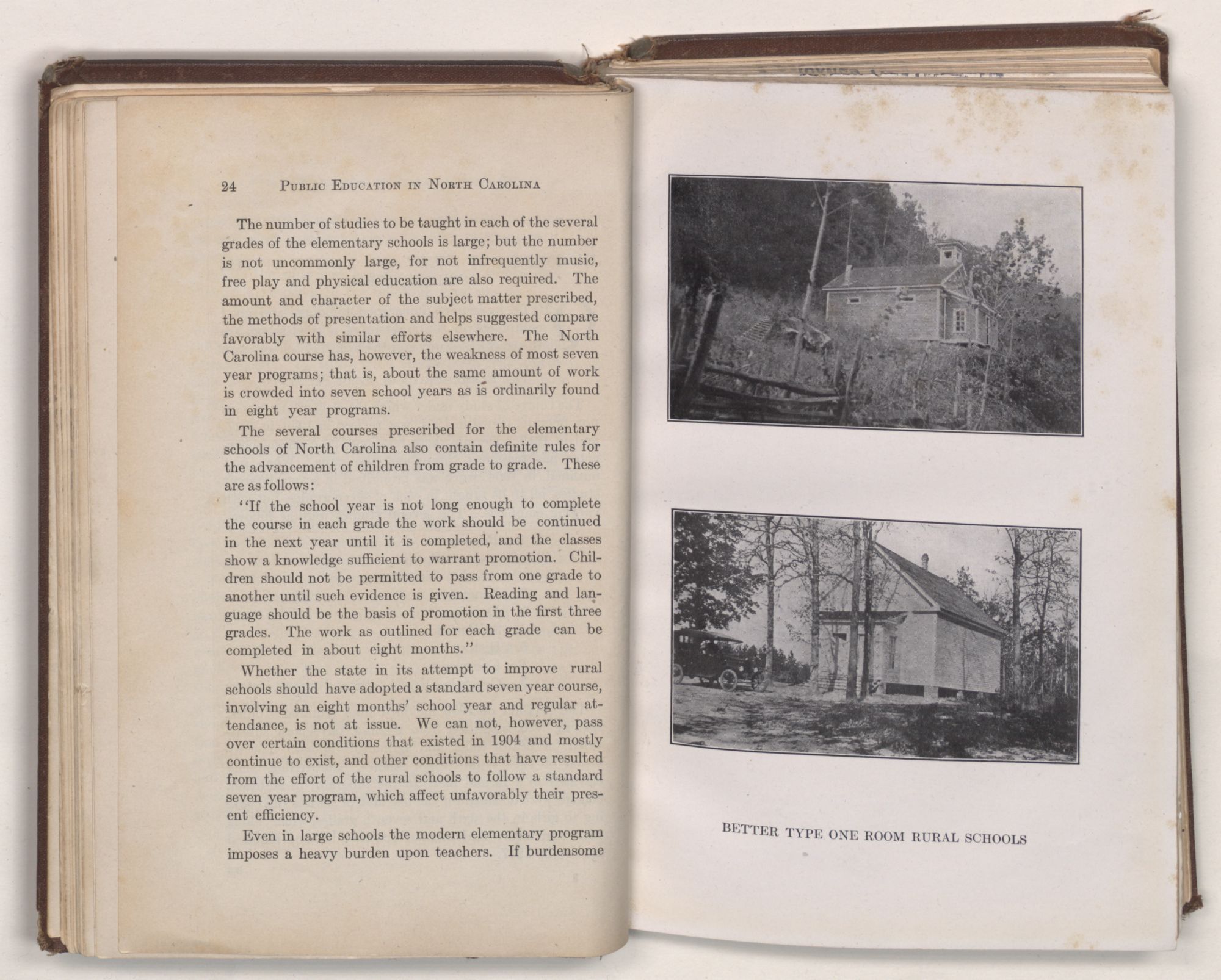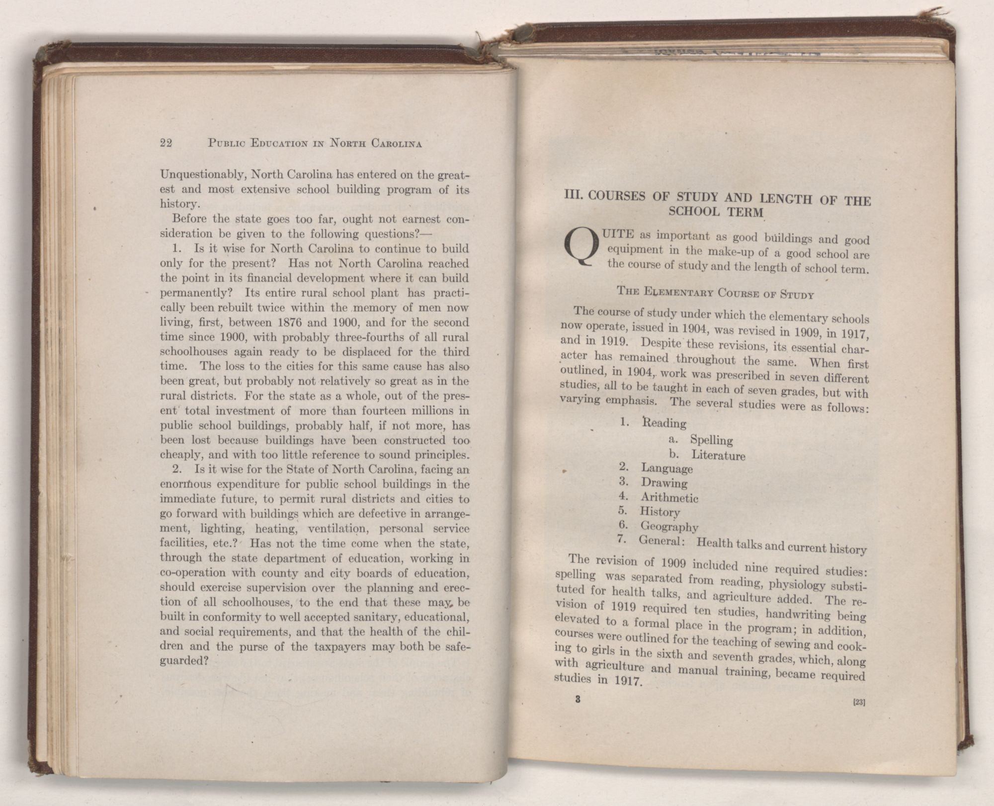 The study program of the first public elementary schools as elsewhere was simple: It included the merest elements of an English education—reading, spelling, writing, and arithmetic, with an occasional class in grammar and geography. From time to time other studies have been added, so that now all public elementary schools must, according to the law, teach reading, spelling, writing, arithmetic, drawing, language lessons, and composition, English grammar, geography, history of North Carolina and of the United States, the elements of agriculture, elementary physiology and hygiene, home economics for girls and manual training for boys.