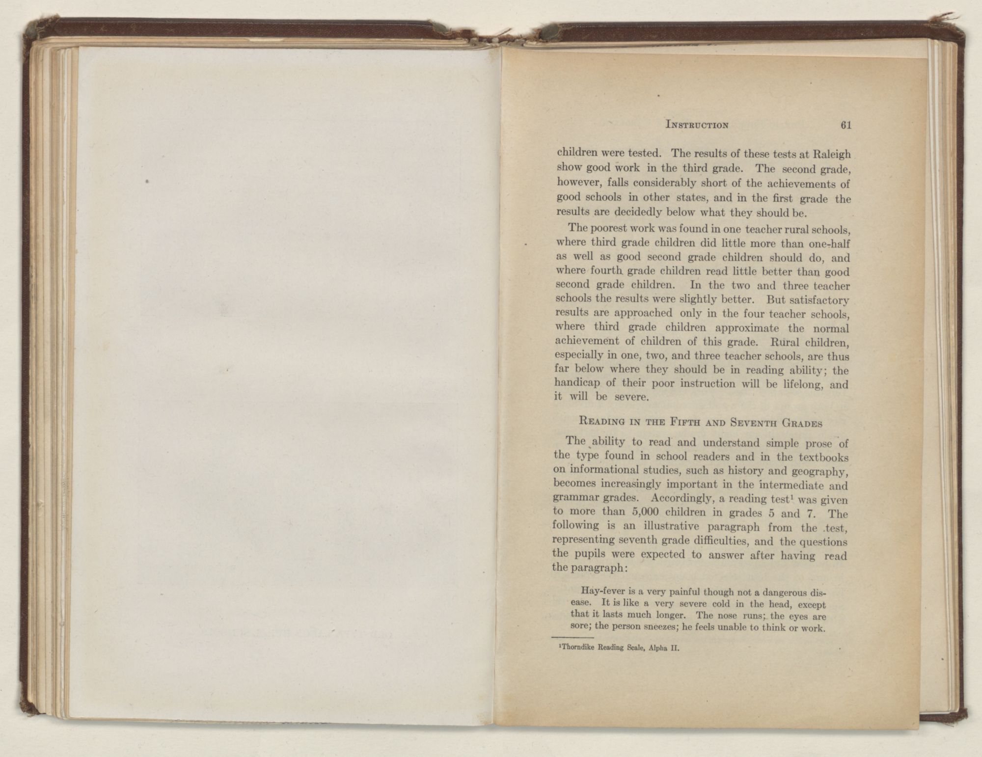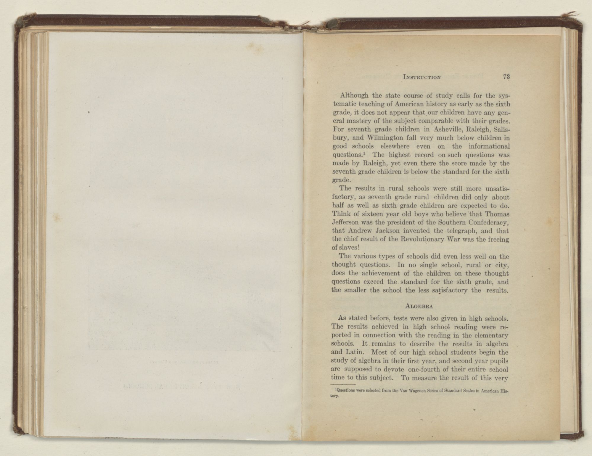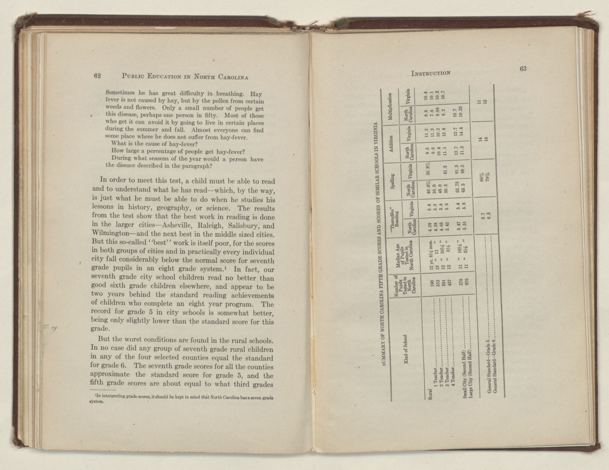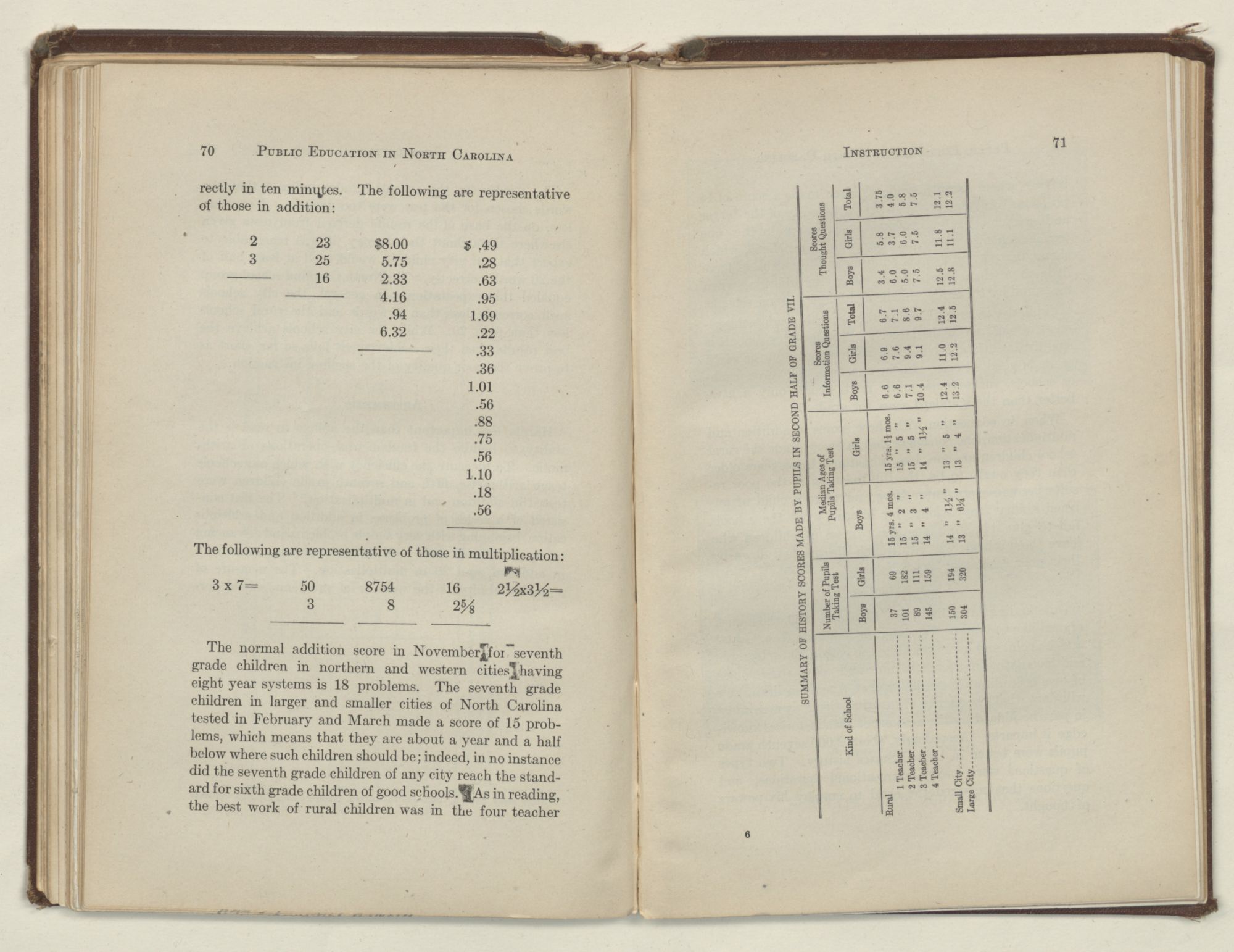 The study program of the first public elementary schools as elsewhere was simple: It included the merest elements of an English education—reading, spelling, writing, and arithmetic, with an occasional class in grammar and geography. From time to time other studies have been added, so that now all public elementary schools must, according to the law, teach reading, spelling, writing, arithmetic, drawing, language lessons, and composition, English grammar, geography, history of North Carolina and of the United States, the elements of agriculture, elementary physiology and hygiene, home economics for girls and manual training for boys.