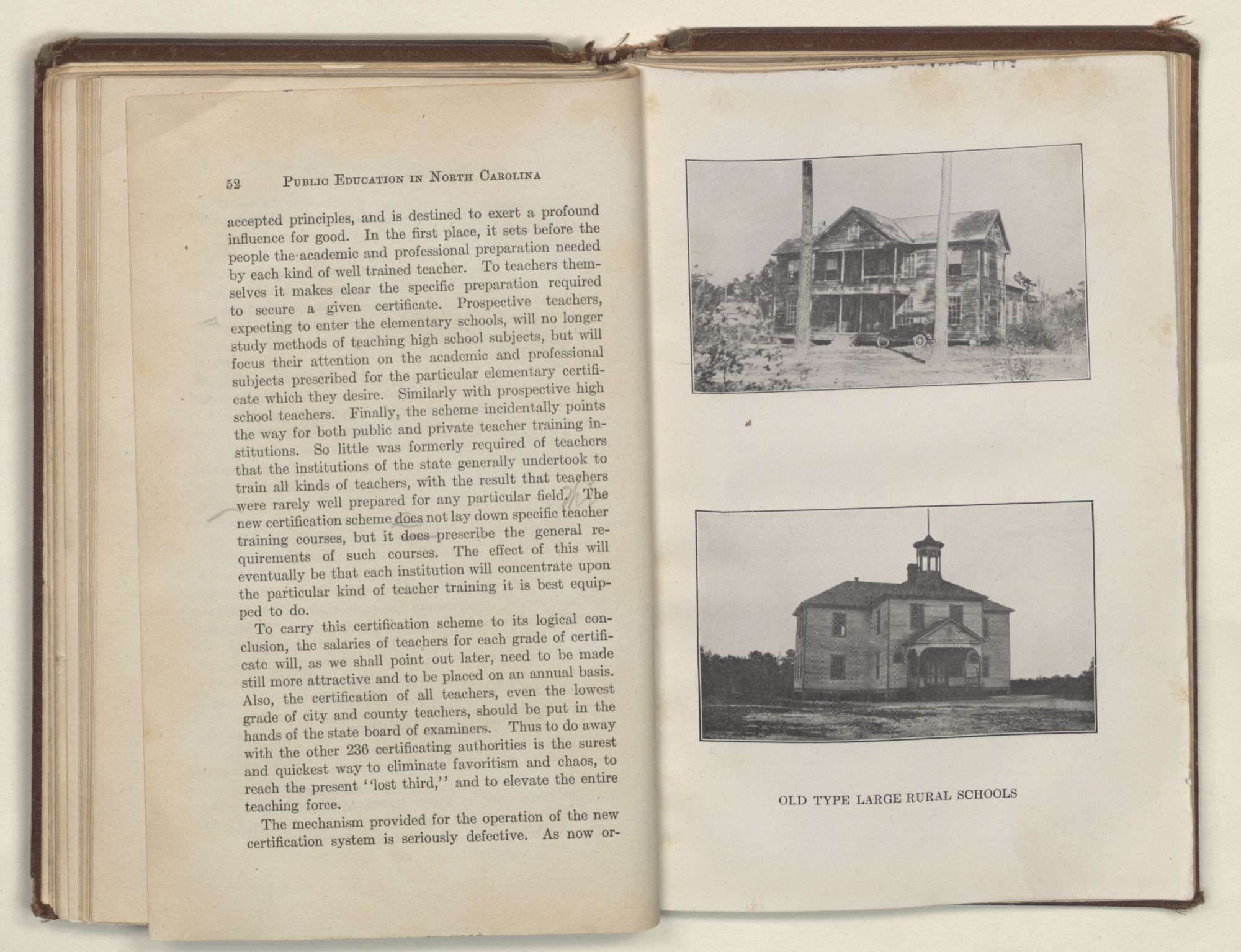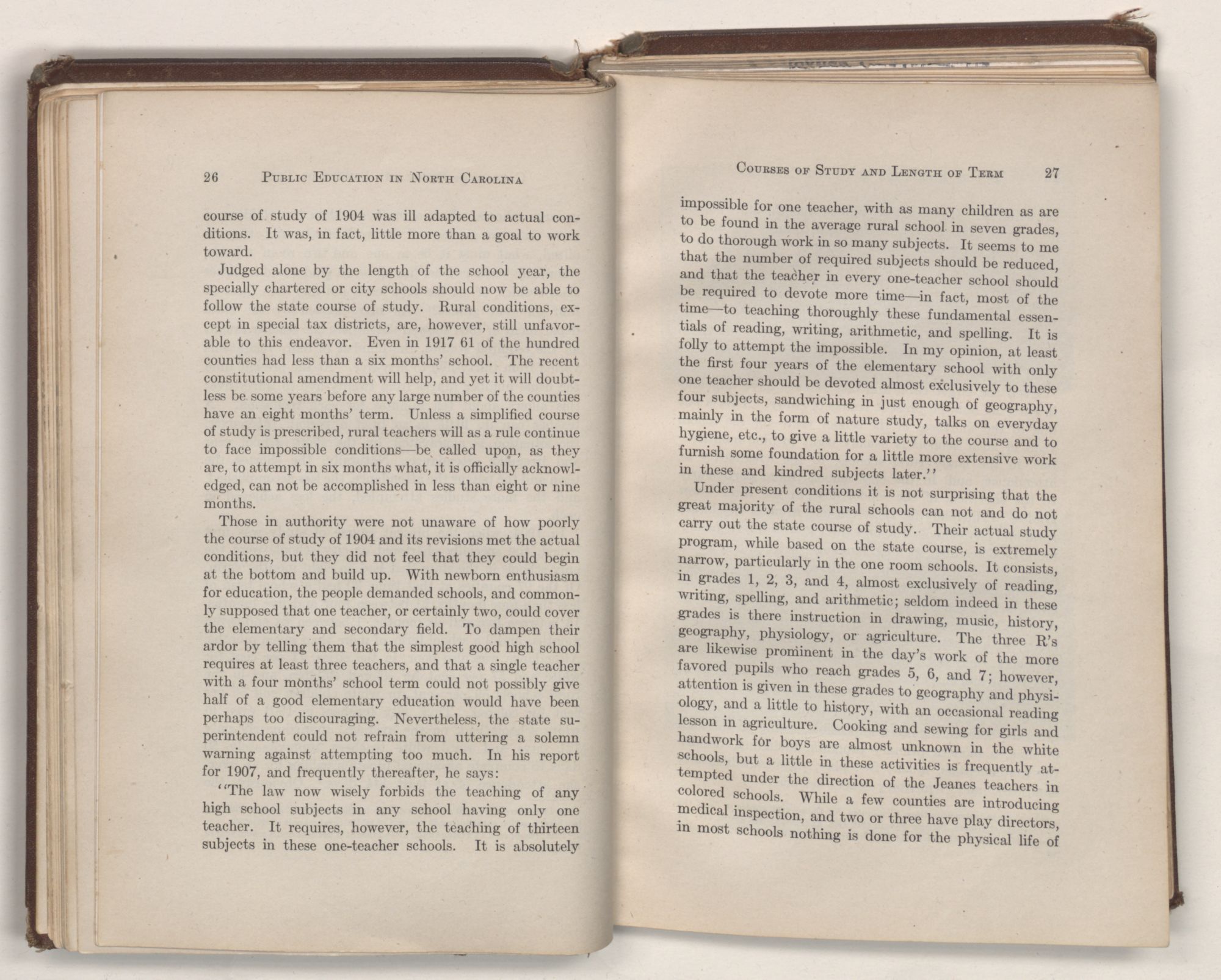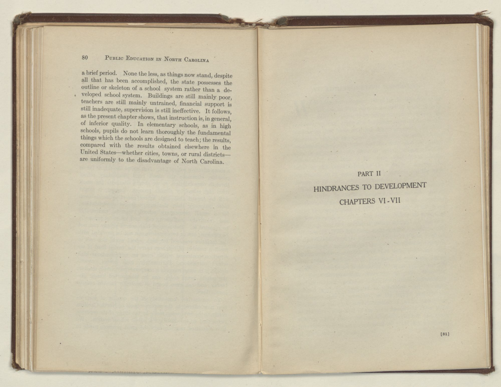 From the preceding account, it is clear that the public schools are firmly established, that they are constantly reaching out to meet more and more adequately the needs of a developing commonwealth, and that their financial support is increasingly liberal. Public education in North Carolina has, therefore, made marked progress, especially within the last twenty years. Of this progress the fullest and frankest acknowledgment should be made. On the other hand, careful investigation reveals serious defects and hindrances. The present report undertakes to present the facts as they are, and to offer recommendations for the improvement of our public school system. We will, therefore, in succession (1) describe the schools as they are, including the character of the buildings, courses of study and length of term, the training of the teachers, and the quality of the instruction; (2) inquire into such hindrances as have limited their service and retarded their development; and (3) point out what steps should be taken at this time to widen their influence and increase their efficiency, particularly in so far as this can be accomplished through legislation and state action.