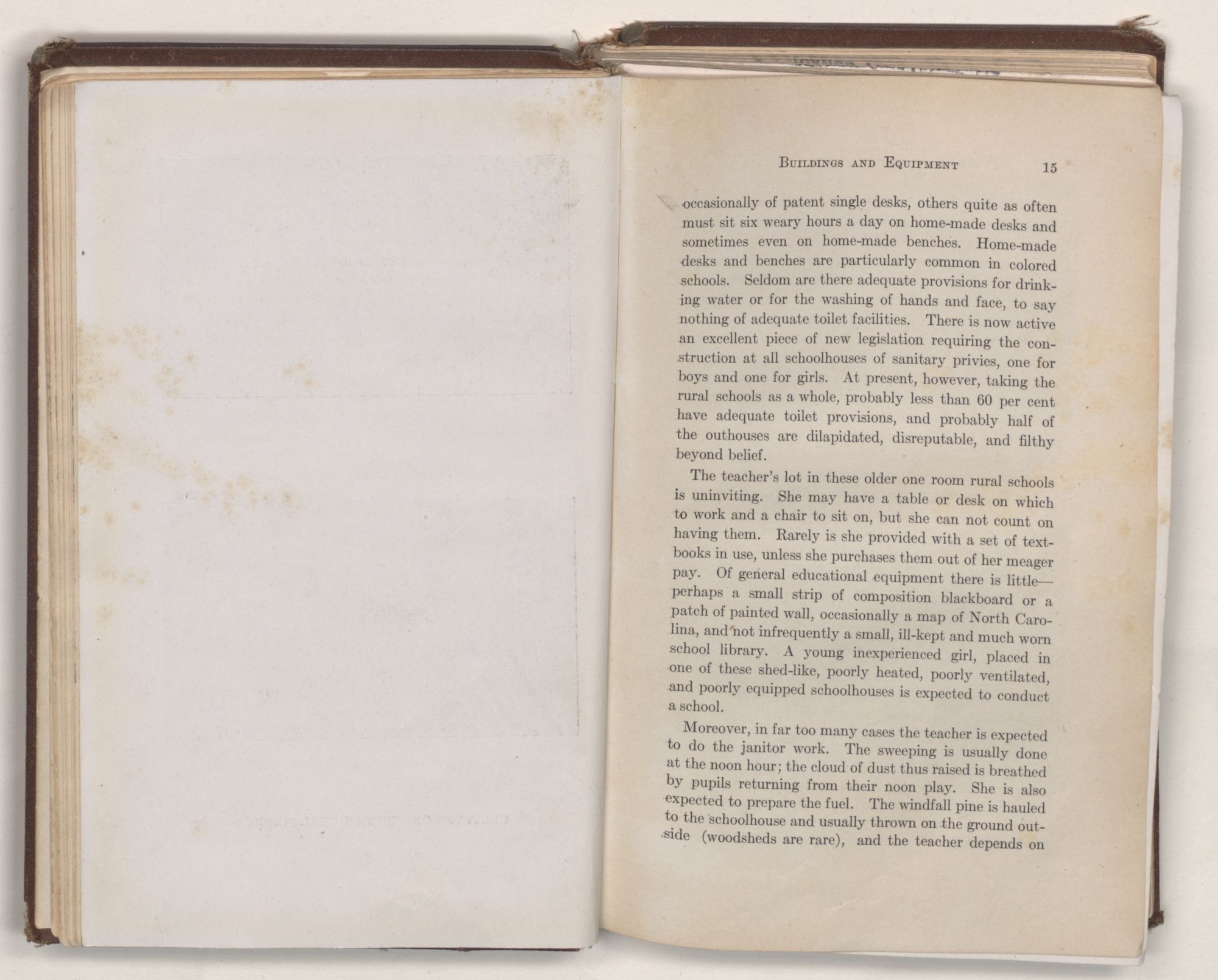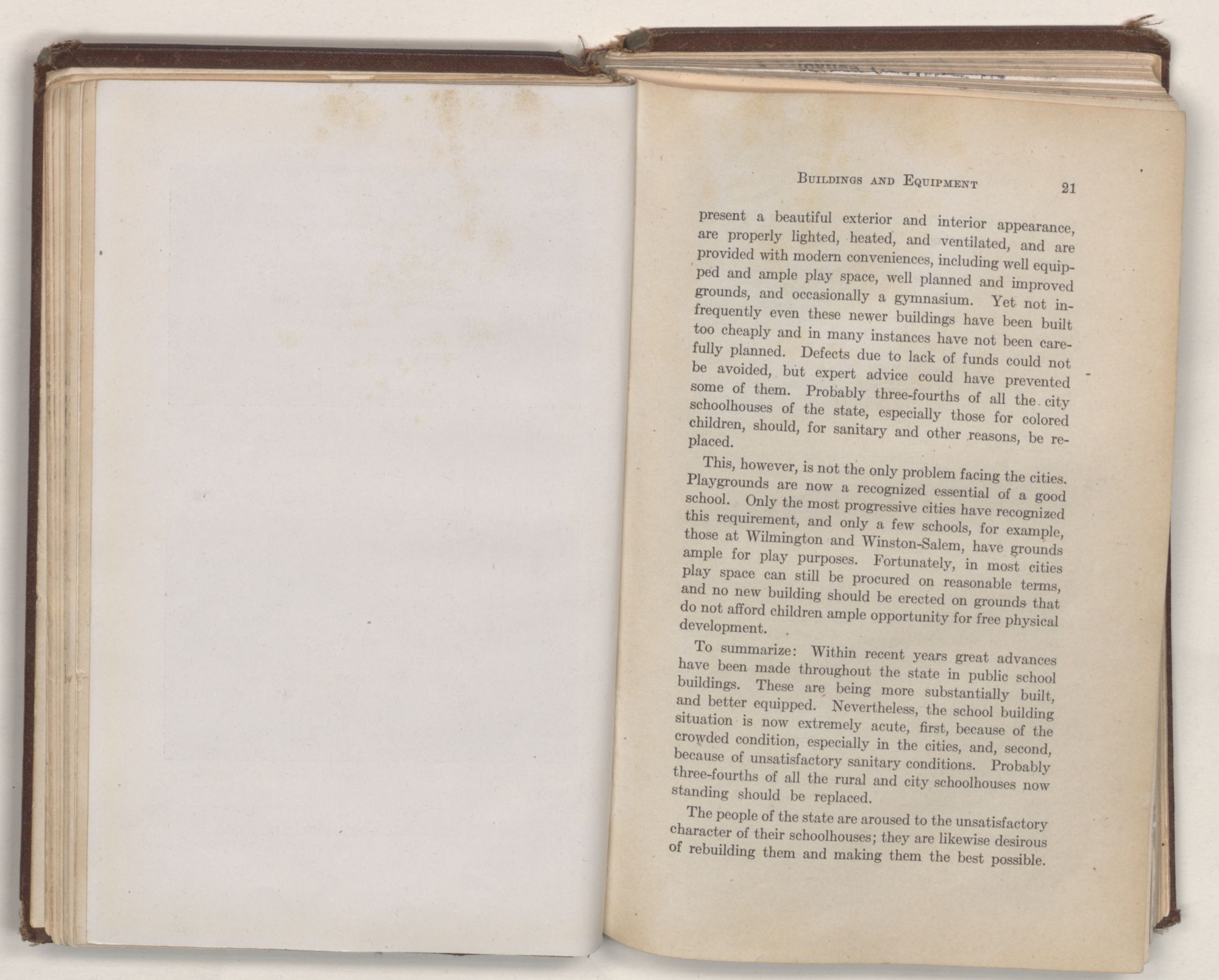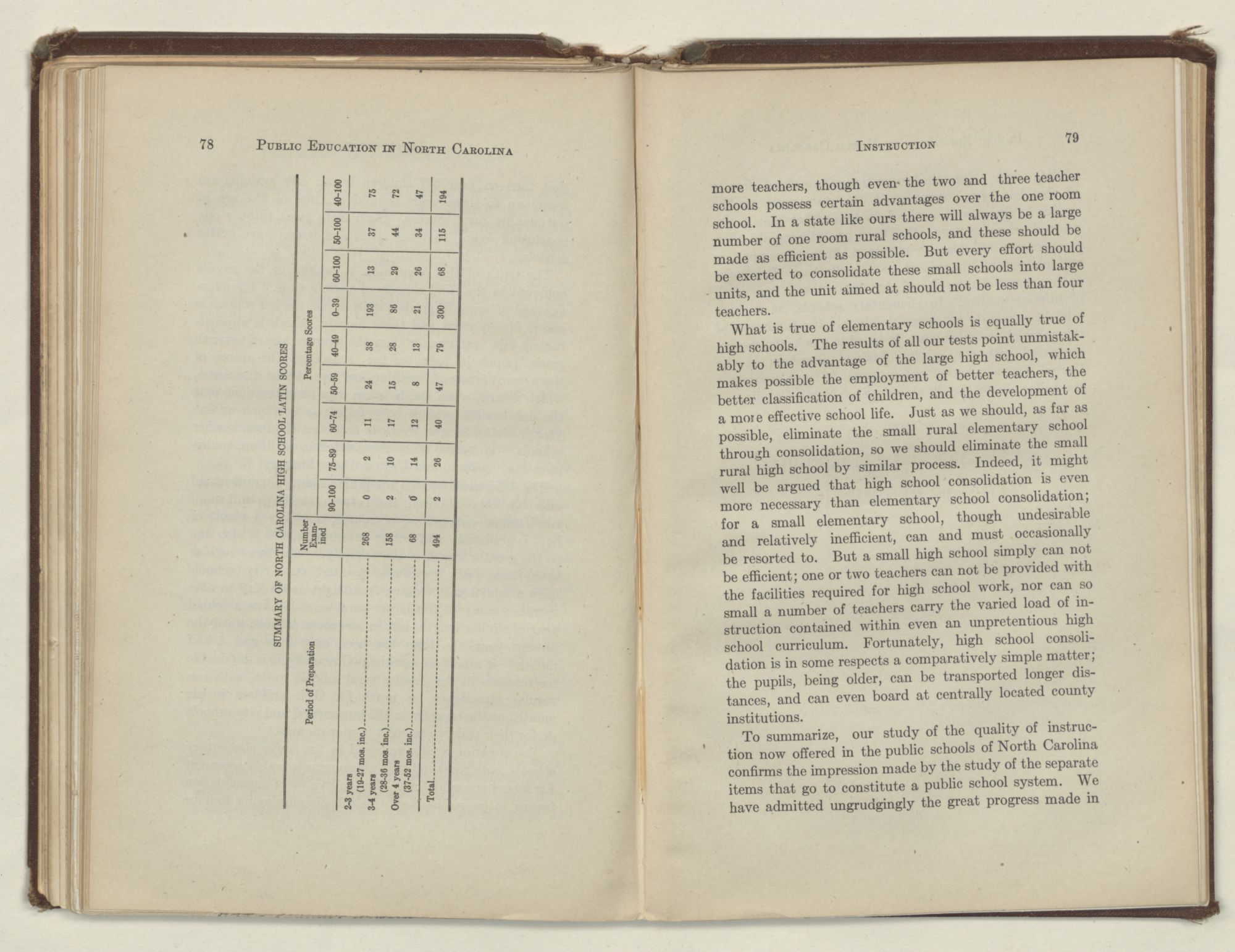 From the preceding account, it is clear that the public schools are firmly established, that they are constantly reaching out to meet more and more adequately the needs of a developing commonwealth, and that their financial support is increasingly liberal. Public education in North Carolina has, therefore, made marked progress, especially within the last twenty years. Of this progress the fullest and frankest acknowledgment should be made. On the other hand, careful investigation reveals serious defects and hindrances. The present report undertakes to present the facts as they are, and to offer recommendations for the improvement of our public school system. We will, therefore, in succession (1) describe the schools as they are, including the character of the buildings, courses of study and length of term, the training of the teachers, and the quality of the instruction; (2) inquire into such hindrances as have limited their service and retarded their development; and (3) point out what steps should be taken at this time to widen their influence and increase their efficiency, particularly in so far as this can be accomplished through legislation and state action.
