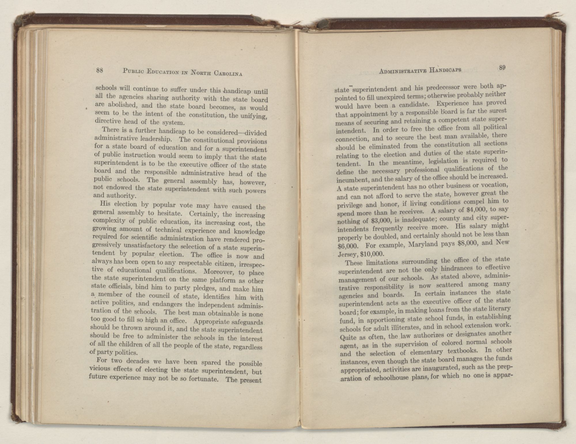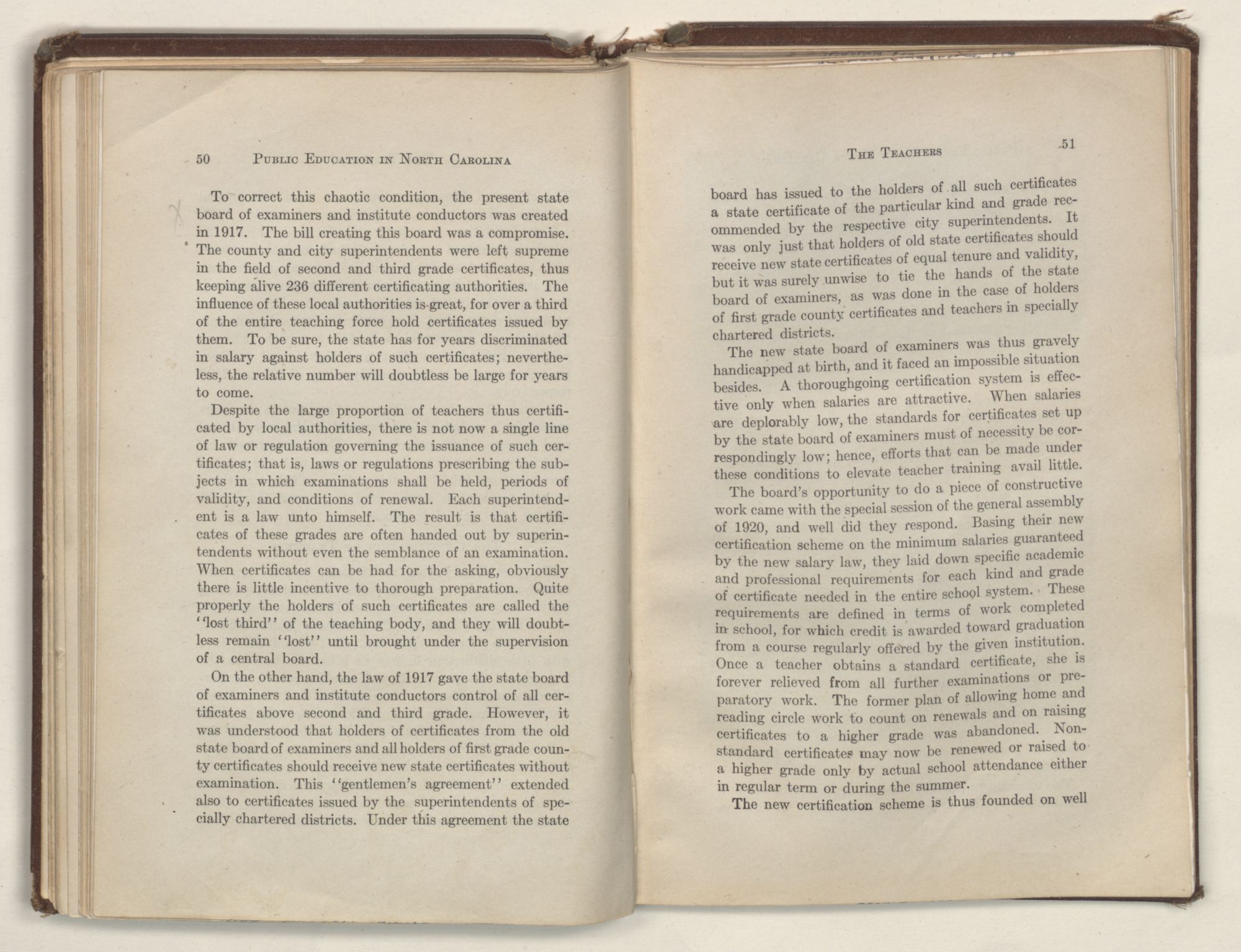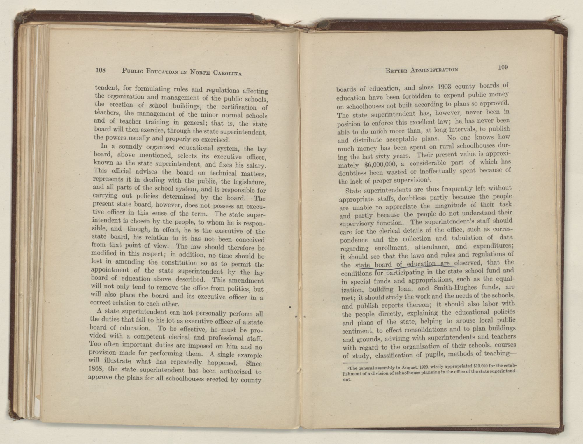 The State Department of Education, under the direction of Dr. E. C. Brooks, Superintendent of Public Instruction, has given the commission invaluable assistance and most effective co-operation. In addition to this we have had in conference with us many city superintendents, county superintendents, teachers of education in public and private schools, and a committee from the State Teachers’ Assembly, a committee from the Department of School Boards, and a committee appointed by the Citizens’ Conference on Education in North Carolina, held at the North Carolina College for Women in May, 1920. We have thus freely consulted the educational workers and interested citizens