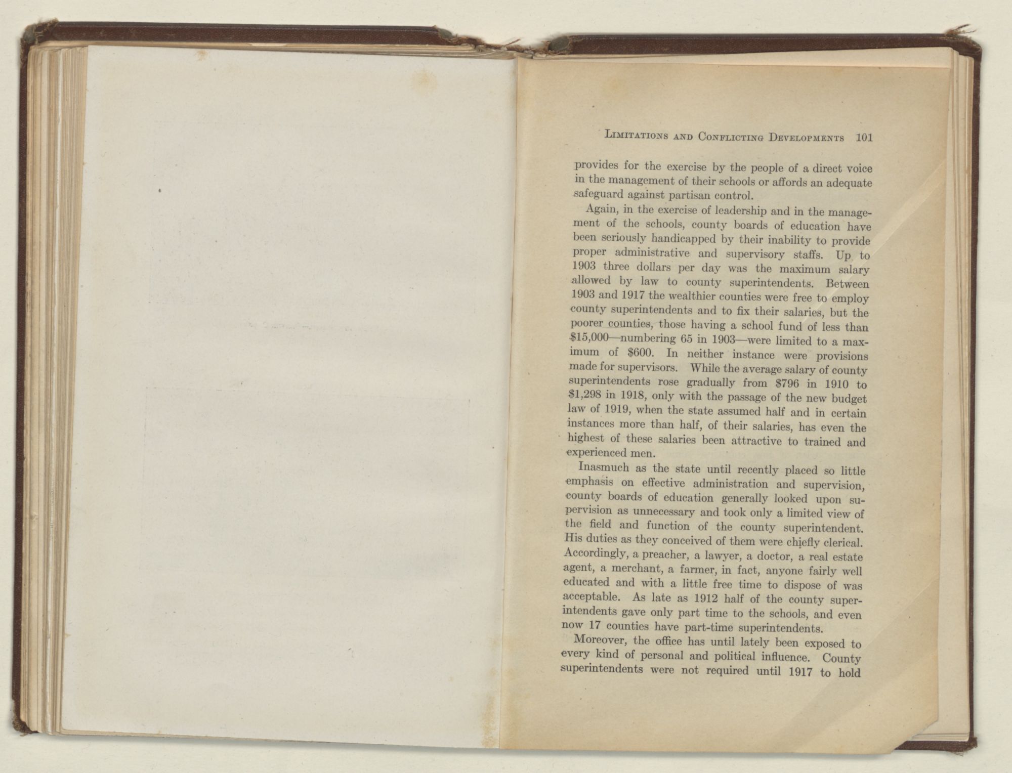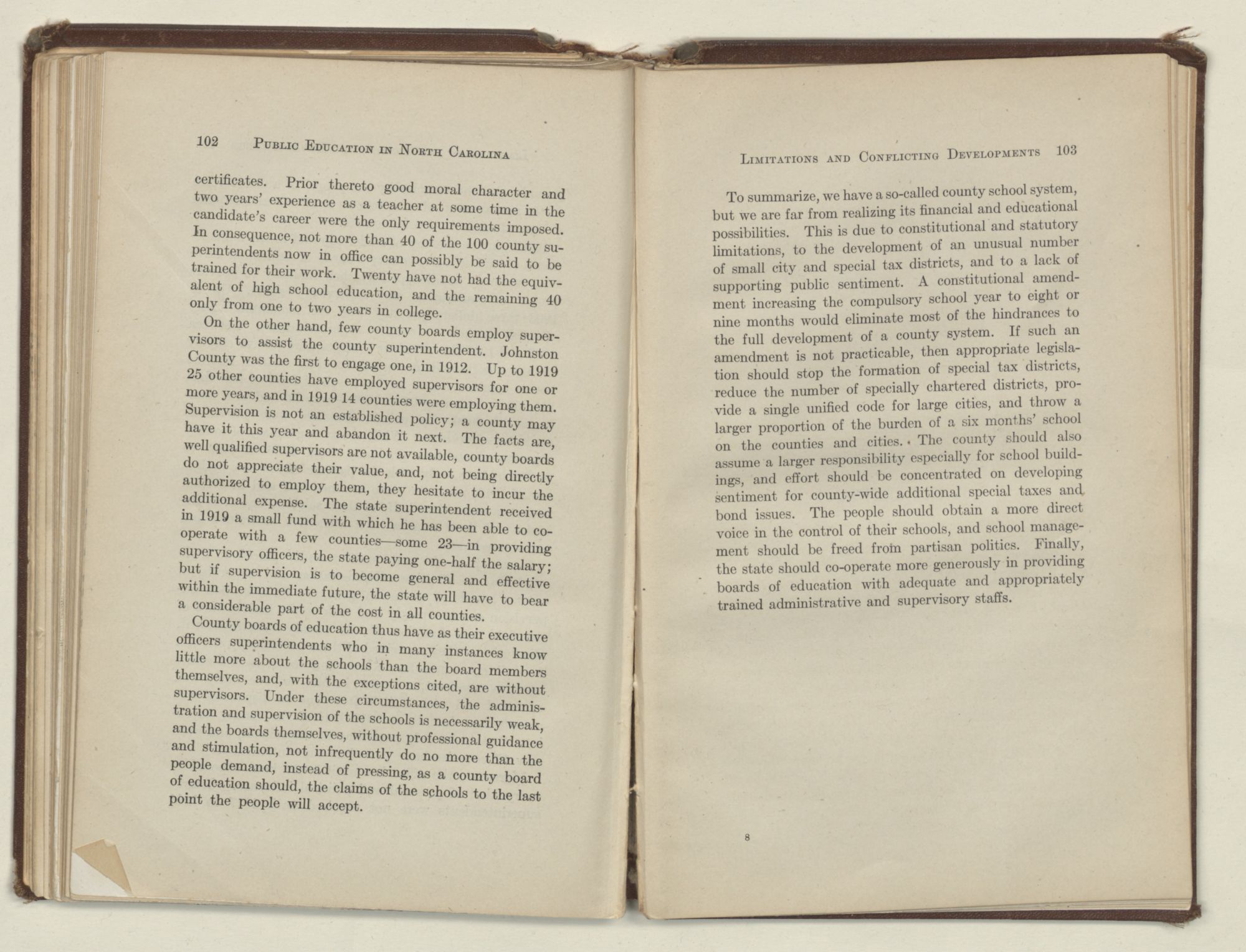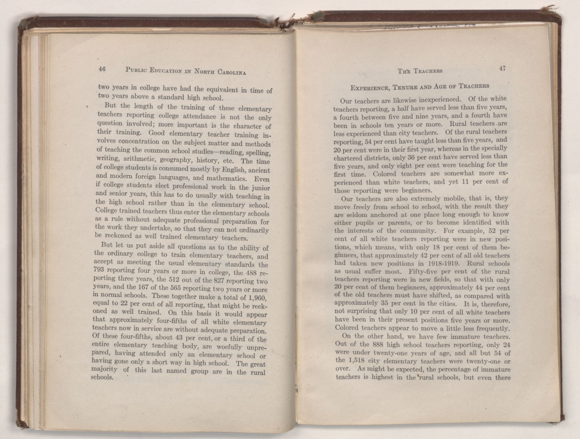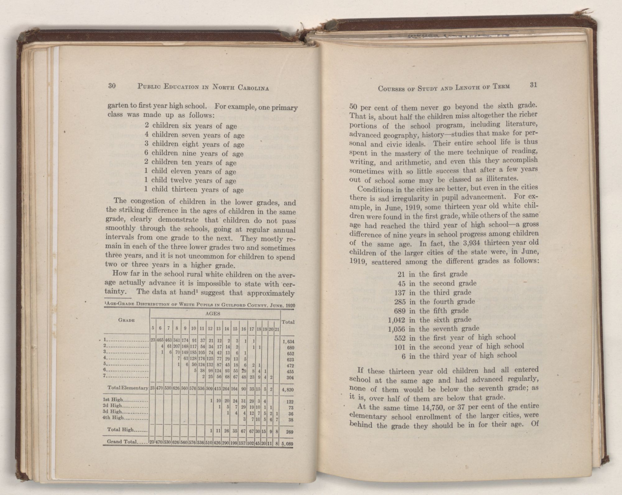 The State Department of Education, under the direction of Dr. E. C. Brooks, Superintendent of Public Instruction, has given the commission invaluable assistance and most effective co-operation. In addition to this we have had in conference with us many city superintendents, county superintendents, teachers of education in public and private schools, and a committee from the State Teachers’ Assembly, a committee from the Department of School Boards, and a committee appointed by the Citizens’ Conference on Education in North Carolina, held at the North Carolina College for Women in May, 1920. We have thus freely consulted the educational workers and interested citizens