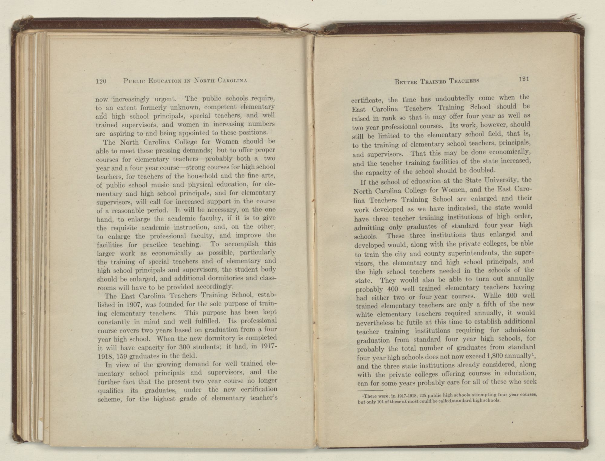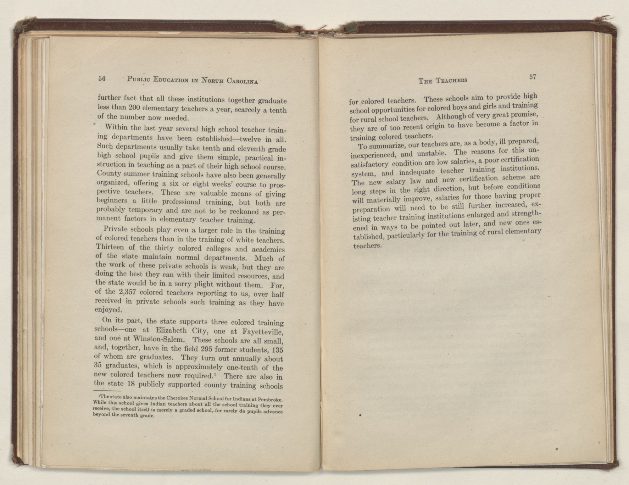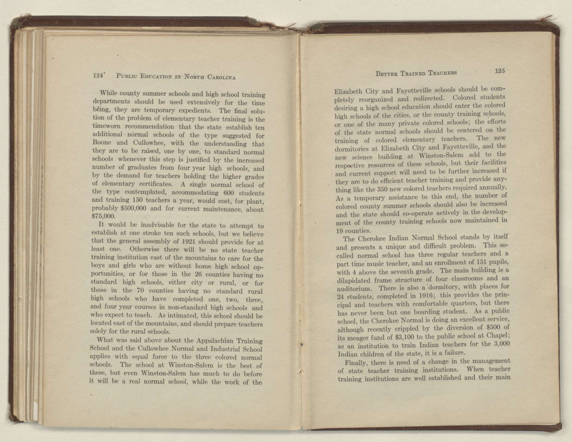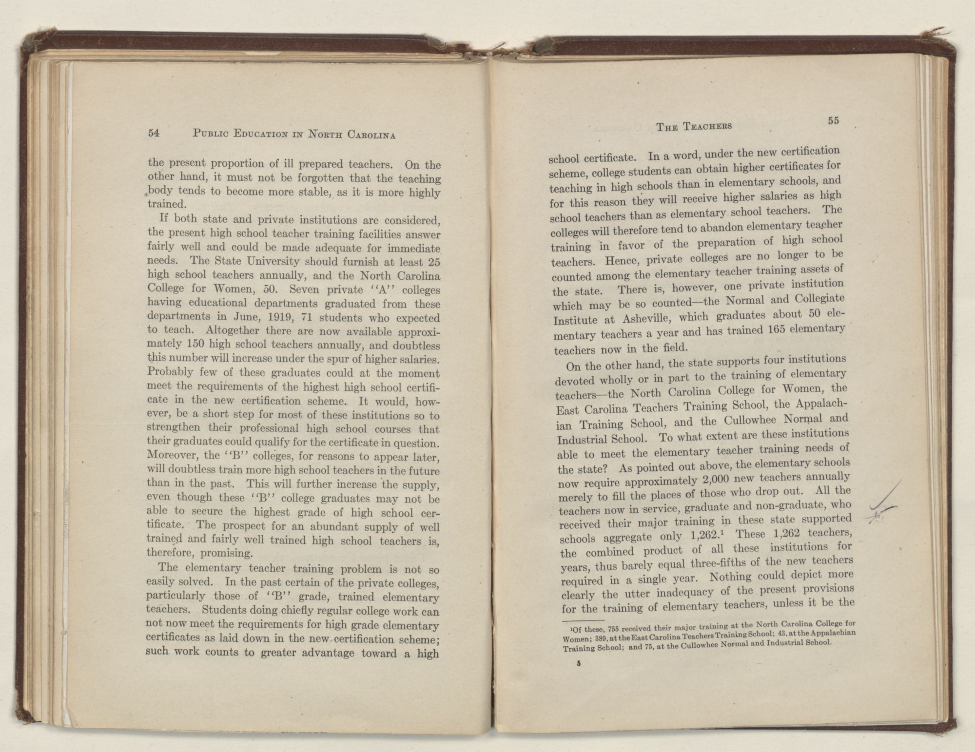 1In the corresponding period the enrollment of the white school population rose from 54 to 78 per cent, and the enrollment of the colored school population from 47 to 69 per cent.we cite the establishment of institutions for the training of teachers.1 The teacher is always the essential factor in a good school. Obvious as this would seem, the American people as a whole have never appreciated it. Following the common practice, we launched our public school system but made no provision for the training of teachers. Despite the repeated solicitations of educators for the establishment of teacher training schools, the state took no step in this direction until 1877, when a summer school for white teachers at the University and a state colored normal school at Fayetteville were established. From time to time thereafter additional summer schools were organized—four for colored and eight for white teachers. From these beginnings grew the present teacher training facilities of the state, which comprise, for white teachers, the school of education at the University, the North Carolina College for Women (established in 1891), the Cullowhee Normal and Industrial School (1893), the Appalachian Training School (1903), and the East Carolina Teachers’ Training School (1907). The state now supports three schools for colored teachers—the state colored normal schools at Fayetteville, Elizabeth City, and Winston-Salem—and for the training of Indian teachers the Cherokee Indian Normal School at Pembroke. Besides these institutions, the state has recently established teacher training departments in twelve high schools, and six or eight week summer schools in most of the counties.
