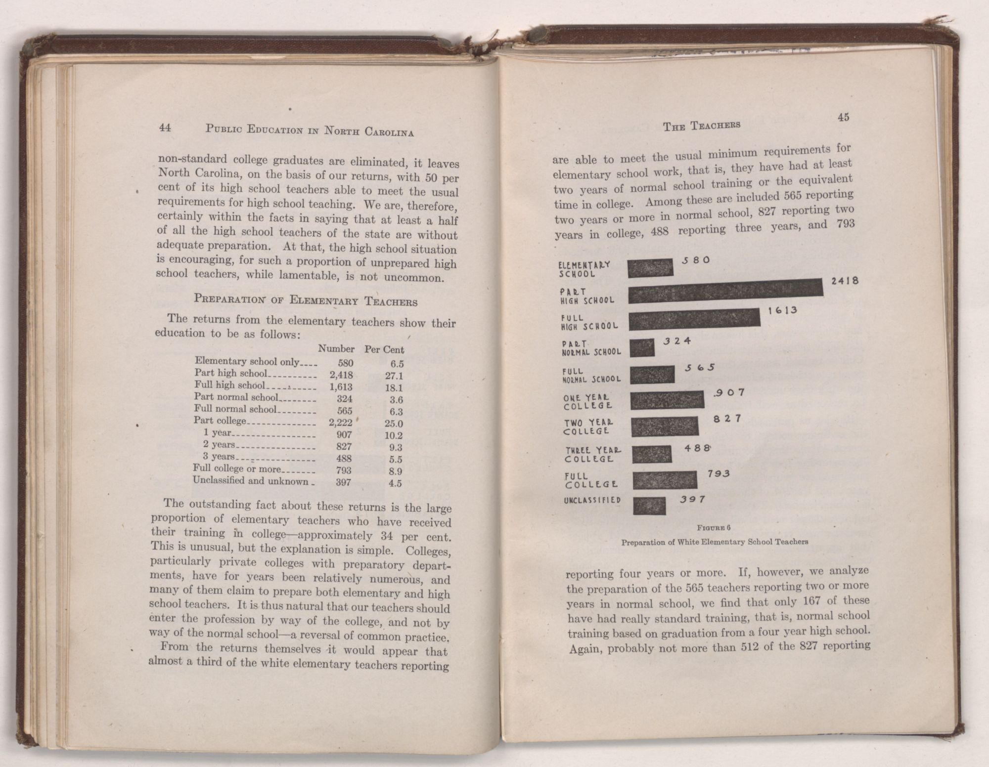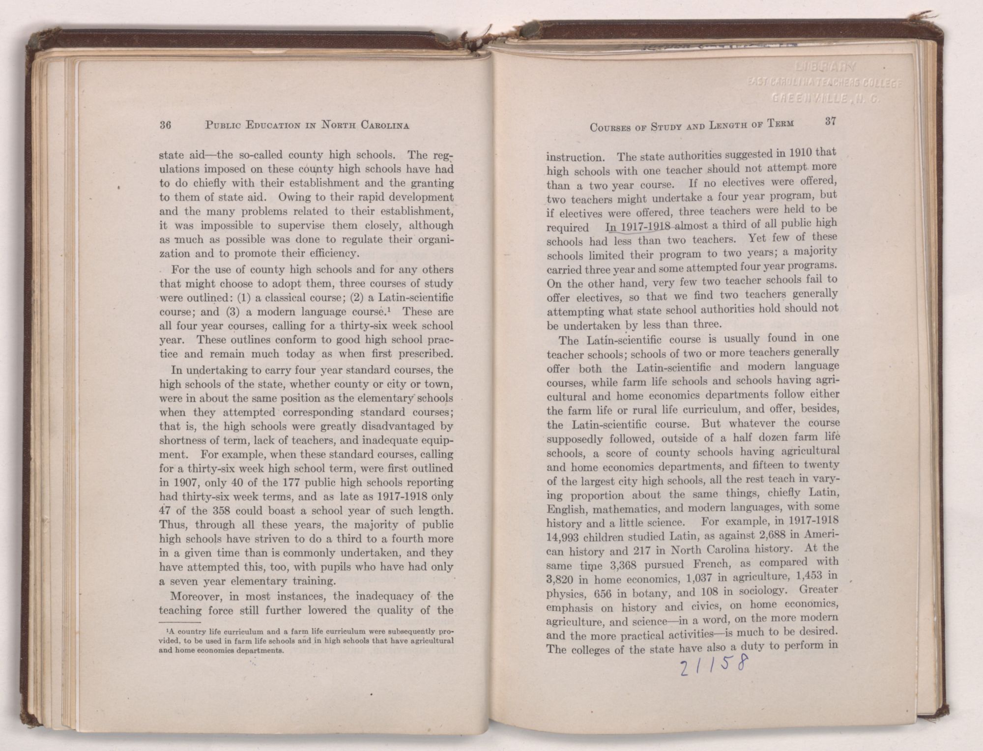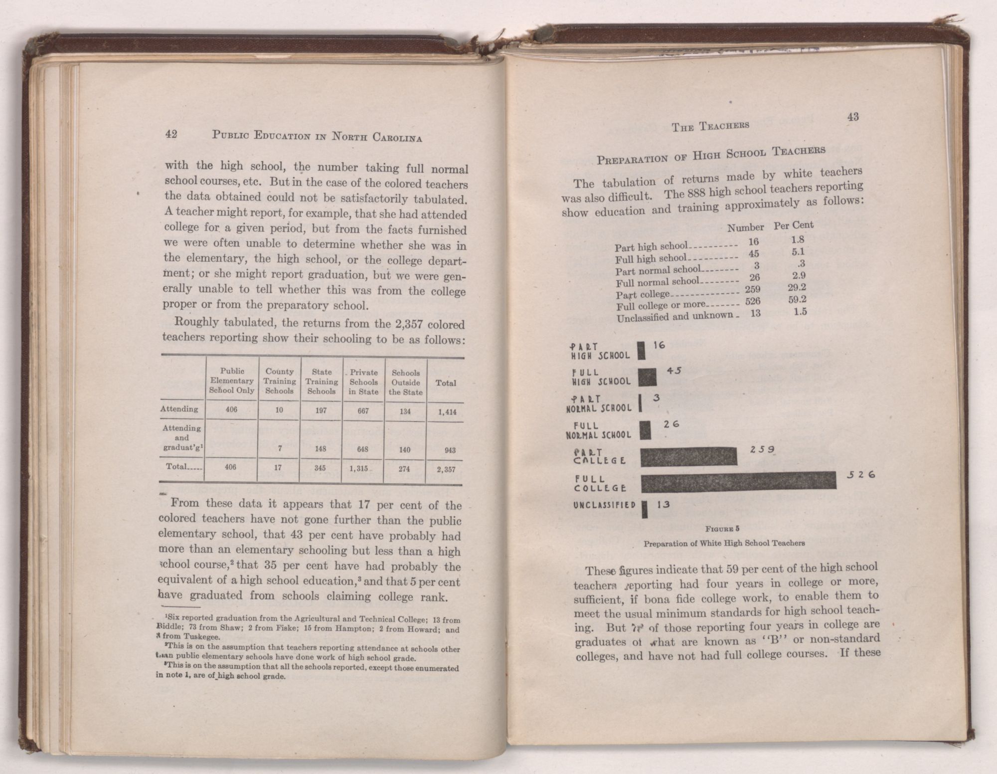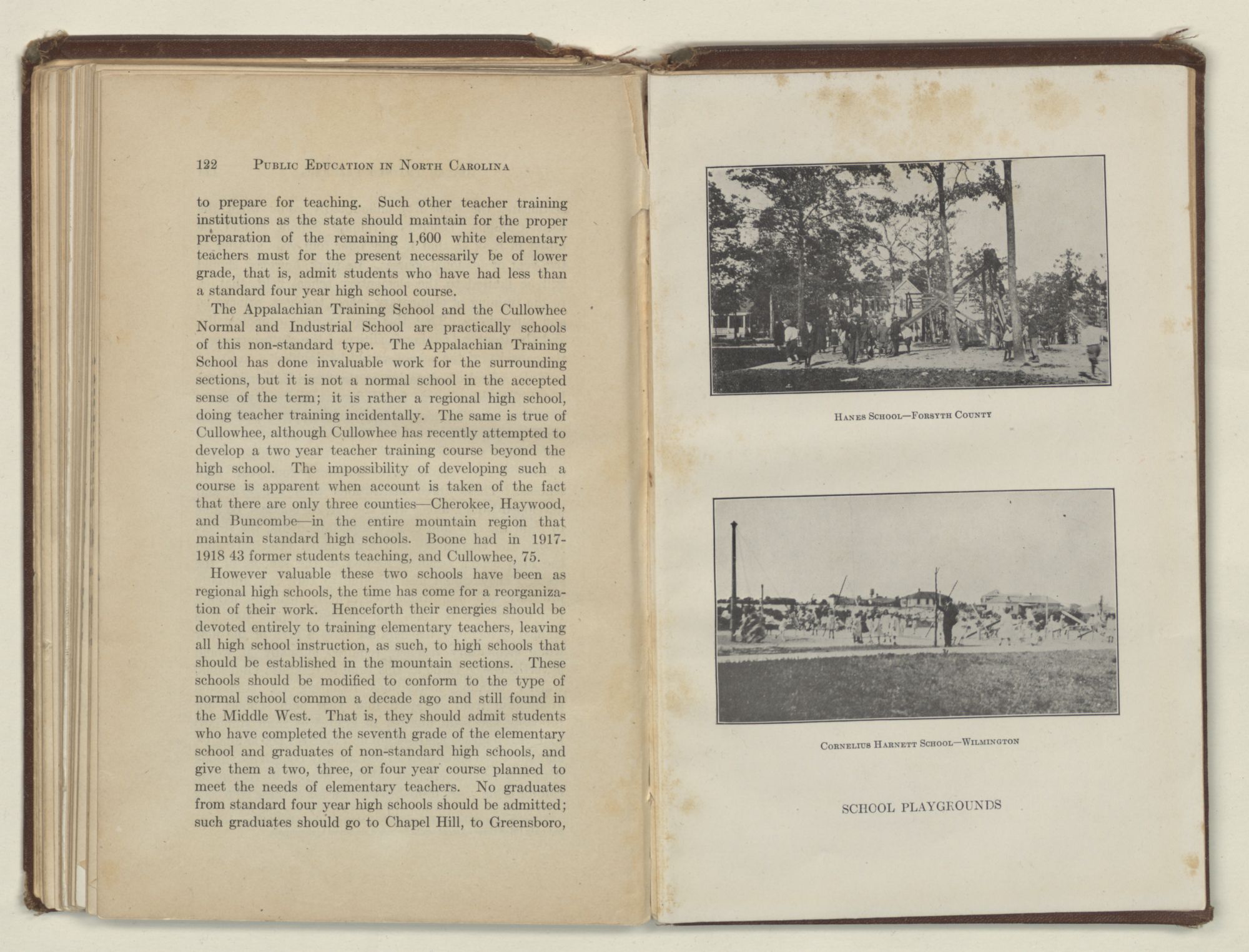 1In the corresponding period the enrollment of the white school population rose from 54 to 78 per cent, and the enrollment of the colored school population from 47 to 69 per cent.we cite the establishment of institutions for the training of teachers.1 The teacher is always the essential factor in a good school. Obvious as this would seem, the American people as a whole have never appreciated it. Following the common practice, we launched our public school system but made no provision for the training of teachers. Despite the repeated solicitations of educators for the establishment of teacher training schools, the state took no step in this direction until 1877, when a summer school for white teachers at the University and a state colored normal school at Fayetteville were established. From time to time thereafter additional summer schools were organized—four for colored and eight for white teachers. From these beginnings grew the present teacher training facilities of the state, which comprise, for white teachers, the school of education at the University, the North Carolina College for Women (established in 1891), the Cullowhee Normal and Industrial School (1893), the Appalachian Training School (1903), and the East Carolina Teachers’ Training School (1907). The state now supports three schools for colored teachers—the state colored normal schools at Fayetteville, Elizabeth City, and Winston-Salem—and for the training of Indian teachers the Cherokee Indian Normal School at Pembroke. Besides these institutions, the state has recently established teacher training departments in twelve high schools, and six or eight week summer schools in most of the counties.