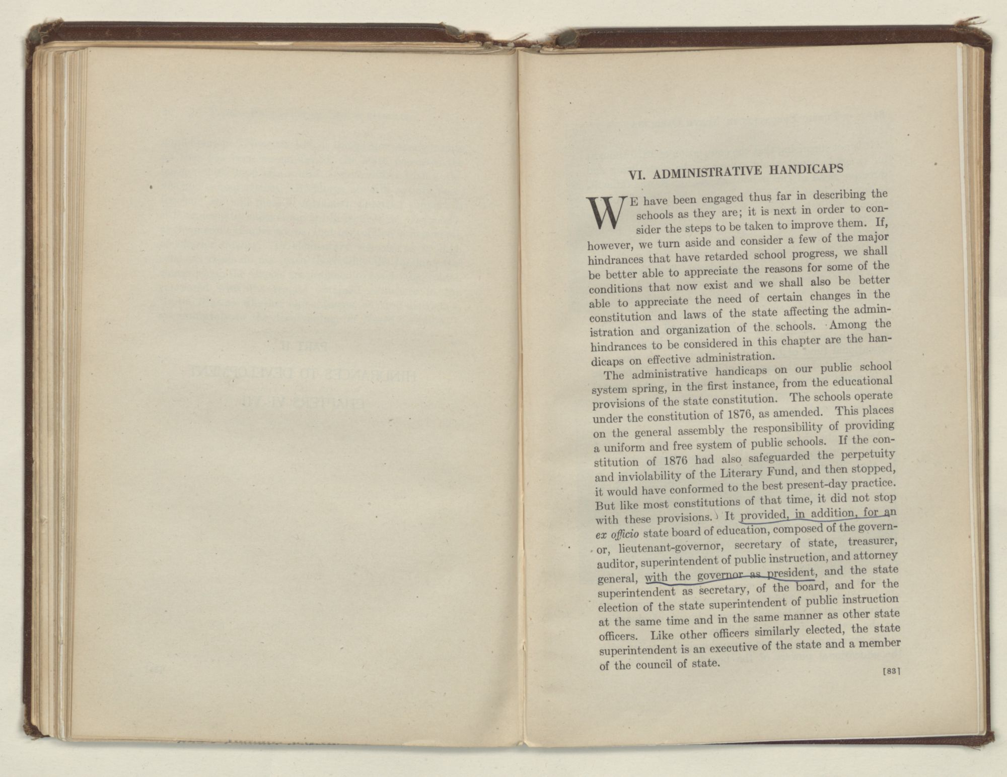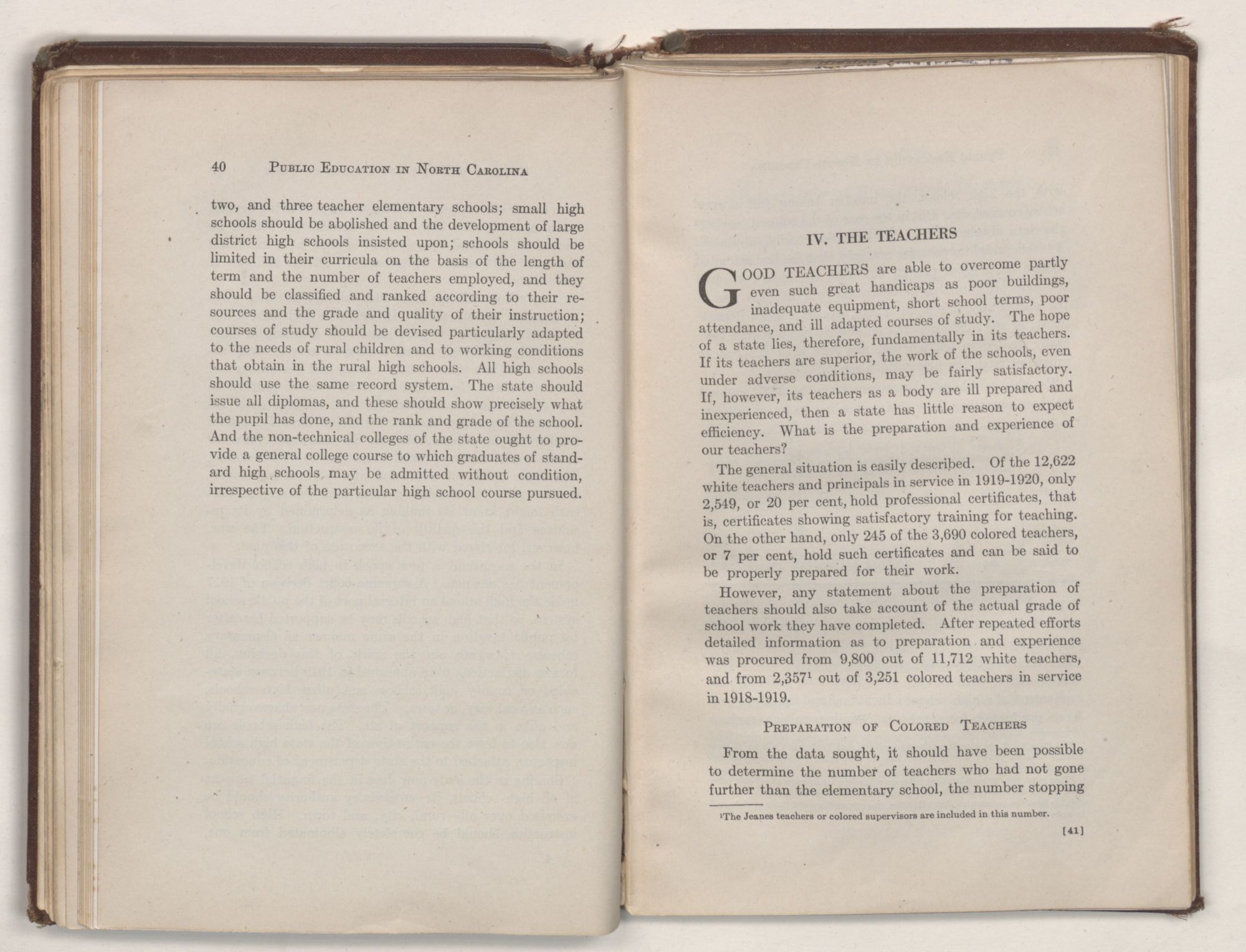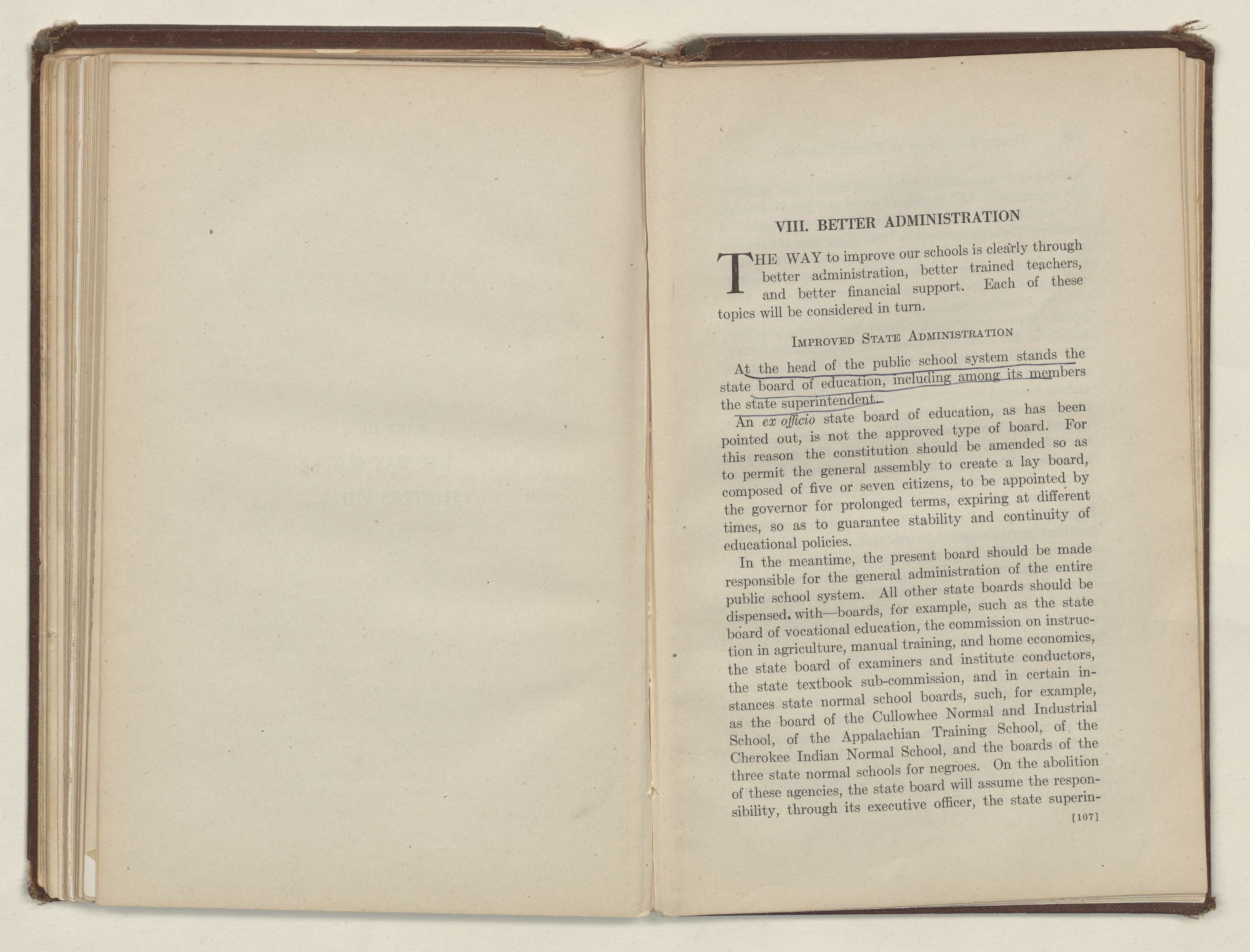 of our state. We are, therefore, submitting to you a report that contains what we believe to be the facts about our public school system, and on the basis of these, and the best judgment of teachers and citizens, we have worked out recommendations that we believe will give North Carolina the best school system possible at this time. We have always been mindful of existing conditions, and conscious of the fact that, if we wish to do the best possible for our children, we must start with our public school system where it is and advance it by stages to what it should be. Your commission has therefore not prepared an ideal or utopian scheme, but rather a code which preserves the good in our present educational scheme, strengthens the weak places, and which will facilitate future progress, to the end that all children of the state may enjoy the educational opportunities that the state is now able to furnish.